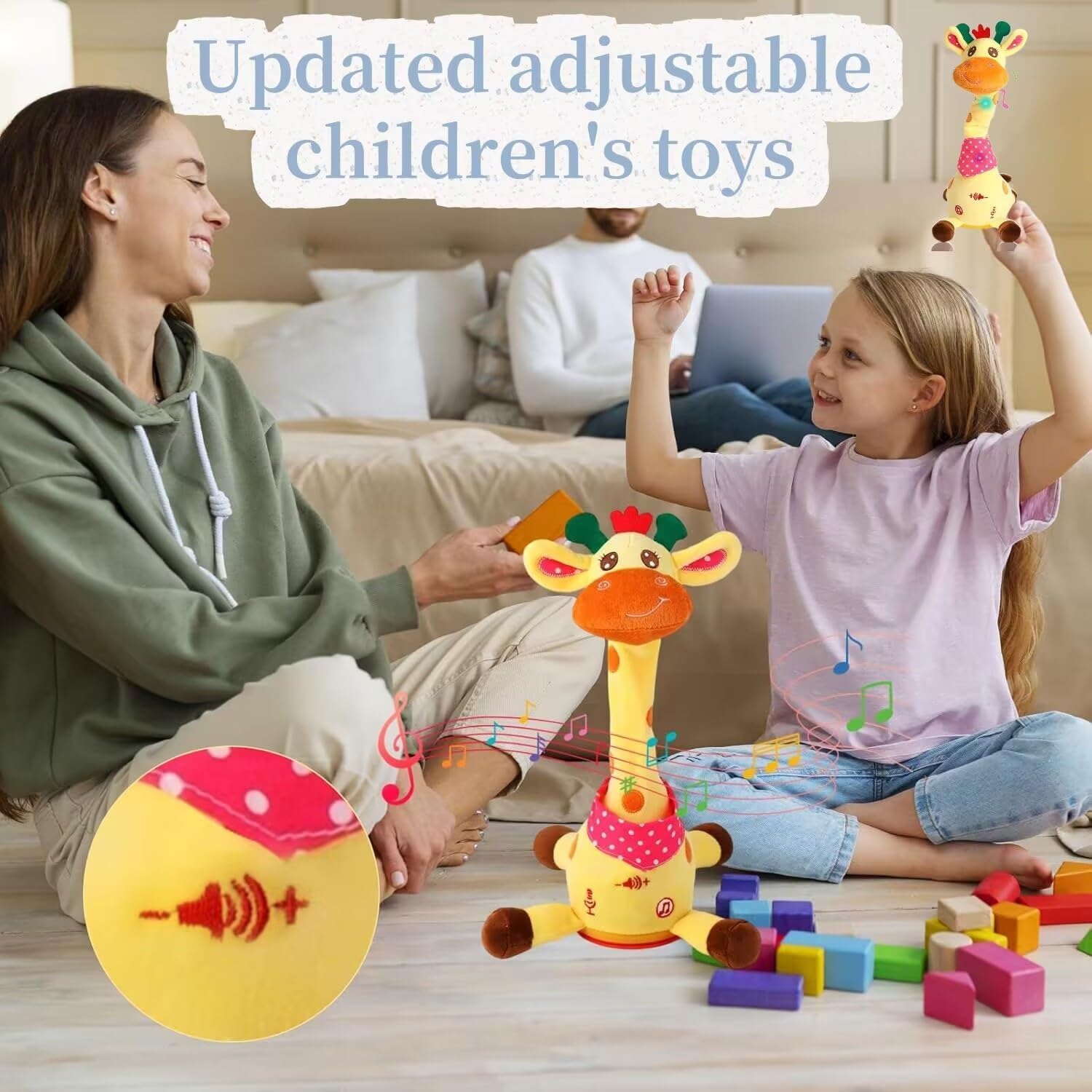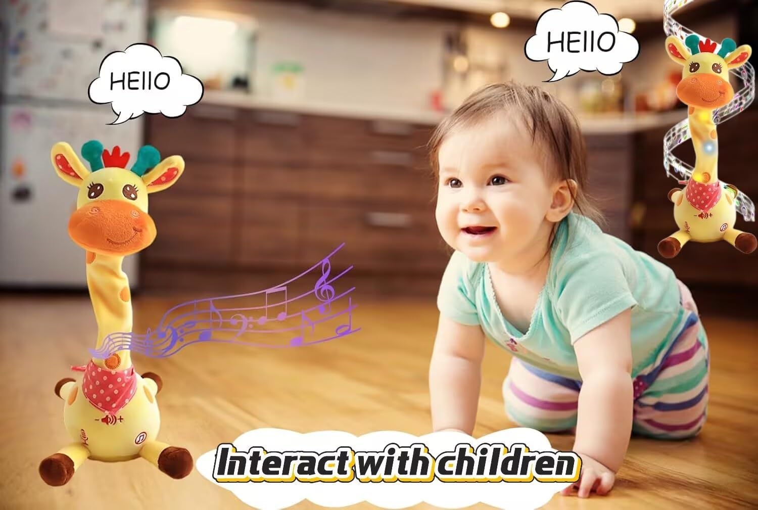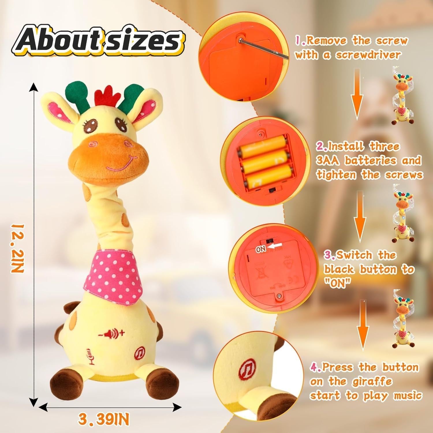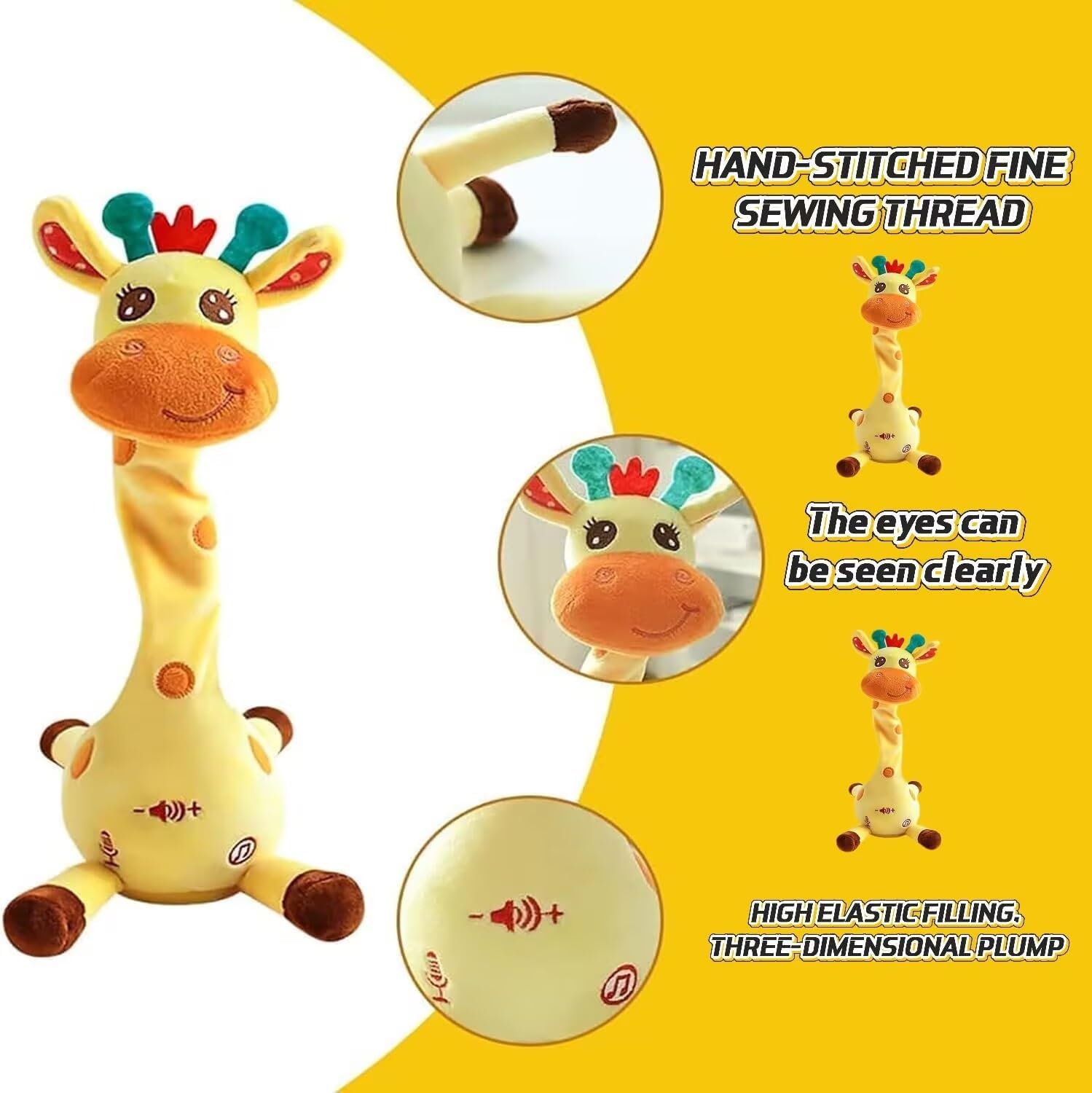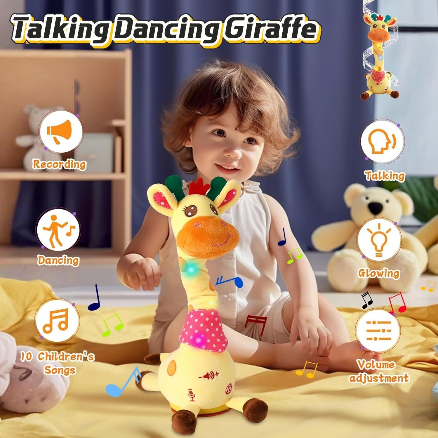 Adorabile giraffa danzante interattiva: questo giocattolo a forma di giraffa, adatto alla pancia, è dotato di regolazione del volume, funzioni di ballo, conversazione, ripetizione, registrazione e illuminazione. La sua adorabile espressione, il tessuto colorato e le luci a LED invogliano il bambino a gattonare e lo incoraggiano ad alzare la testa. Registra e ripete le tue parole, incoraggiando i bambini a parlare ed esprimere le emozioni. Canta 10 filastrocche, creando un'atmosfera vivace for il divertimento in famiglia. Registrazione ripetuta: questo giocattolo interattivo a forma di giraffa registra le tue parole e le riproduce con suoni divertenti, rendendo più divertenti le interazioni tra genitori e figli e incoraggiando i bambini a imitare e imparare attraverso il gioco. Volume regolabile: questo giocattolo musicale a forma di giraffa è dotato di una funzione di regolazione del volume, che consente di impostare diversi livelli di volume in base alle proprie esigenze. Materiale morbido e sicuro for i bambini: realizzata in morbido peluche di alta qualità, questa giraffa è delicata sulla pelle e completamente sicura for i bambini. Il design soffice e adorabile offre una sensazione di calore e intimità, rendendola una compagna ideale for la nanna. Una giraffa di peluche for la persona amata: questo giocattolo interattivo a forma di giraffa offre divertenti funzioni interattive. La sua funzione di imitazione vocale può ripetere automaticamente le tue parole, stimolare l'interesse for il canto e la parola e coltivare il senso del ritmo. Premi a lungo il pulsante di registrazione for registrare una benedizione e inviarla come regalo a parenti e amici, rendendo sicuramente felice il destinatario.