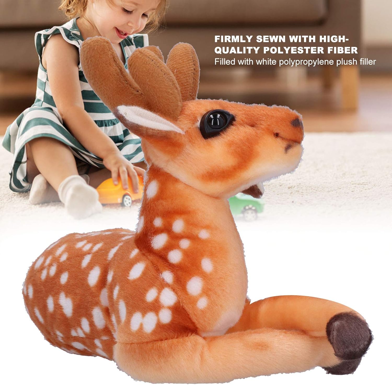 Cucito saldamente con fibra di poliestere di alta qualità e riempito con imbottitura in peluche in polipropilene bianco. La testa del peluche è dotata di una schiuma rigida ultraleggera a forma di viso che gli conferisce un aspetto uniforme e realistico. Crea un'atmosfera tranquilla e accogliente nel tuo giardino e nella tua casa e crea un'atmosfera romantica e festosa. Può portare felicità e atmosfera di vacanza ed è il miglior Natale. Questo peluche di cervo Sika può essere ampiamente utilizzato nella produzione di paesaggi, giardini, centri commerciali, decorazione di aree paesaggistiche e decorazioni.