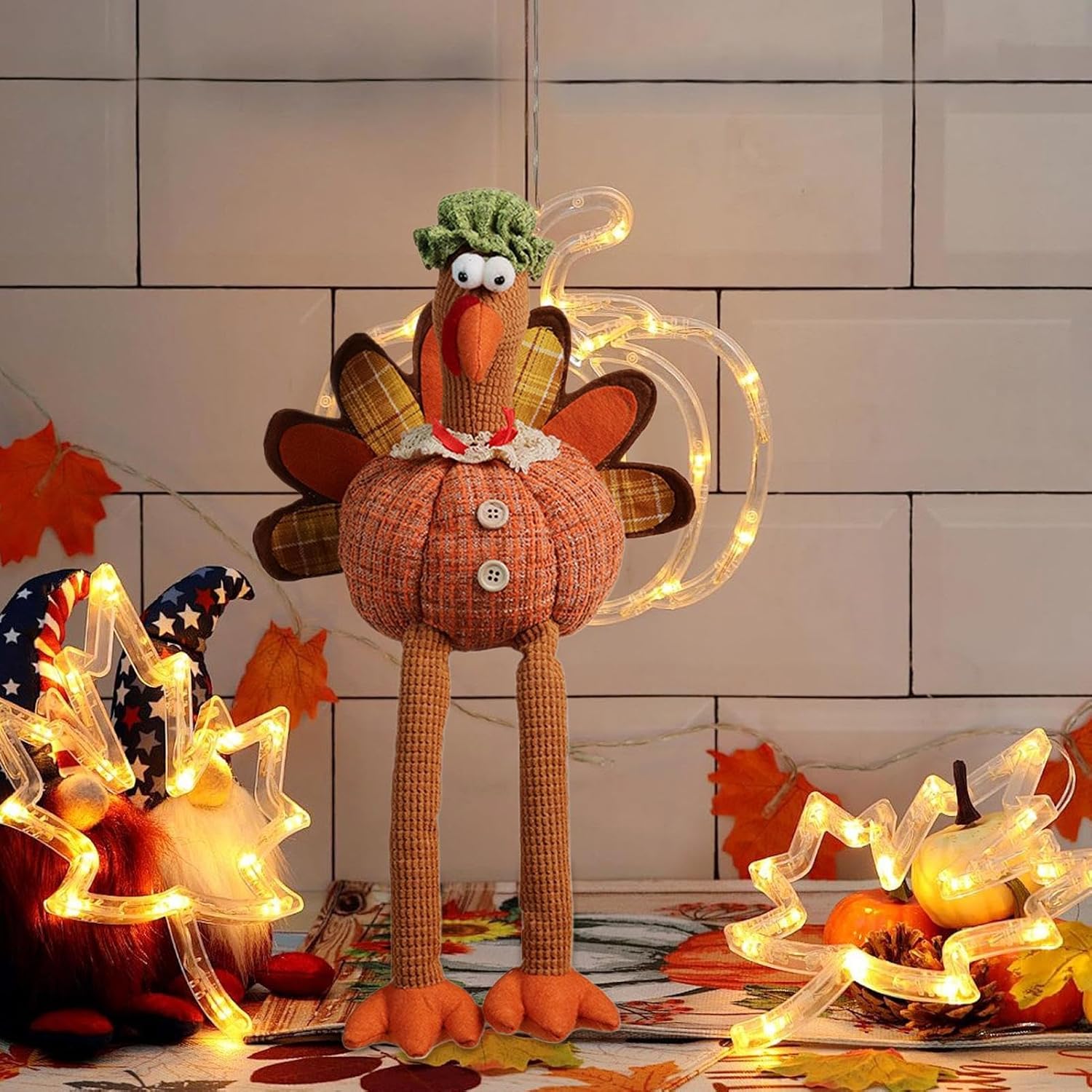 Miglioramento decorativo: il tacchino del Ringraziamento incorpora delicati dettagli accessori e una perfetta lavorazione artigianale, creando un accogliente pezzo autunnale che arricchisce l'arredamento dell'ufficio promuovendo al tempo stesso una calda atmosfera vacanziera all'interno. Accento turchese festivo: grazie alla sua seduta, questo tacchino ripieno può essere posizionato con versatilità su scaffali, tavoli o mensole. Realizzato in morbido poliestere, aggiunge un tocco caldo e affascinante al tuo arredamento autunnale o festivo per celebrazioni speciali. Molteplici funzioni: progettato per una varietà di occasioni, questo peluche di tacchino funge sia da pezzo decorativo funzionale che da deliziosa opzione regalo, adattandosi perfettamente a design a più livelli o display indipendenti, arricchendo le celebrazioni con il suo fascino senza tempo in tutte le stagioni. Fonte: progettato per evocare ricordi, questo peluche di tacchino offre una presentazione commovente che arricchisce le interazioni giocose con la famiglia o i colleghi, assicurando che ogni momento di donazione diventi memorabile e accattivante con il suo design affettuoso e il suo fascino Notevole accento festivo: con il suo elegante abito autunnale e i dettagli raffinati del personaggio, questo peluche di tacchino funge sia da decorazione attraente che da delizioso oggetto da collezione, perfetto per illuminare le serate autunnali o celebrare occasioni speciali come il Ringraziamento