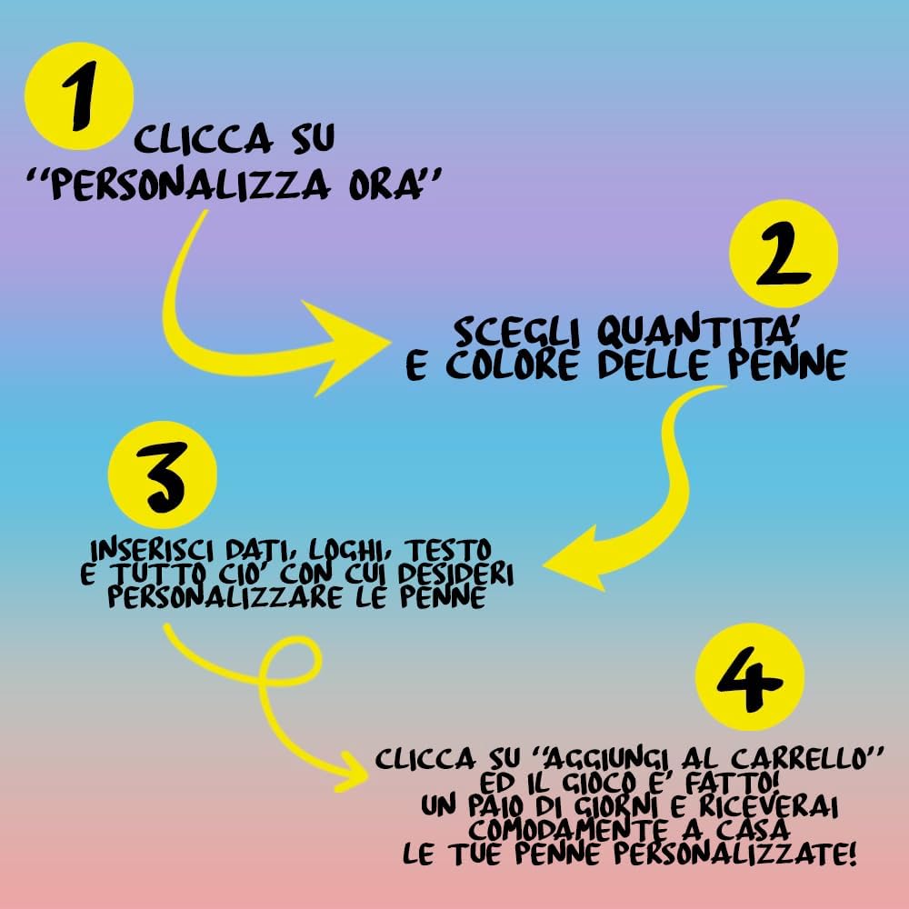 Penna sfera a scatto in plastica a forma di Siringa. Fusto trasparente Personalizzato e inchiostro colorato . Refill nero. Clicca su "Personalizza" ed inserisci tutti i dati con cui personalizzare il tuo ordine (Quantità,Colore Penne, Frasi/Nomi/logo con cui personalizzare la penna). E' possibile lasciare in bianco tutti i dati per la personalizzazione per ricevere le penne senza stampa! Colori Impugnatura penne disponibili: Bianco, Blu, Rosso, Verde. Le Nostre Penne Personalizzate sono adatte ad ogni evenienza: come idee regalo per cerimonie,battesimi, compleanni, comunioni oppure come gadget aziendali pubblicitari, natalizi, di fine anno, per fiere e/o clienti. Spedizione Veloce e Tracciata con assitenza dedicata disponibile H24 - La soddisfazione del cliente viene per noi prima di ogni cosa: per qualsiasi evenienza,dubbio, problema etc. non esitare a contattarci