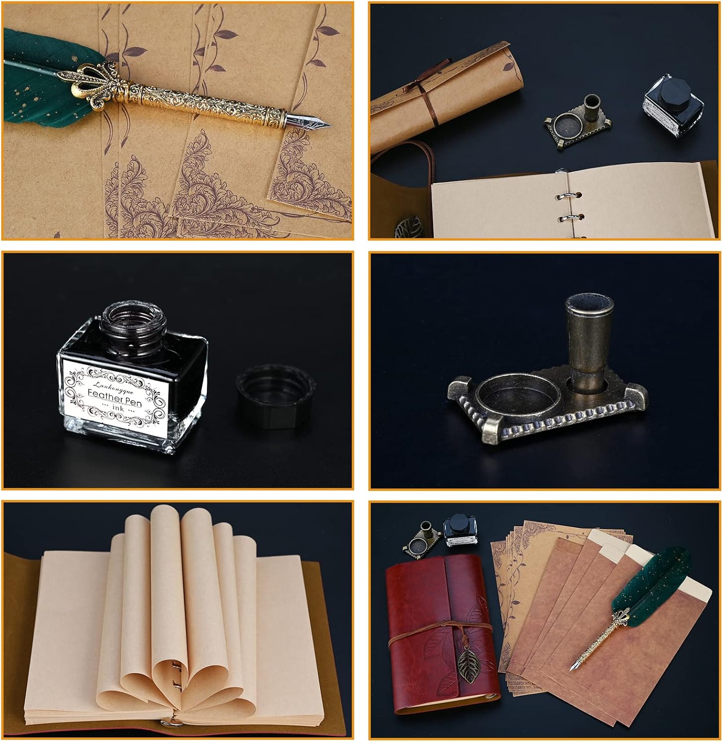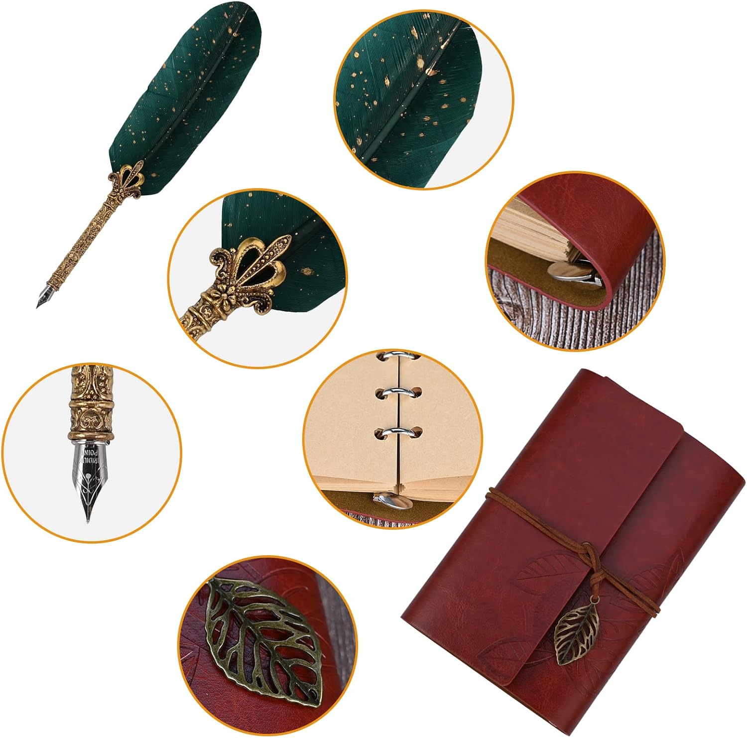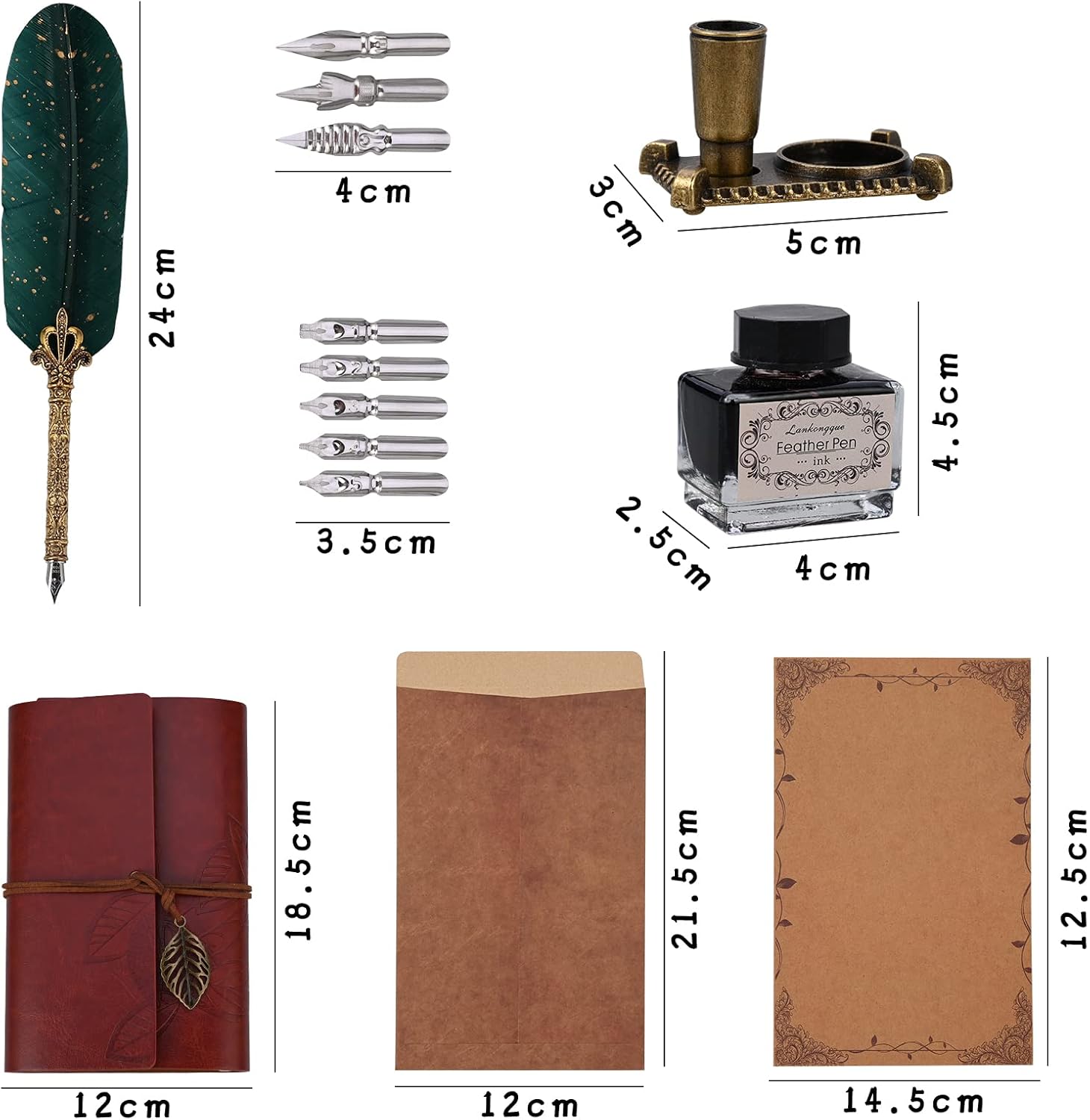 Set di inchiostro e pennello: include penna calligrafica con 8 pennini di ricambio, 1 inchiostro e 1 portapenne, 8 fogli di carta da scrittura e 4 buste, e taccuino in pelle. Sono forniti in una classica ed elegante confezione regalo nera Design elegante vintage: realizzata in lega di alta qualità e piume naturali, la penna a piuma presenta un vecchio design classico inciso. Le piume verdi sono impreziosite da polvere d'oro lucida per un look vintage e ornato 8 tipi di pennini: diverse dimensioni di punte in lega di alto materiale possono scrivere caratteri di diverso spessore. Una varietà di combinazioni di pennini per soddisfare diversi tipi di esigenze di scrittura, può essere utilizzata per un lungo periodo di tempo. Inoltre viene fornito con una piccola bottiglia di inchiostro, comodo per scrivere in qualsiasi momento Scrittura benedizioni: il taccuino in vera pelle presenta un esterno rosso mattone con stampa unica di foglie e foglie metalliche. La carta intestata marrone vintage e le buste con motivi geometrici possono essere utilizzate per scrivere auguri a persone care, familiari e amici Squisita confezione regalo: scatola squisita ed elegante con pelle testurizzata nera con motivo dorato sullo strato esterno è una scelta perfetta per gli amanti degli oggetti vintage