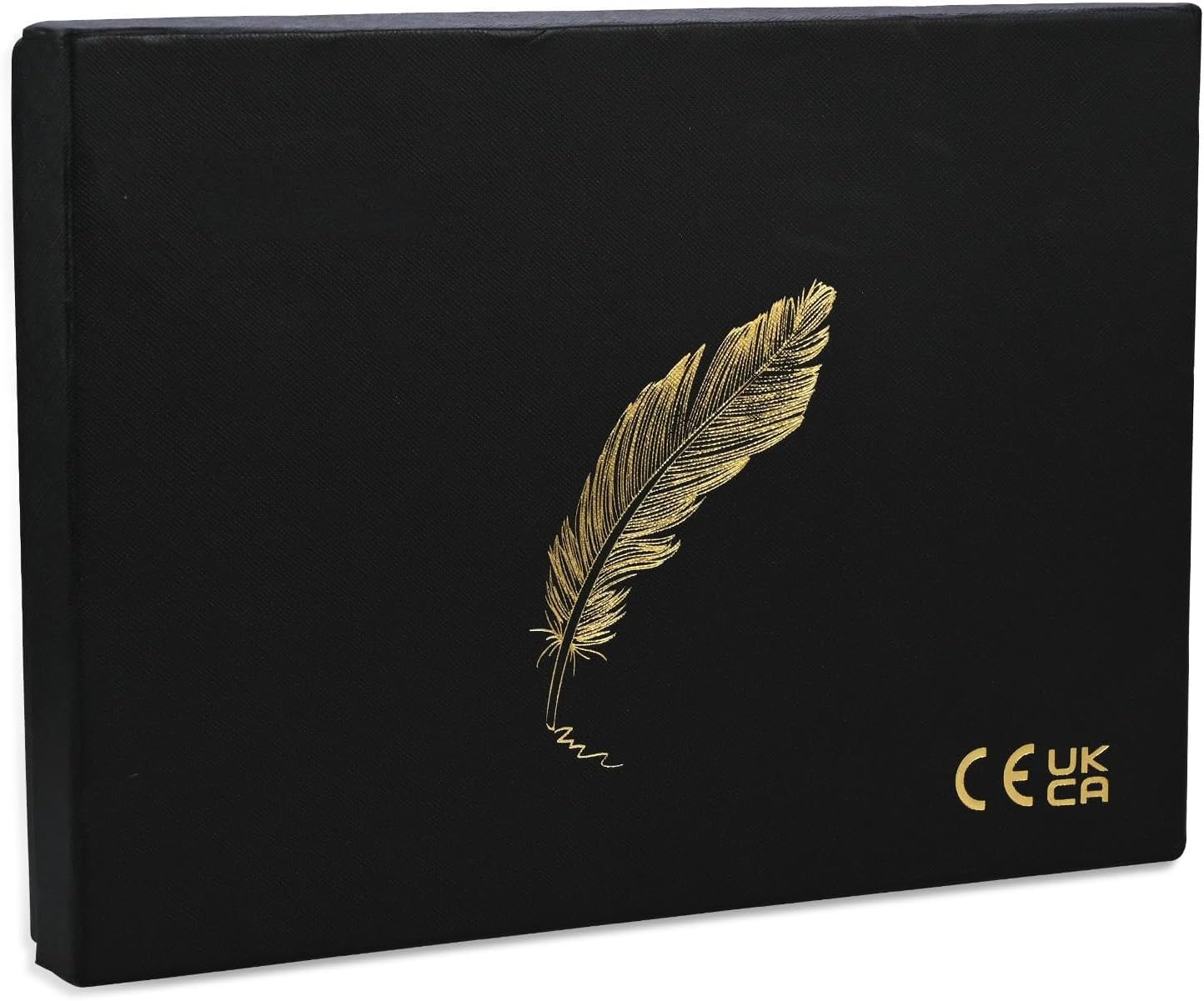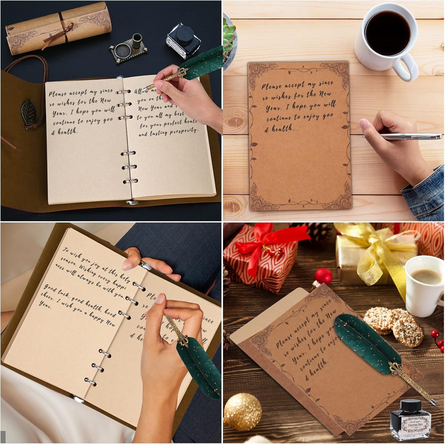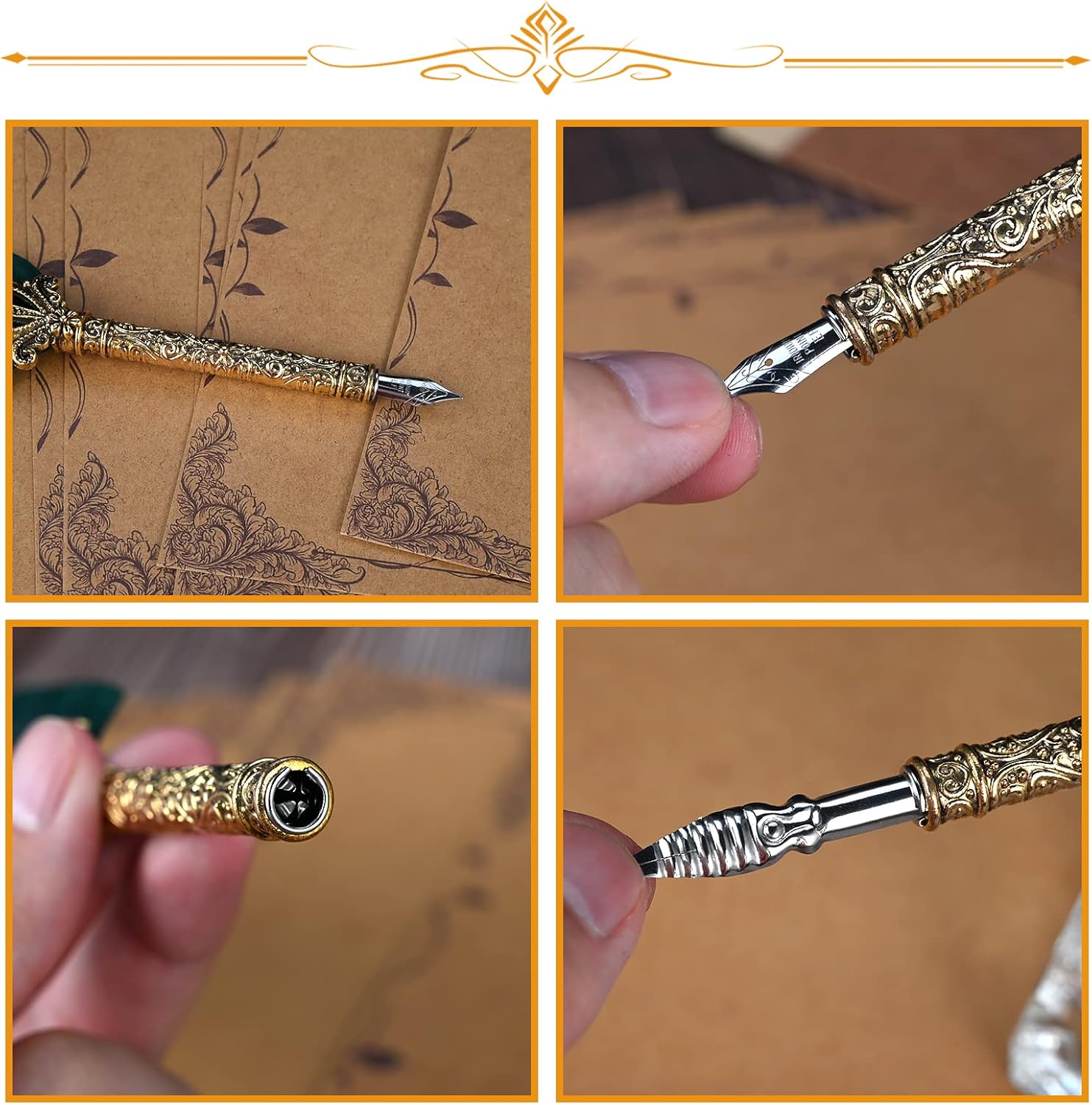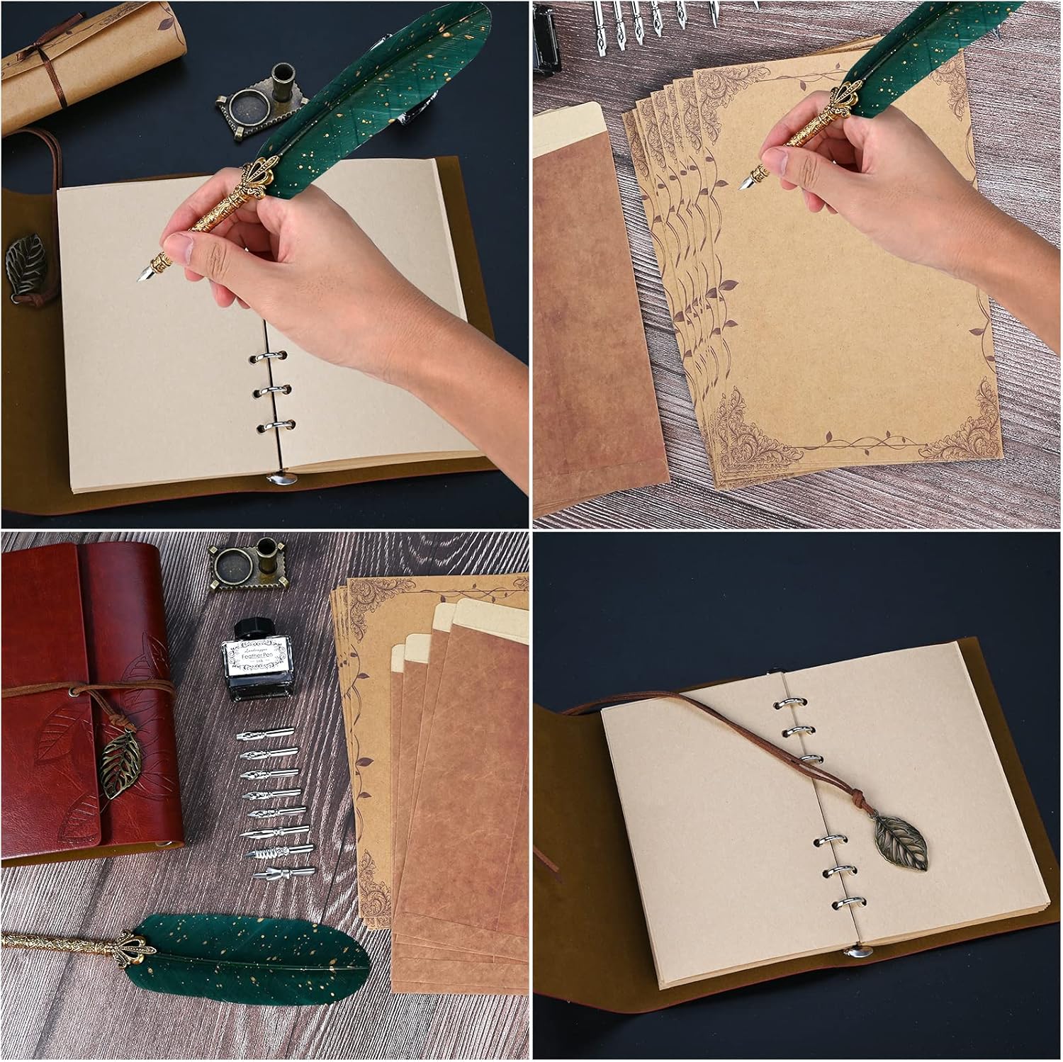 Set di inchiostro e pennello: include penna calligrafica con 8 pennini di ricambio, 1 inchiostro e 1 portapenne, 8 fogli di carta da scrittura e 4 buste, e taccuino in pelle. Sono forniti in una classica ed elegante confezione regalo nera Design elegante vintage: realizzata in lega di alta qualità e piume naturali, la penna a piuma presenta un vecchio design classico inciso. Le piume verdi sono impreziosite da polvere d'oro lucida per un look vintage e ornato 8 tipi di pennini: diverse dimensioni di punte in lega di alto materiale possono scrivere caratteri di diverso spessore. Una varietà di combinazioni di pennini per soddisfare diversi tipi di esigenze di scrittura, può essere utilizzata per un lungo periodo di tempo. Inoltre viene fornito con una piccola bottiglia di inchiostro, comodo per scrivere in qualsiasi momento Scrittura benedizioni: il taccuino in vera pelle presenta un esterno rosso mattone con stampa unica di foglie e foglie metalliche. La carta intestata marrone vintage e le buste con motivi geometrici possono essere utilizzate per scrivere auguri a persone care, familiari e amici Squisita confezione regalo: scatola squisita ed elegante con pelle testurizzata nera con motivo dorato sullo strato esterno è una scelta perfetta per gli amanti degli oggetti vintage