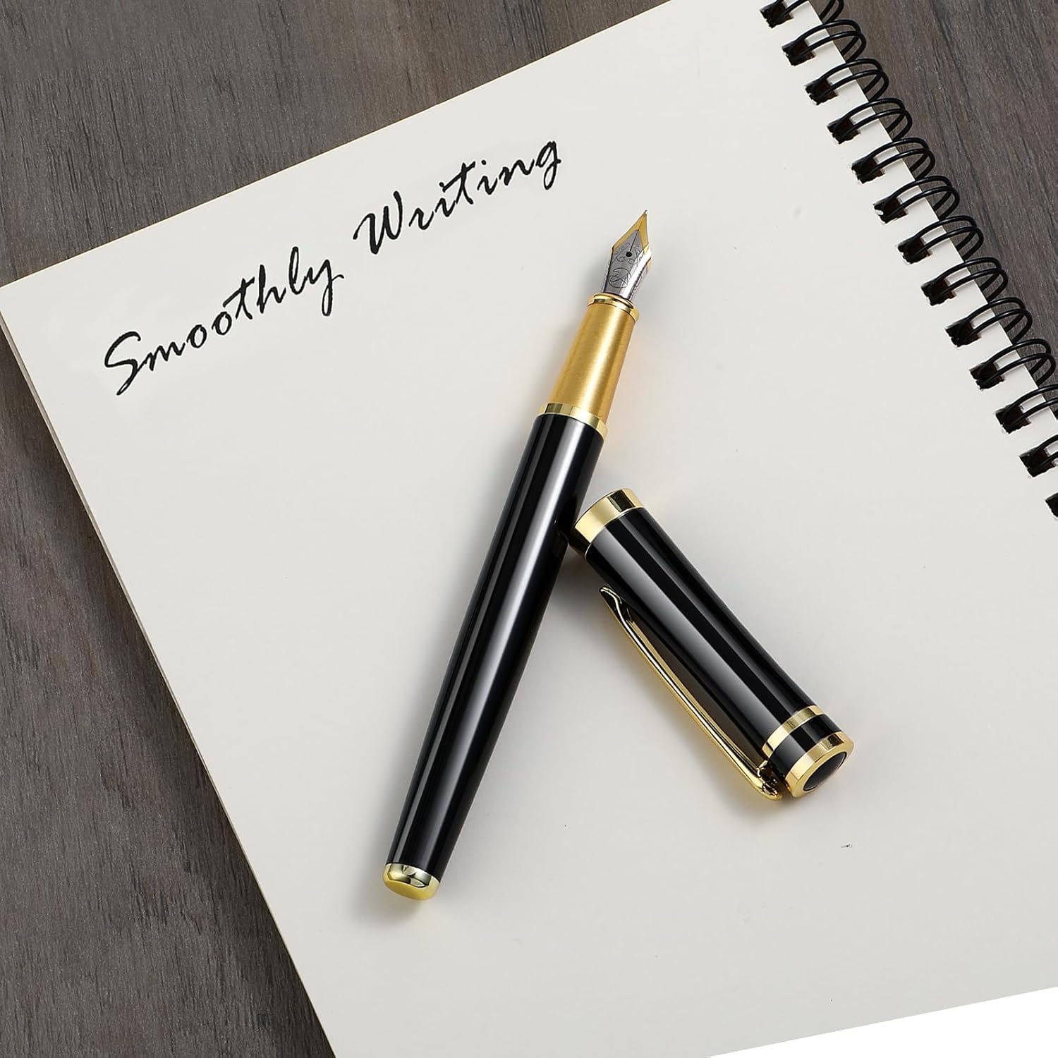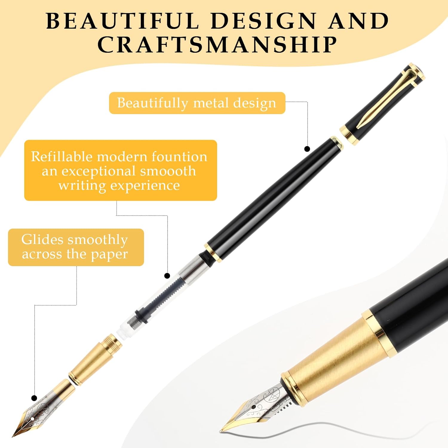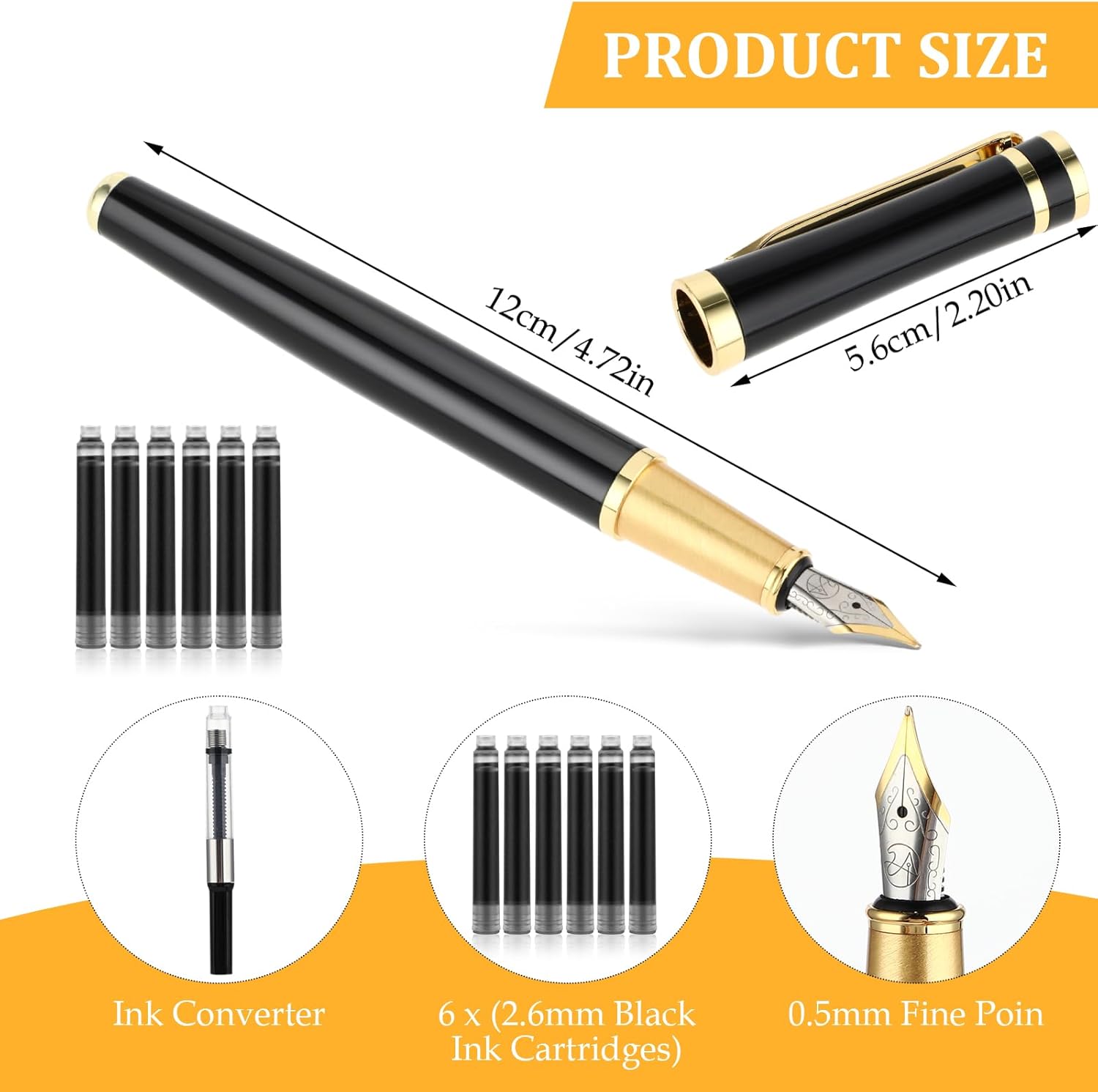Accessori completi: la confezione include 1 penna stilografica, 1 convertitore e 6 cartucce d'inchiostro nere (3,4 mm di diametro), in modo da avere abbastanza inchiostro per scrivere e non è necessario effettuare ulteriori acquisti. Esperienza di scrittura delicata: questa penna stilografica offre un'esperienza di scrittura di prima classe, la penna scorre delicatamente e fluentemente sulla carta, sia che tu stia scrivendo velocemente o lentamente, mantenendo la coerenza e il comfort di scrittura, aggiungendo eleganza a qualsiasi parola. Materiale di alta qualità: il corpo della penna stilografica è realizzato in metallo, resistente e durevole, ed è dotato di una molla in iridio e di una clip galvanizzata che possono mantenere la sua lucentezza e l'aspetto elegante per lungo tempo. Facile da sostituire: le cartucce di inchiostro misurano 5 x 0,65 cm (1,96 x 0,25 pollici, 3,4 mm di diametro), la sostituzione è semplice e veloce, in modo da poter continuare a scrivere in modo fluido. Regalo ideale: la custodia nera lucida e la clip dorata conferiscono alla penna stilografica un aspetto elegante ed elegante, che la rende perfetta per uso personale o come regalo.