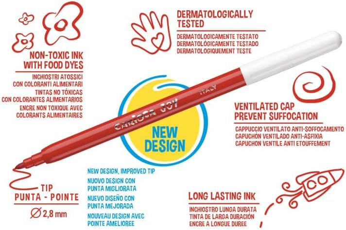 Il pennarello Classic della linea Carioca con punta fine per un tratto preciso. Inchiostro superlavabile atossico, facile da lavare via dalla pelle con acqua senza sapone, ideale per scuole e scuole