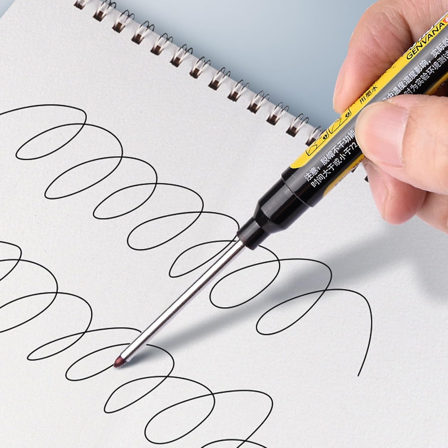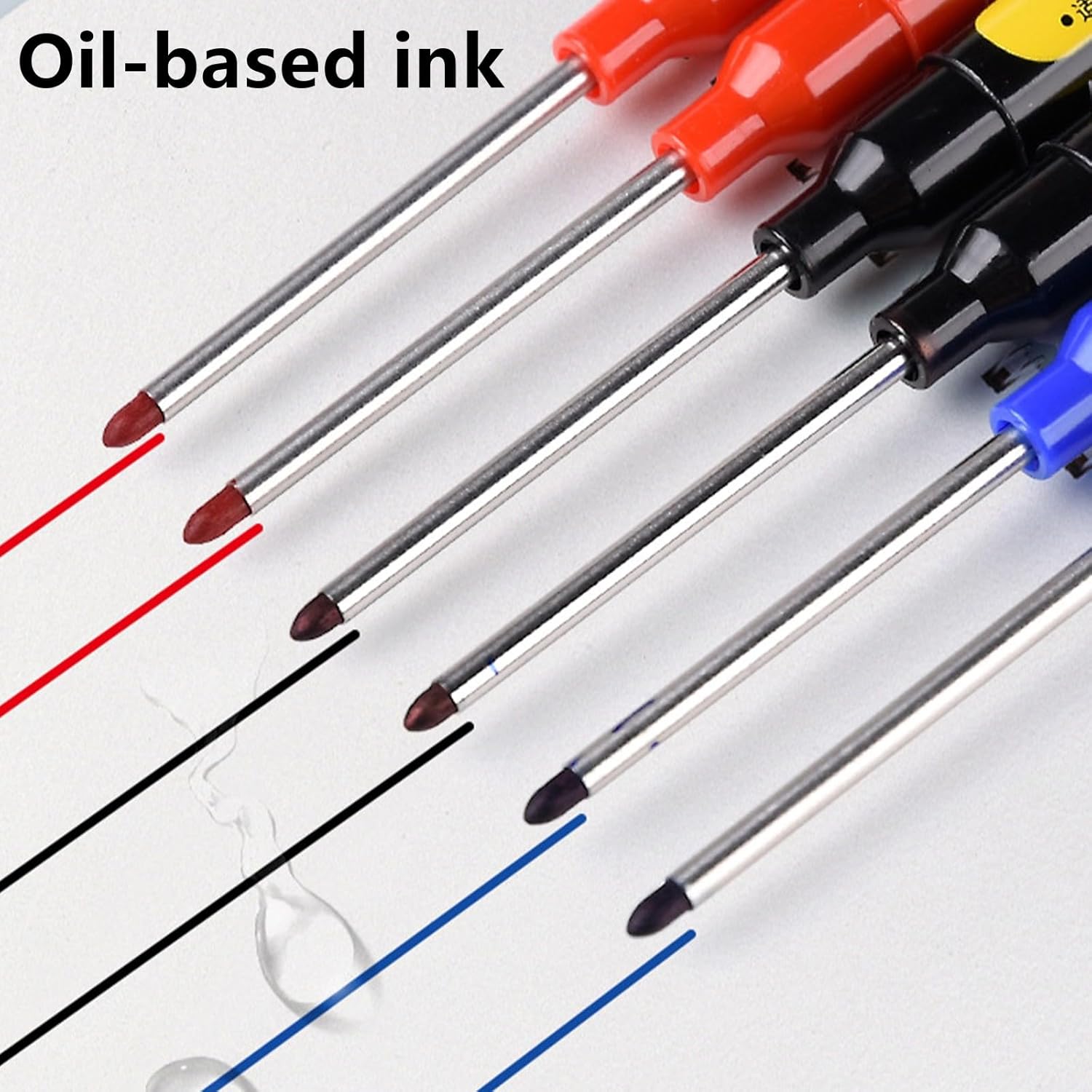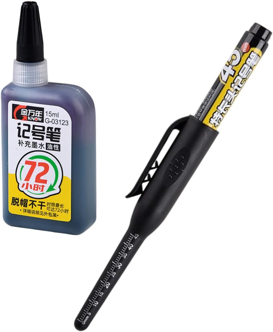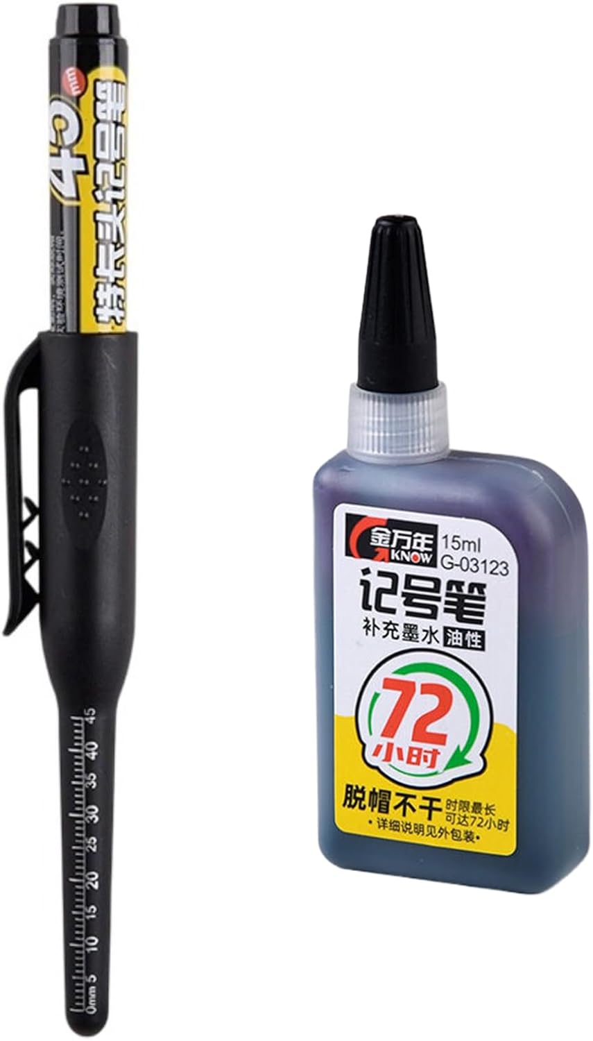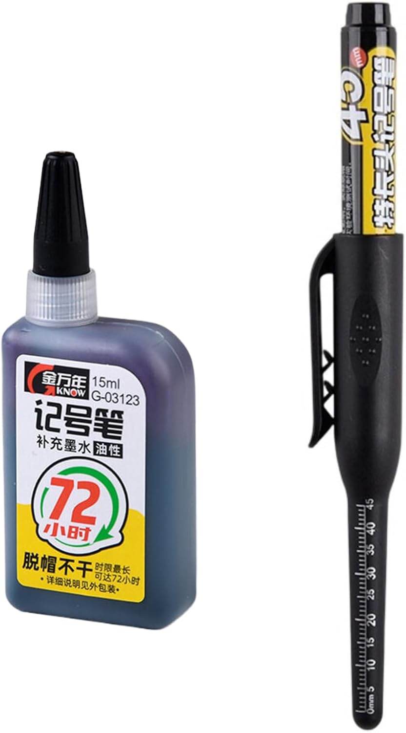 marcatore per costruzioni a testa lunga è adatto per contrassegnare posizioni e decorazioni mobili, lavorazione dei metalli, industria della lavorazione del legno, industria del vetro, lavorazione del legno, industria automobilistica Questo pennarello a punta lunga funziona perfettamente metallo, vetro, legno, carta, pelle e acrilici. Molto adatto a costruttori professionisti, falegnami e appassionati Realizzato in PP, resistente all'acqua, asciugatura rapida, comodo da impugnare, punta lunga e rotonda, facile accesso. La punta lunga scalata del pennarello a punta lunga è comoda per segnare con precisione la profondità necessaria Confezione Pennarello a naso lungo da 1 pezzo, pennarello da carpentiere a punta lunga ricaricabile, in grado soddisfare l'uso quotidiano e le esigenze sostituzione Questi marcatori a punta lunga sono lunghi 154 mm (6,06 pollici), con punta lunga 45 mm, che possono essere utilizzati per contrassegnare fori profondi ovunque difficile da raggiungere, offrendo falegname maggiore comodità