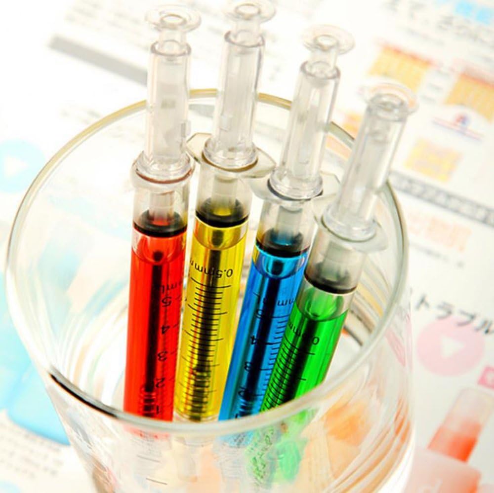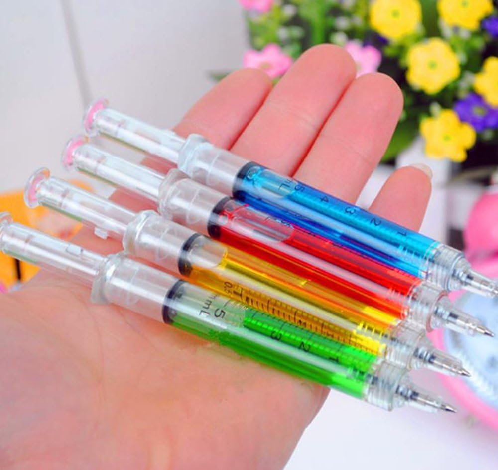 Penne a siringa con ago finto da 10 pezzi. Ci sono 4 colori disponibili. Rosso, giallo, blu, verde La penna per siringa misura 13 cm, confezione da 10. Favori favolosi per le feste, aiuta ad aggiungere più divertimento ed eccitazione alla festa, i bambini adoreranno questi e anche gli adulti. Sicuro e facile da usare con una sola spinta della parte superiore. Questa penna a forma di siringa renderà la tua scrittura più eccitante di una penna a inchiostro normale, la penna verrà scritta in nero o con inchiostro blu. Ottimo per scrivere memo, note e molti altri. L'accessorio perfetto per medico, infermiere, chirurgo, scienziato o chiunque abbia un oscuro senso dell'umorismo.