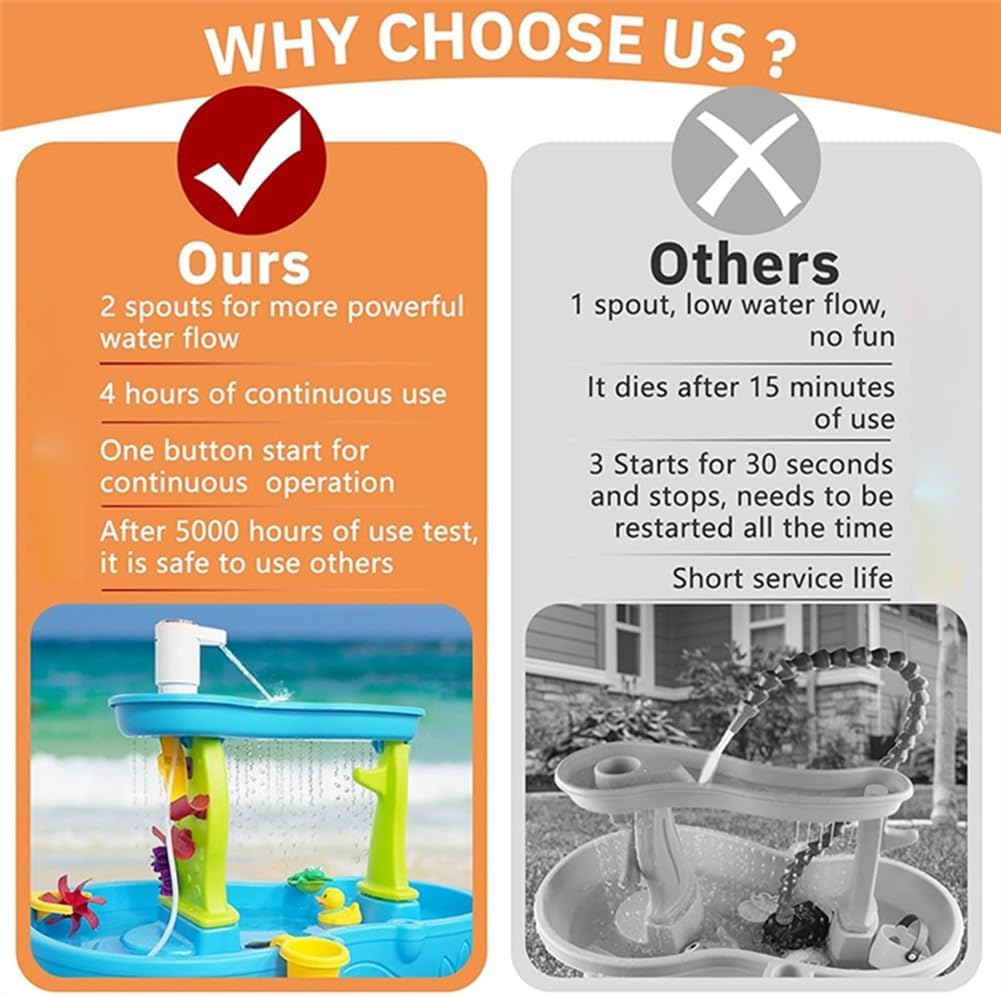 [Pompa portatile fili per tavolo ad acqua] La nostra pompa per tavolo ad acqua funziona in modalità wireless per garantire sicurezza e portabilità. Fornisce una circolazione continua 'acqua al tavolo ad acqua, stimolando la curiosità dei bambini a esplorare e imparare attraverso il gioco con l'acqua. Le nostre pompe da tavolo [compatte] offrono un'esperienza acquatica divertente, coinvolgente ed educativa. Funzioni interattive come pompe d'acqua e vasche di scoperta aiutano i bambini a sviluppare competenze chiave, tra cui la coordinazione occhio-mano e la risoluzione dei problemi. [Batteria a lunga durata] Le nostre pompe sono alimentate a batteria e durano dalle 4 alle 6 ore con una carica . Funzione di rilevamento automatico della temperatura integrata e raffreddamento automatico, per garantire un utilizzo sicuro. [Due motori] La nostra pompa per acqua è dotata di due motori funzionanti, con due piccoli beccucci, due motori faranno funzionare la pompa più a lungo