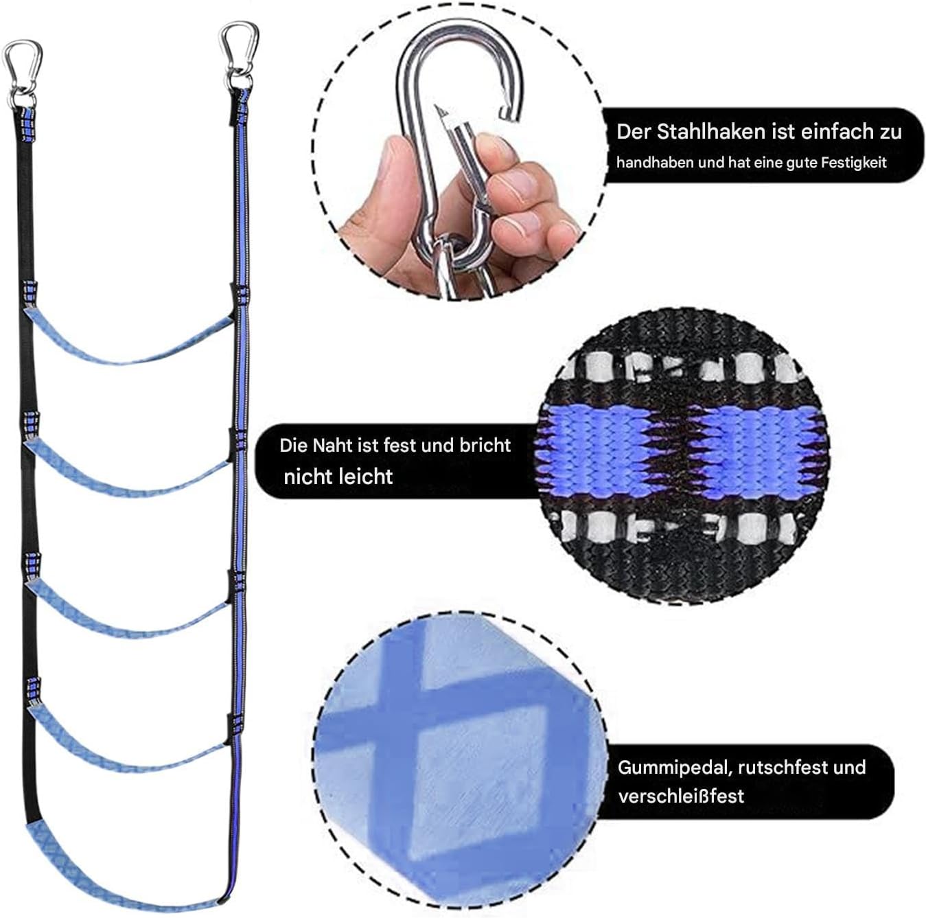 Flessibile e pratico: la struttura pieghevole consente di risparmiare spazio e un utilizzo variabile come scala della barca, maneggevolezza senza attrezzi per un utilizzo senza sforzo in diverse posizioni Funzioni pratiche: ideale per gite di pesca e acque poco profonde, aiuta a nuotare indietro senza sforzo e migliora le attività ricreative in acqua grazie alla struttura robusta Facile da montare: i ganci rinforzati garantiscono un facile fissaggio, mentre le cinghie regolabili consentono un rapido montaggio senza passaggi complicati, migliorando così l'usabilità e l'affidabilità della scala Accesso stabile: struttura a pioli antiscivolo durevole per salire in sicurezza in diverse condizioni. L'ampia compatibilità e la presa salda danno fiducia agli utenti. Forte capacità di carico: superficie antiscivolo con materiale robusto che offre una presa sicura. La treccia multistrato distribuisce uniformemente la pressione – resiste a un uso prolungato anche in ambienti marini salini.