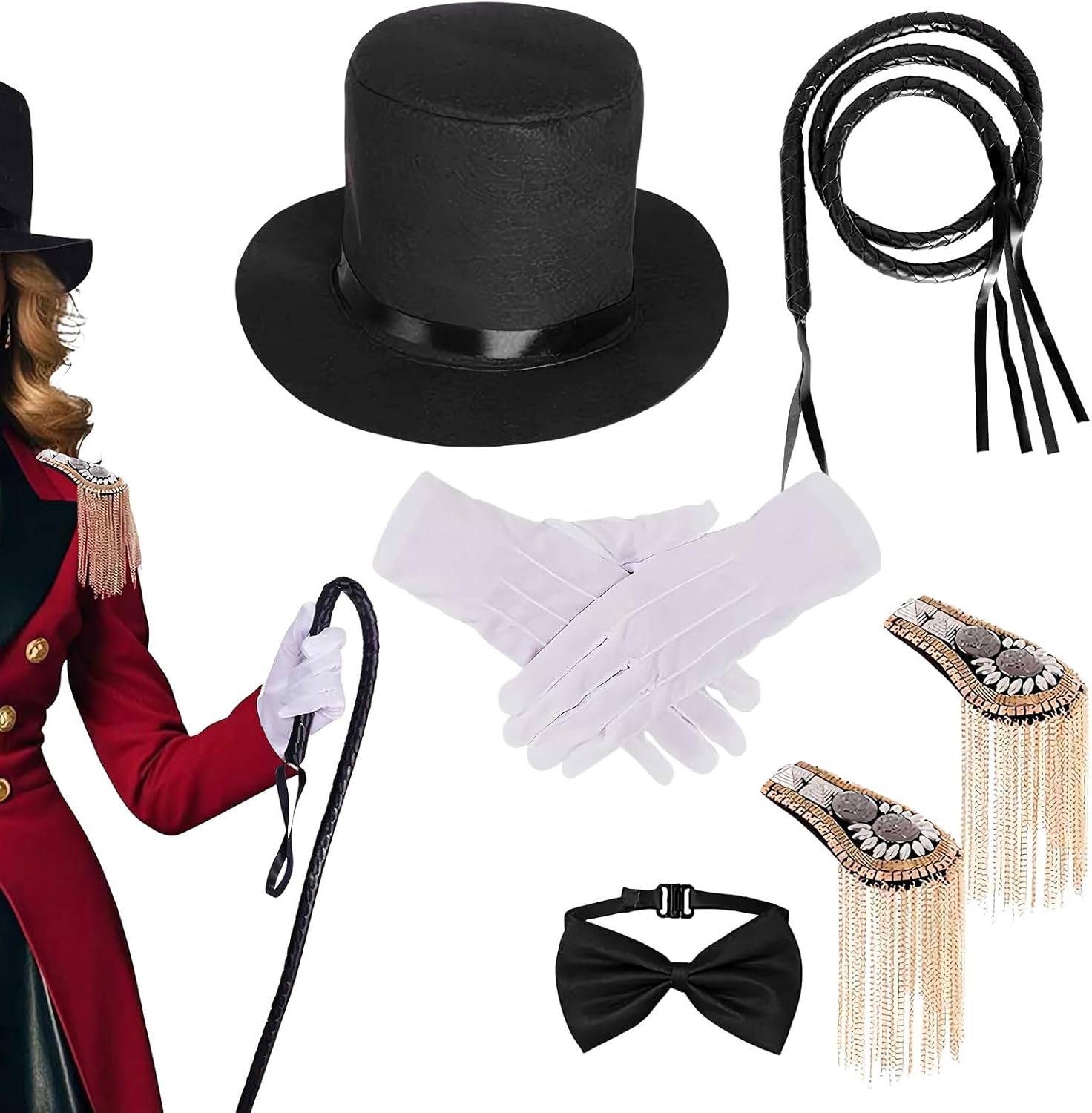 Descrizione prodotto Elevate i vostri eventi e feste a tema circo con i nostri per costumi versatili. Perfetti per uomini e donne, questa collezione include come spalline, una frusta, guanti, un cappello a cilindro e un papillon. Ideali per cosplay o abbigliamento ispirato al circo, questi aggiungono un tocco autentico a qualsiasi performance o celebrazione. per costumi da circo indispensabili per rendere il vostro evento memorabile. Specifiche: Materiale: tessuto non tessuto, feltro, pelle, metallo Dimensione del cappello: circa 32x7,5 cm/12.6x2,95 pollici Dimensioni di epaulette: circa 19x7,1 cm/7.48x2,8 pollici Dimensione del papilla: circa 10x5cm/3.94x1,97 pollici Dimensione del guanto: circa 22,8 cm/8,98 pollici Peso: circa 300 g Elenco dei prodotti: 1 * cappello a cilindro 1 coppia * Epaulette di spalla 1 * papillon 1 coppia* guanti 1 * Whip Nota: A causa e diverse impostazioni di illuminazione e schermo, il colore 'oggetto può essere leggermente diverso dall'immagine. A causa e diverse misurazioni manuali, consentire una differenza di 1-2 cm di dimensioni. Avviso di sicurezza Non applicabile