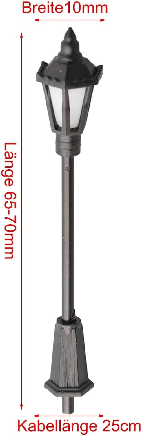 [Lunghezza regolabile]: questi lampioni a LED presentano una lunghezza regolabile di 65-70 mm, consentendo un posizionamento flessibile nel tuo modellino di treno o paesaggio. Regola l'altezza per adattarla a scene diverse e crea effetti realistici di illuminazione stradale. [Scala versatile]: progettati per modelli a scartamento H0 e 00 con una scala di 1:50-1:100, questi lampioni in miniatura sono perfetti per migliorare il tuo modellino di scenari ferroviari, layout stradali e diorami. Aggiungi un tocco di realismo al tuo mondo in miniatura. [ILLUMINAZIONE A LED]: ogni lampione è dotato di una luce a LED e precablato per una facile installazione. Funzionando a 3 V con una corrente consigliata di 20 mA per LED, queste luci forniscono una luce calda e autentica al tuo paesaggio modello. [Set completo]: questo pacchetto contiene 10 lampioni a LED e 10 resistori, offrendo un valore eccellente per il tuo progetto di modellismo ferroviario. Crea un intero paesaggio stradale illuminato o distribuiscilo in diverse aree del tuo layout. [Costruzione]: realizzati in plastica di alta qualità, questi lampioni sono costruiti per durare. Sono sicuri, rispettosi dell'ambiente e progettati per resistere ai rigori della movimentazione e dello spostamento degli appassionati di modellini di treni.