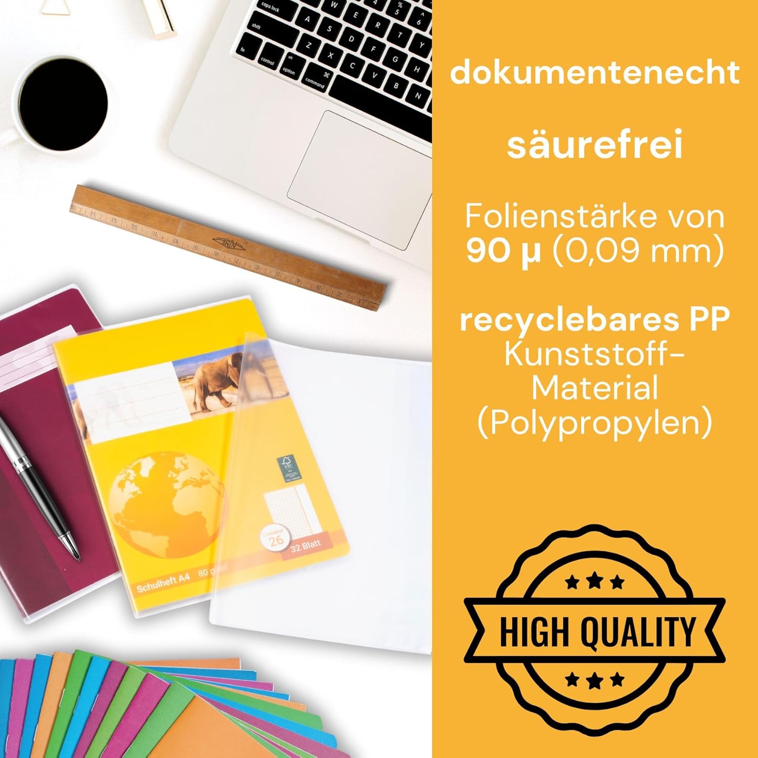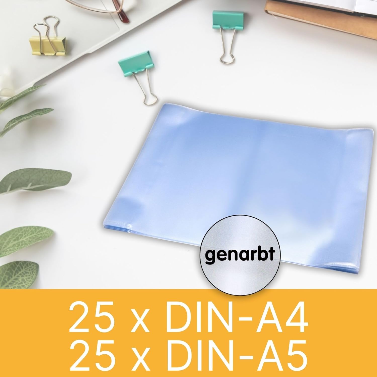 Caratteristiche forti: busta di protezione stabile, spessore della pellicola di 0,09 mm (90 my), materiale plastico ecologico e riciclabile (polipropilene), capacità per 16-32 fogli/max. 48 fogli, made in Germany Formato ideale: protezione per quaderni con una dimensione laterale 213 x 297/152 x 211 mm (A4/A5), dimensioni aperte 426 x 297/304 x 211 mm (A4/A5), per quaderni e libri (copertina morbida) in formato DIN A4/A5, con pratica copertina per quaderni (45 mm). Flessibile e lavabile Colore: 25 buste trasparenti per quaderni, buona riconoscibilità di motivi e scritte grazie alla pellicola di plastica trasparente, trasparente, goffrata, indelebile Protezione perfetta: custodia per quaderni/libri come aiuto efficace per proteggere quaderni scolastici, lavoro, cucitrici, raccoglitori, libri da polvere, sporco, umidità, pieghe, crepe e orecchie da asino Versatile: cover resistente e facile da usare per scuola, casa, ufficio, università, università e ufficio