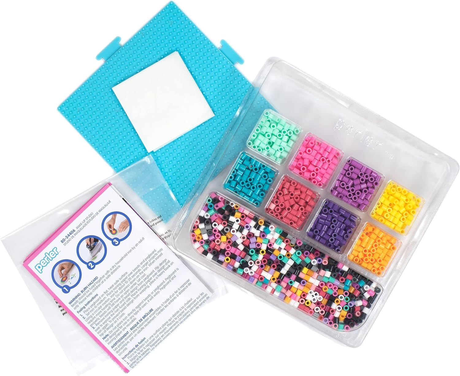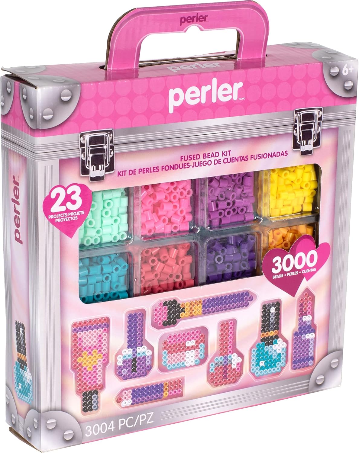 Il kit Perler Bead include (3.000) perline, (1) pannello forato quadrato grande, foglio lucido, (1) foglio con cartamodello con istruzioni e carta da stiro. Crea il tuo studio di trucco con questo set di perline Perler Perfetto come attività artigianale per i bambini, questo set è pieno di tantissimi design di perline Perler a tema salone, dai pennelli per il trucco allo smalto per unghie e al lucidalabbra. Il set di perline fusibili per bambini comprende 23 progetti e una lamina glitterata per aggiungere un effetto brillante ai disegni finiti. Questo kit di perline fusibili Perler è progettato per bambini dai 6 anni in su (la stiratura deve essere eseguita da un adulto) con perline realizzate in polietilene a bassa densità, una plastica per alimenti priva di sostanze chimiche nocive.