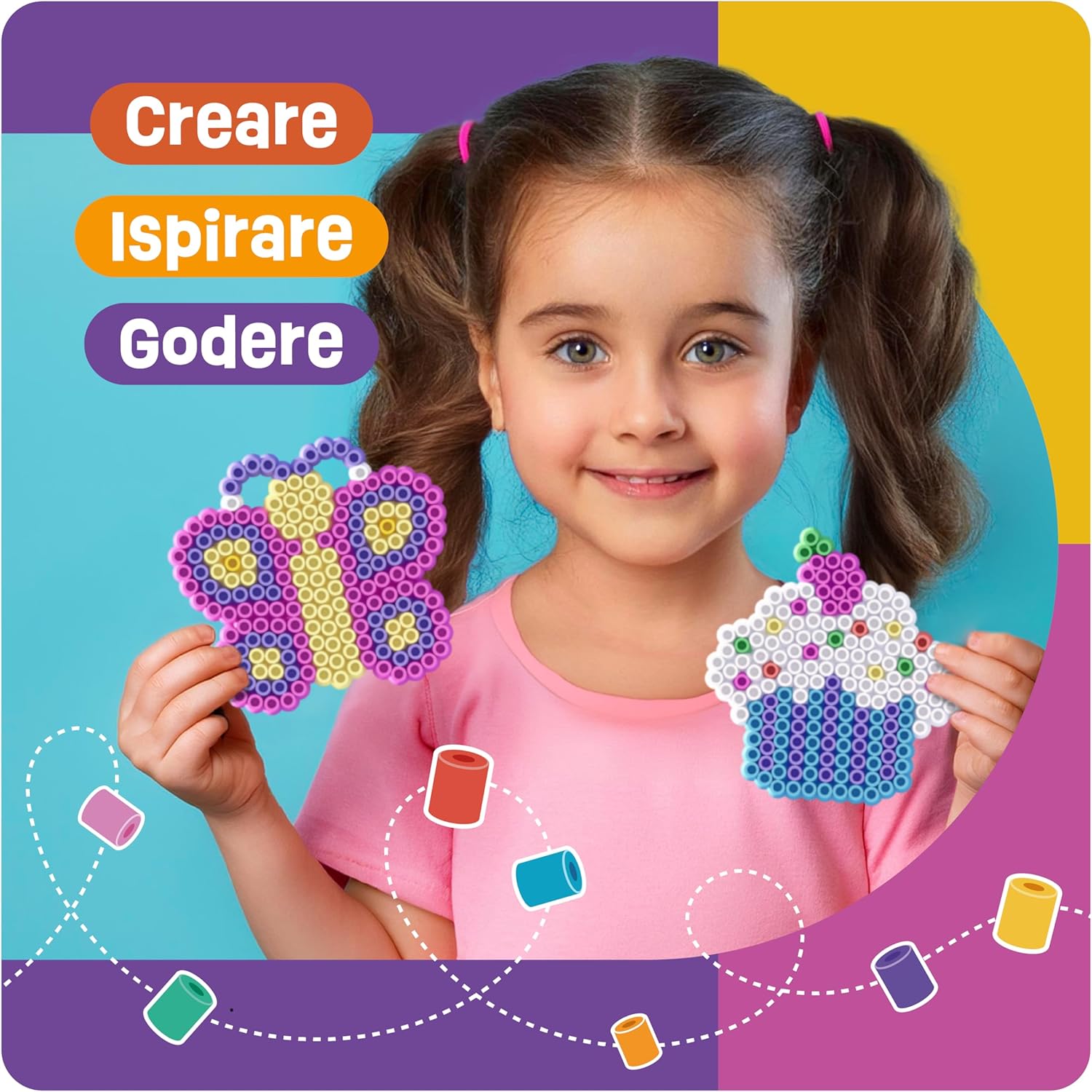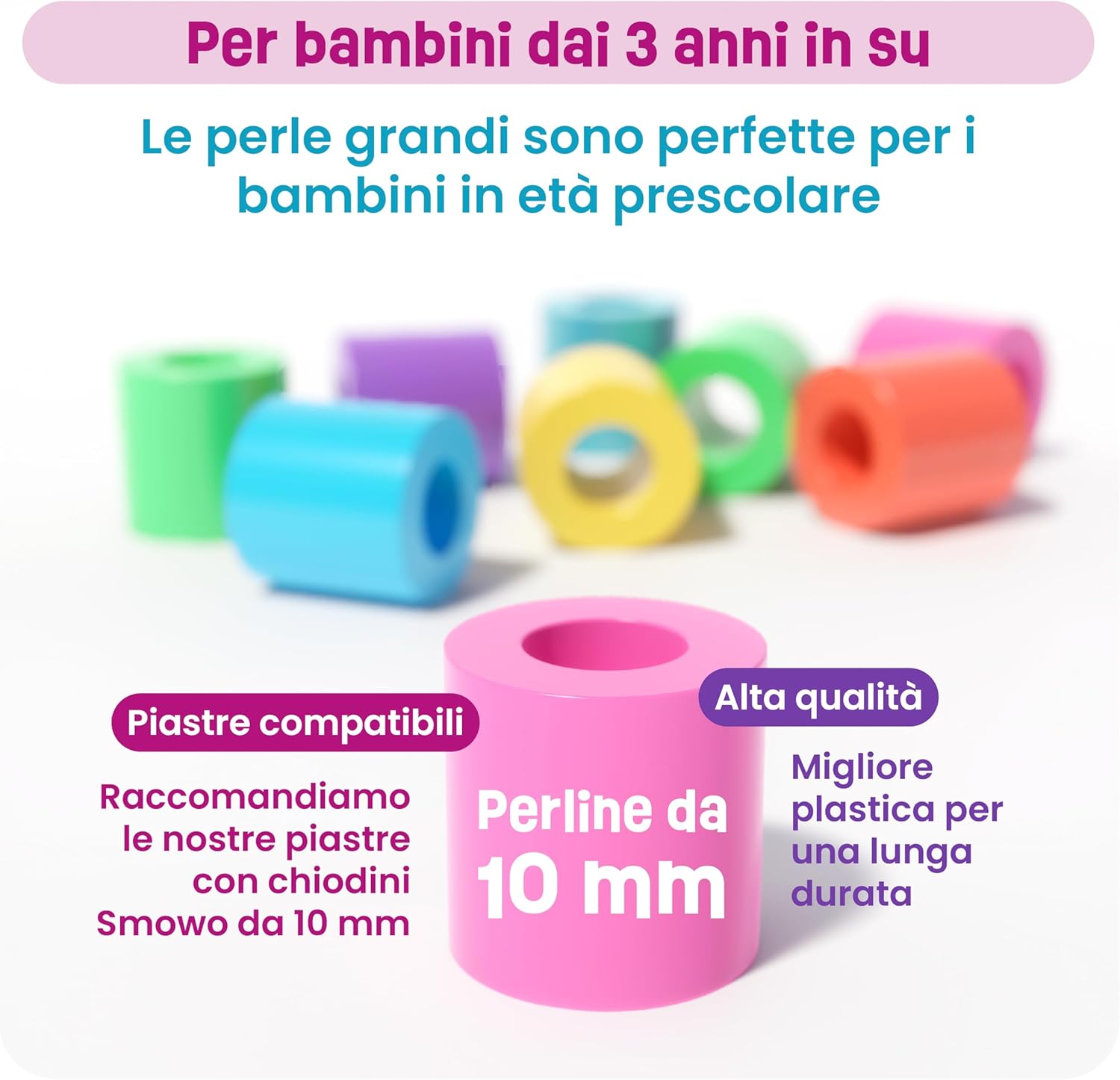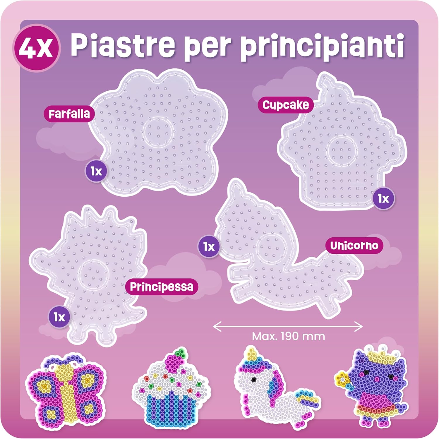 Facile da usare: nel set sono incluse 4 piastre XL adatte per perline da 10 mm Maxi da 10 mm. Con fantastici motivi. Ideale per bambini di 3 anni per promuovere le capacità motorie e inserire i primi progetti di bricolage Il nostro set di piatti offre diverse forme come unicorno, principessa, farfalla e cupcake. Questo favorisce la creatività dei bambini, in quanto possono creare una varietà di disegni e motivi. Un giocattolo popolare per i primi progetti artistici Istruzioni e motivi con motivi colorati e creativi sono inclusi nel set. I modelli di perline possono essere posizionati sotto gli stencil trasparenti e dotati di maxi perline Il set di perline da stirare è adatto come regalo per feste di compleanno per bambini, Pasqua, Natale o in vacanza. Ideale per bambini, ragazze e ragazzi. È ideale per lavori di perline da stirare insieme Le assi di perline da stirare si combinano perfettamente con le nostre perline da 10 mm. Anche le perline di queste dimensioni sono compatibili e possono essere utilizzate come set fai da te