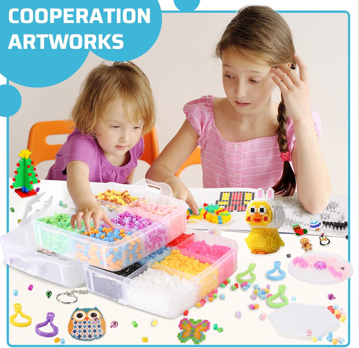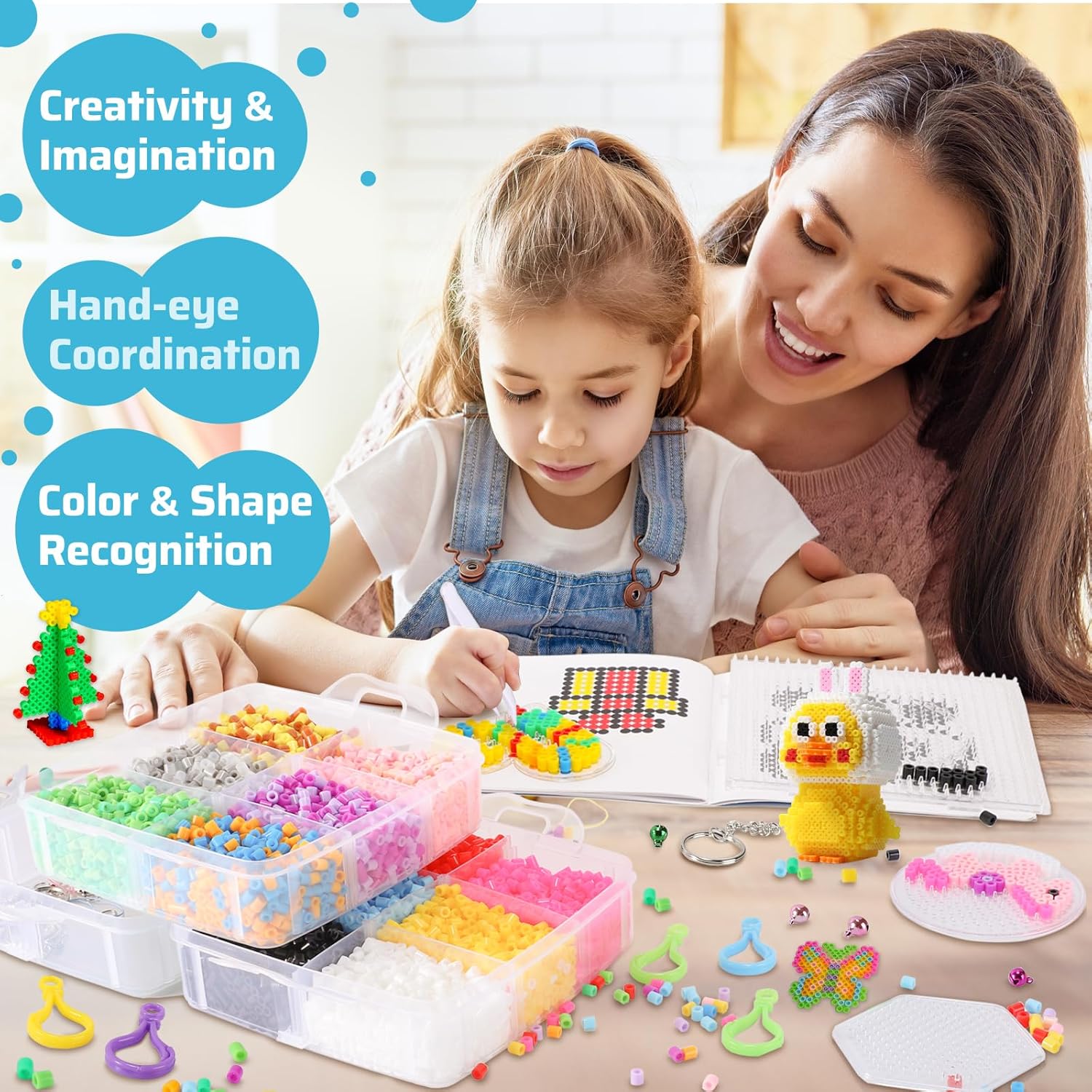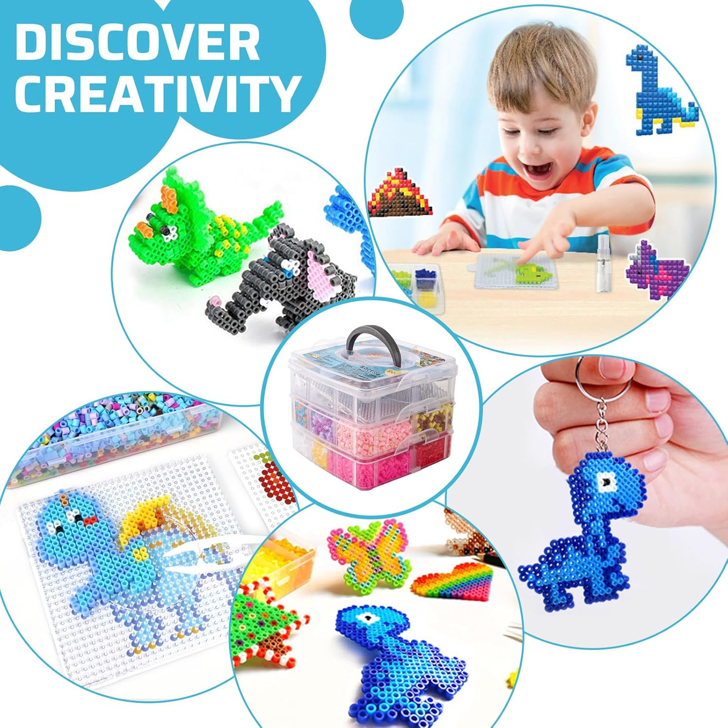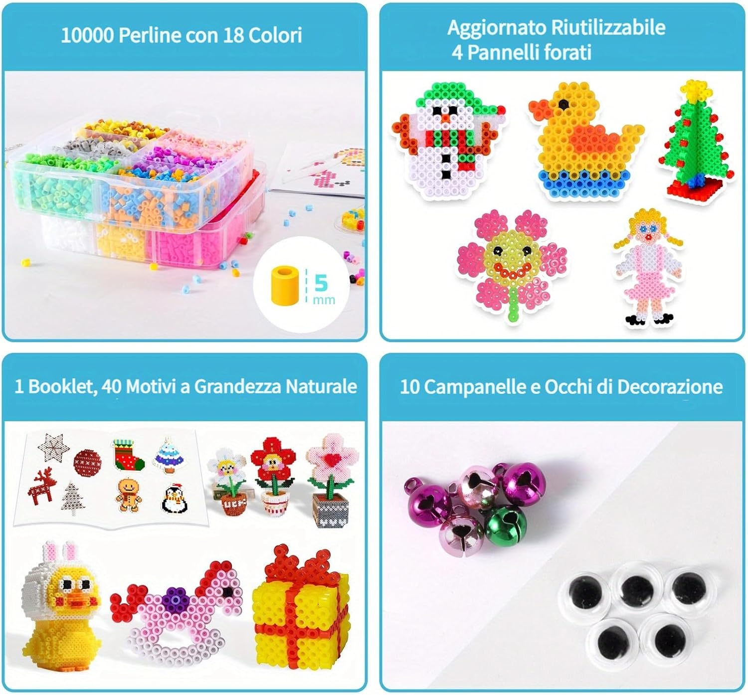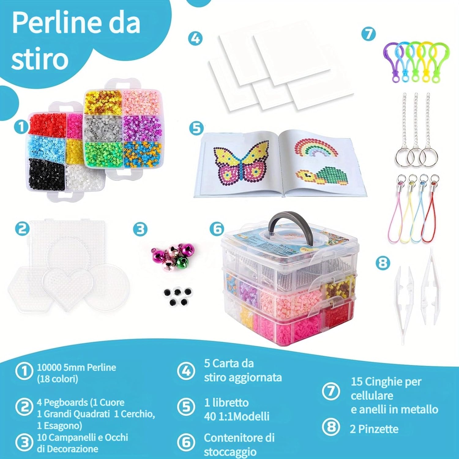 【Kit completo di Perline da Stirare】 I kit completi di Perline da Stirare offrono tutto il necessario per iniziare subito a creare. Questi kit includono 10000 colorate da 5 nm in 18 colori come di seguito, 6 Pegboard per (esagono, quadrato, cuore), 5 * carta da stiro, 5 * cordino di metallo, 5 * portachiavi, 2 * pinzette, libretto di istruzioni del gioco. 【Creatività illimitata】 Le Perline da Stirare (Perline a Fusione) offrono un'ampia gamma di possibilità creative. I bambini possono creare disegni, motivi e personaggi unici utilizzando le Perline da Stirare, stimolando la loro creatività e immaginazione. 【Sviluppo delle competenze motorie】 La creazione con le Perline da Stirare (Perline a Fusione) richiede precisione nel posizionamento delle perline sulla superficie da stirare. Questo sviluppa le competenze motorie fini dei bambini, migliorando la loro coordinazione occhio-mano e la precisione dei movimenti. 【Set di Perline】 I set di Perline da Stirare offrono una vasta selezione di perline in diverse forme, colori e dimensioni, permettendo ai bambini di creare una varietà di disegni e di ampliare la loro creatività. 【Momenti di divertimento e relax】 Creare con le Perline da Stirare è un'attività divertente e rilassante. I bambini possono godersi dei momenti di svago mentre creano i loro disegni, stimolando la concentrazione e riducendo lo stress.