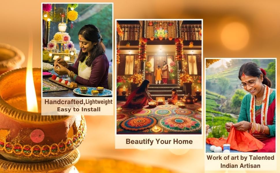 Design tradizionale: da appendere alla parete artigianale con motivi sacri e ritagli di loto, ornato con perline simili a perle ed elementi decorativi per un autentico arredamento indiano Dimensioni eleganti: ogni pezzo misura 63,5 cm di lunghezza, creando uno splendido display verticale perfetto per porte e spazi sacri Materiali di alta qualità: realizzato in resistente MDF con opere d'arte intricate, arricchito con fiori di loto rosa e perline ornamentali per una bellezza duratura Decorazione versatile: perfetta per aree del tempio, ingressi domestici, celebrazioni culturali e occasioni speciali, aggiungendo un tocco artistico a qualsiasi spazio Facile installazione: viene fornito completamente assemblato con meccanismo di sospensione, pesa circa 300 grammi per un comodo posizionamento