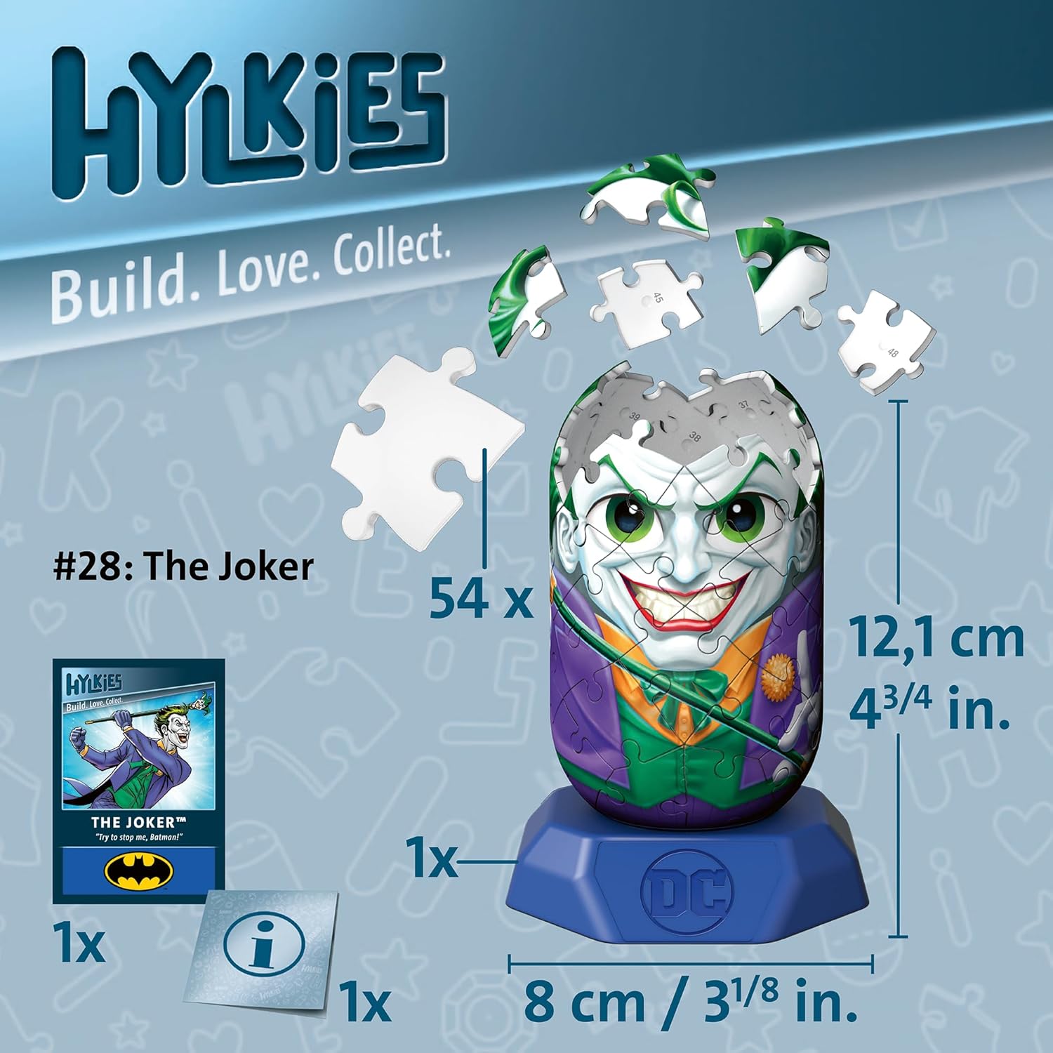 Figura da collezione Hylkies #28 - Il Joker: il clown del caos di Gotham si unisce alla gamma di personaggi DC Hylkies in un affascinante modo Hylkies. La figura Hylkies Joker si adatta perfettamente alle altre figure della serie Hylkies. Le piccole figure non sono solo una fantastica decorazione DC, ma anche fantastici regali di supereroi DC. Le adorabili capsule Hylkie sono assemblate da soli: da 54 parti di alta qualità numerate sul retro - e senza colla. Innamorati di nuovo dei tuoi eroi cinematografici più famosi e mostra al mondo che sei un grande fan. Sia come pezzo singolo che come parte di una collezione, gli Hylkies sono il punto forte su ogni scaffale. Contenuto: 1 carta collezionabile, 54 pezzi di puzzle in plastica a forma tridimensionale numerati sul retro, supporto in plastica, istruzioni rapide. Dimensioni del prodotto montato incluso supporto (AxLxP): ca. 12,5 cm x 7,7 cm x 8 cm. Diametro della capsula ca. 6 cm