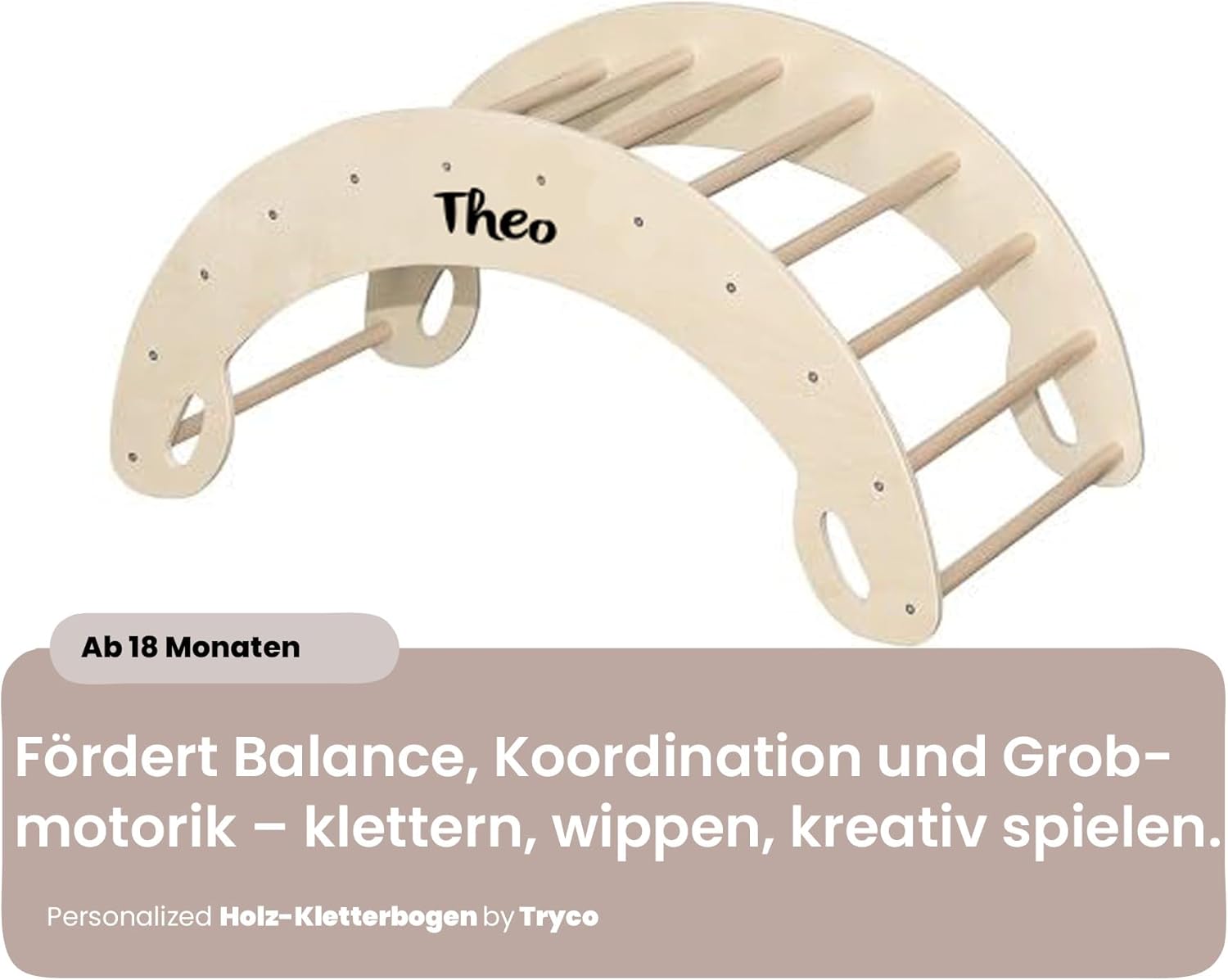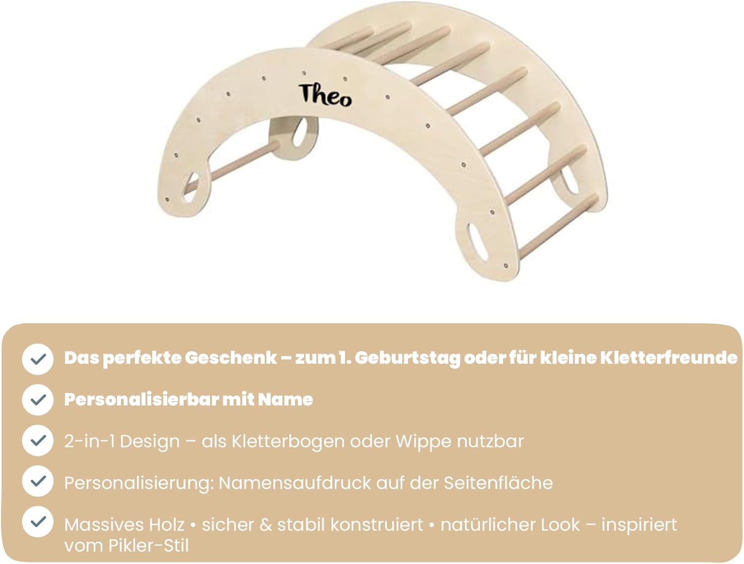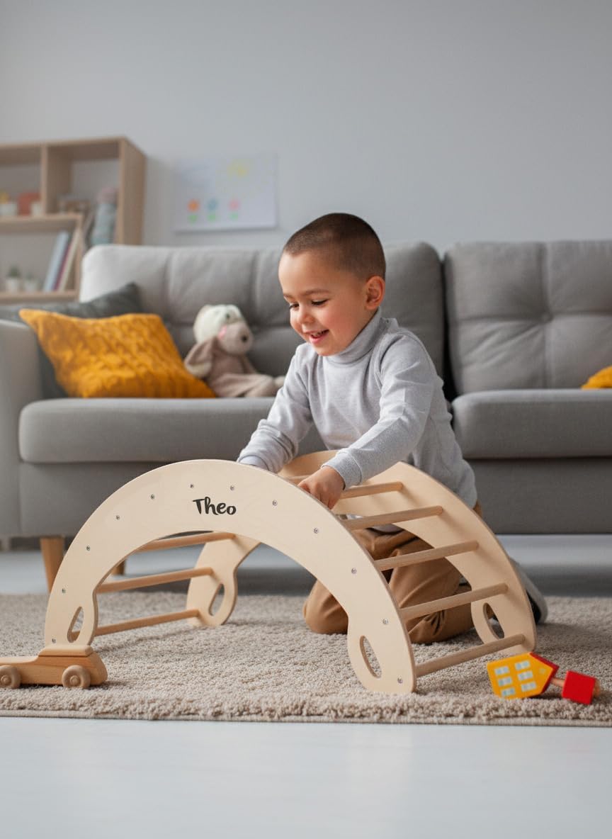 Descrizione prodotto Ciao, che piacere rivederti! Cerchi un gioco montessoriano, solido e che cresca con il bambino? L’arco da arrampicata in legno 3-in-1 Tryco è dondolo, ponte/tunnel e struttura per arrampicata in un unico prodotto. Dalla scoperta dell’equilibrio ai primi percorsi motori, stimola motricità grossa e fine, propriocezione, coordinazione e fiducia in sé. La personalizzazione con nome lo rende unico in cameretta, sala giochi o salotto—perfetto da 18 mesi in su. Perché ti piacerà 3-in-1 flessibile: arco per arrampicata, dondolo capovolto, ponte/tunnel nei giochi di fantasia. Allenamento quotidiano: salire, scendere, dondolare—sviluppa equilibrio, forza del core e pianificazione motoria. Design montessoriano: invita al gioco libero e all’autonomia, senza luci o suoni invadenti. Stile naturale: legno chiaro e linee morbide che arredano con calore qualsiasi ambiente. Unico con il suo nome: personalizzazione durevole che evita scambi e aggiunge un tocco speciale. Come si usa Arco/Climbing: posiziona con i pioli in alto per salire e scendere in sicurezza. Dondolo: capovolgi l’arco, siediti al centro e dondola con movimenti dolci (sempre con supervisione). Ponte/Tunnel: inseriscilo nei percorsi sensoriali o nei giochi di ruolo (capanne, garage, traghetti). Abbinabile a tappeti morbidi o a percorsi equilibrio per ampliare le sfide in base all’età. Materiali & cura Struttura in legno levigato con bordi arrotondati; pioli comodi alla presa delle piccole mani. Finiture a base d’acqua dai toni naturali; facili da integrare in casa. Pulizia: panno morbido leggermente umido, asciugare subito; evitare solventi e immersione in acqua. Controlli periodici: serrare viti/fissaggi, verificare stabilità e integrità delle superfici. Personalizzalo come vuoi Inserisci il nome (consigliati ~12–14 caratteri): lo stampiamo in modo chiaro e durevole sull’area dedicata. Verifica ortografia e maiuscole prima di confermare: realizziamo esattamente il testo inserito. Sicurezza prima di tutto Utilizzare su superficie piana, con tappeto o protezione antiscivolo; supervisione di un adulto obbligatoria. Indicato da 18 mesi; adegua le attività alle capacità del bambino, senza forzare i passaggi. Ordina oggi, gioca e cresce ogni giorno Un solo elemento, infinite possibilità: personalizza ora l’arco 3-in-1 Tryco e crea un angolo motricità che evolve con il tuo bambino! Scheda rapida Prodotto: Arco da arrampicata in legno 3-in-1 Tryco – arrampicata, dondolo, ponte/tunnel – personalizzabile con nome (stampa) Età consigliata: da 18 mesi (con supervisione adulta) Finalità: equilibrio, coordinazione, forza del core, gioco libero montessoriano Materiali: legno con finiture a base d’acqua; bordi arrotondati Cura: panno umido; no solventi/immersione; controlli periodici dei fissaggi EAN: 5420067910169 Avviso di sicurezza Utilizzare solo sotto la sorveglianza di un adulto.