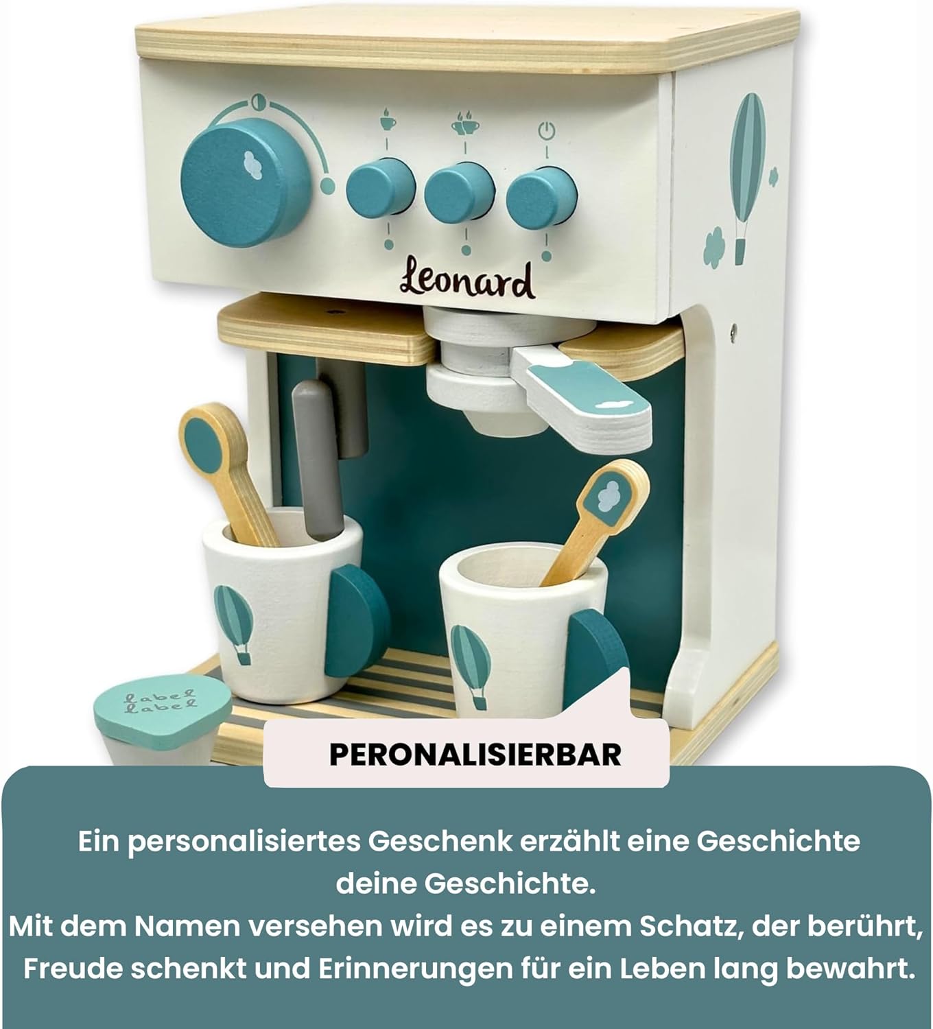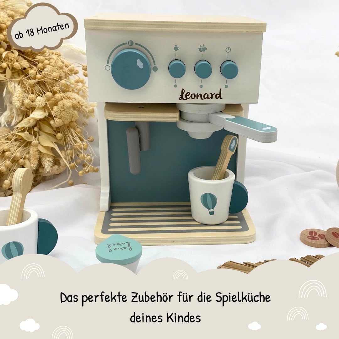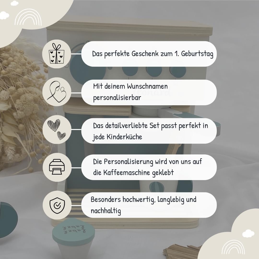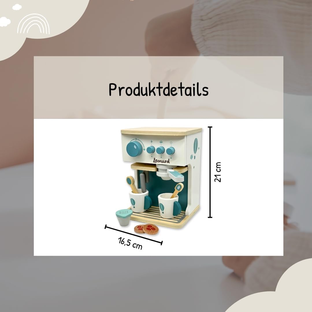 Gusto giocoso del caffè: macchina per caffè espresso in legno con dettagli realistici per un gioco di ruolo creativo. Giocattolo in legno di alta qualità: lavorazione robusta con colori sicuri per i bambini, durevole e stabile. Personalizzabile con il nome: un pezzo unico speciale grazie alla stampa personalizzata del nome. Perfetto come idea regalo. Stimola l'immaginazione e le capacità motorie – I giochi di ruolo stimolano la creatività, la coordinazione occhio-mano e le abilità sociali. Idea regalo per piccoli baristi: ideale per compleanni, Natale o occasioni speciali. Un punto forte in ogni cucina per bambini. Si adatta perfettamente a qualsiasi cucina giocattolo: design moderno in rosa, combinabile con altri giocattoli in legno Label Label.