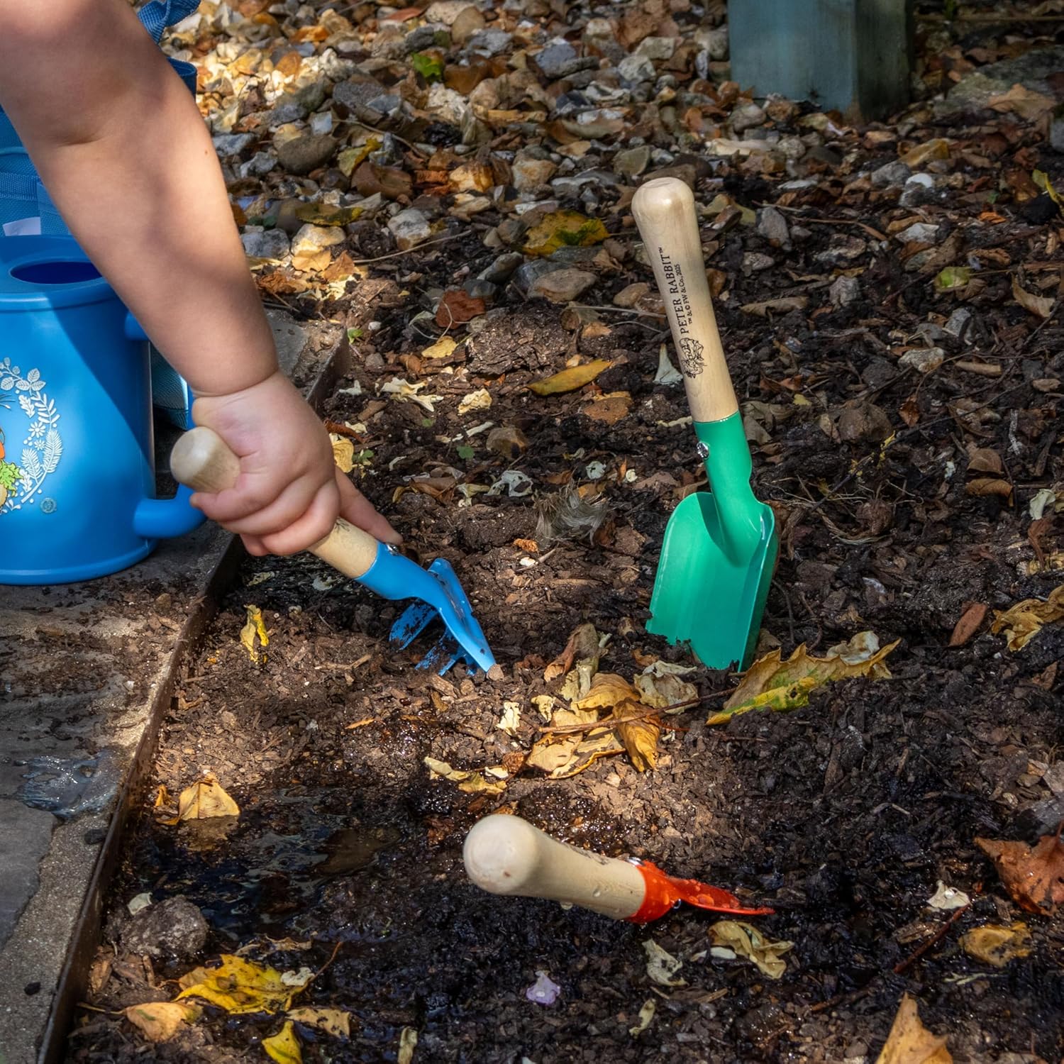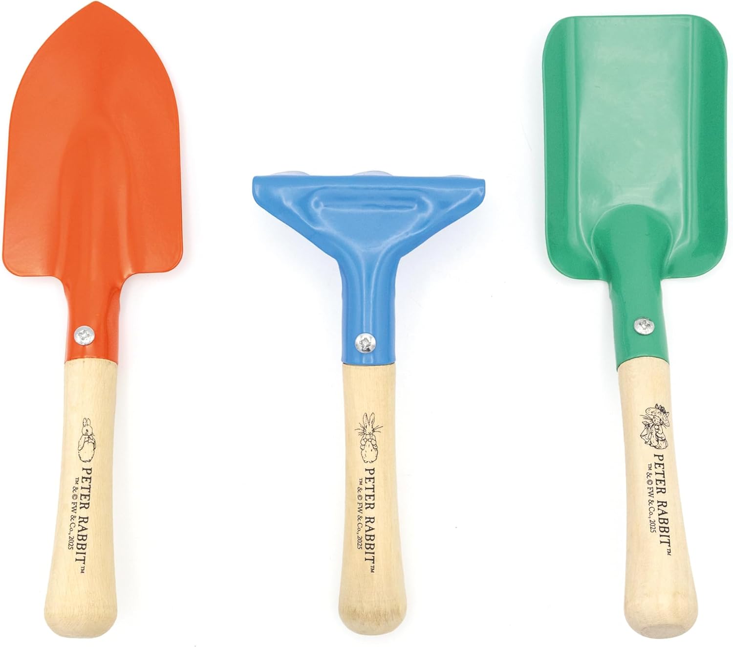 Set di attrezzi da giardino per bambini: include una vanga, una cazzuola e un rastrello, tutte perfettamente dimensionate per consentire ai bambini di usare comodamente. Forti e durevoli: realizzati in metallo di alta qualità con manici in legno liscio, questi strumenti sono costruiti per durare per divertirsi all'aperto. Progettato per le mani piccole: le maniglie ergonomiche rendono gli strumenti facili da impugnare e utilizzare per i bambini mentre sviluppano la coordinazione. Incoraggia il gioco all'aperto: un modo divertente per portare i bambini in giardino, lontano dagli schermi e connessi con la natura. Design con coniglio: con l'amato Peter Rabbit, questo set è un bel regalo per qualsiasi giovane appassionato di giardinaggio.