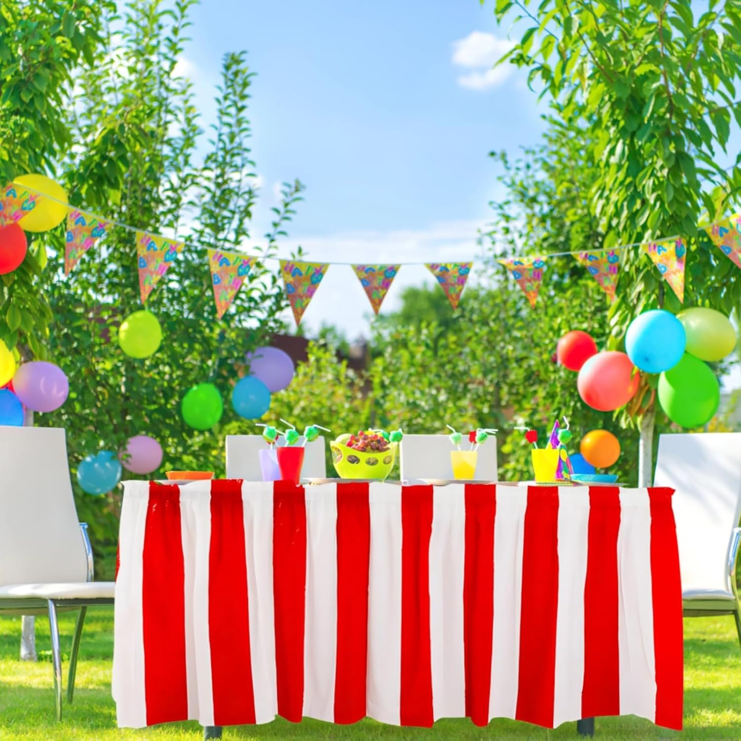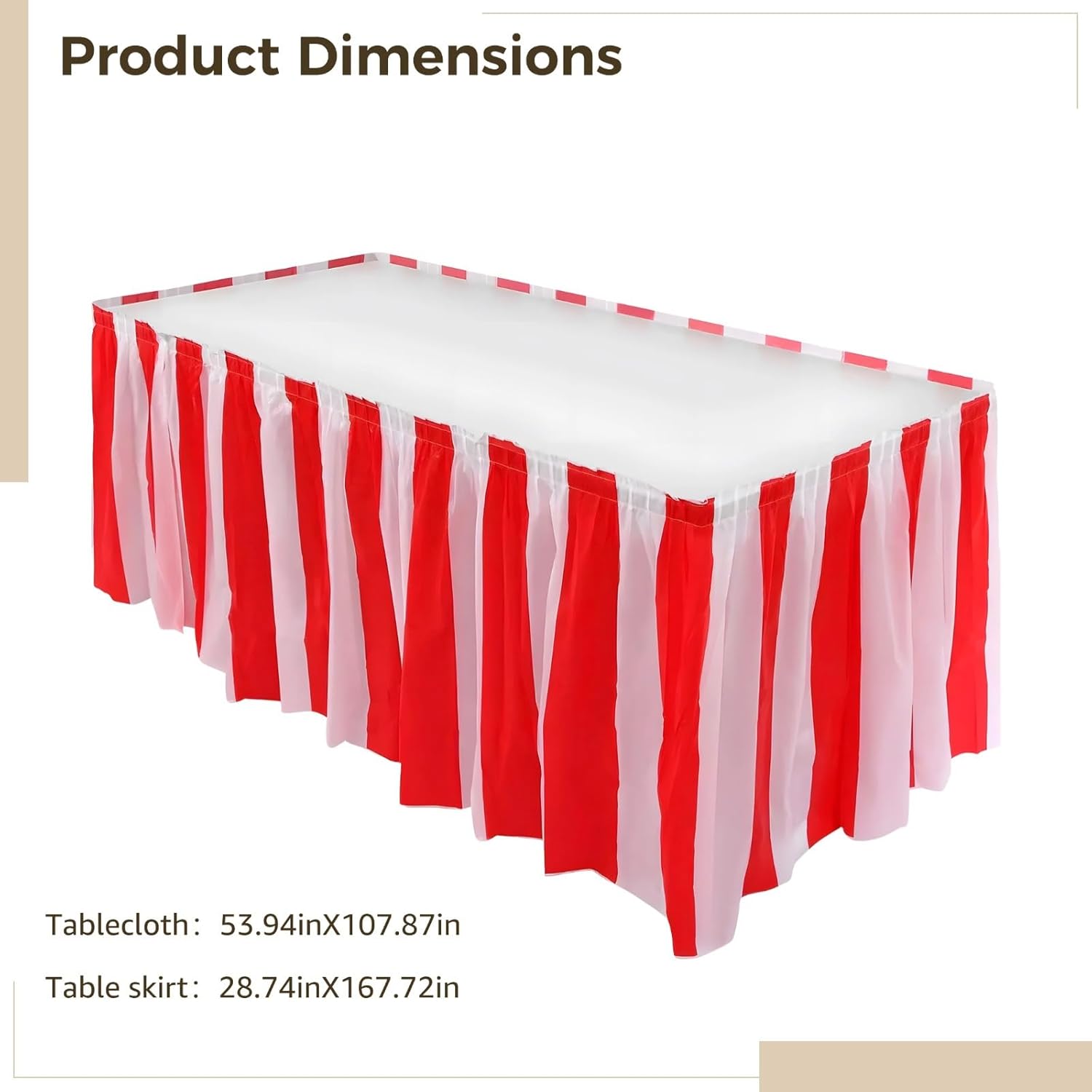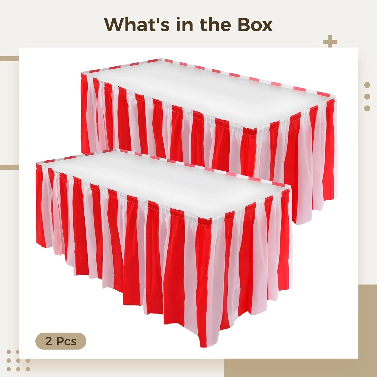 Migliora l'atmosfera: le strisce rosse e bianche luminose forniscono un tocco festivo per qualsiasi evento; attirano l'attenzione e l'atmosfera della festa; la combinazione è classica, per matrimoni, carnevale o feste di compleanno Protegge le superfici: il peva di qualità rende questo set impermeabile e resistente all'olio; è facile da pulire e mantenere per un uso a lungo termine; macchie e fuoriuscite non rovinano il tavolo o le decorazioni Installazione rapida: con un design autoadesivo, basta staccare e attaccare per una facile installazione; la gonna rimarrà sicura durante l'evento, senza complicazioni Ottima vestibilità: progettata per fornire un'ampia copertura, dando ai tavoli delle feste un aspetto professionale e lucido; pensata per tavoli standard; la tovaglia misura 137 x 274 cm e la gonna è 73 x 426 cm Decorazione senza sforzo: contiene due set completi di tovaglia e gonna per valore; decorare è divertente e senza sforzo; per una varietà di occasioni come feste di carnevale, compleanni e matrimoni