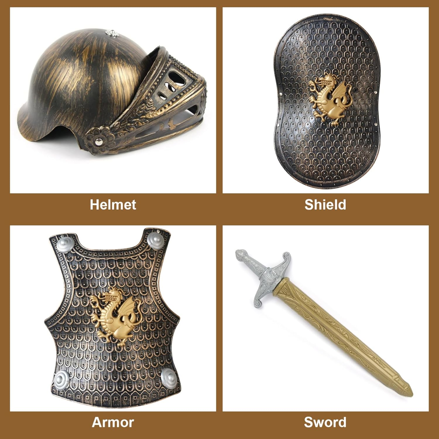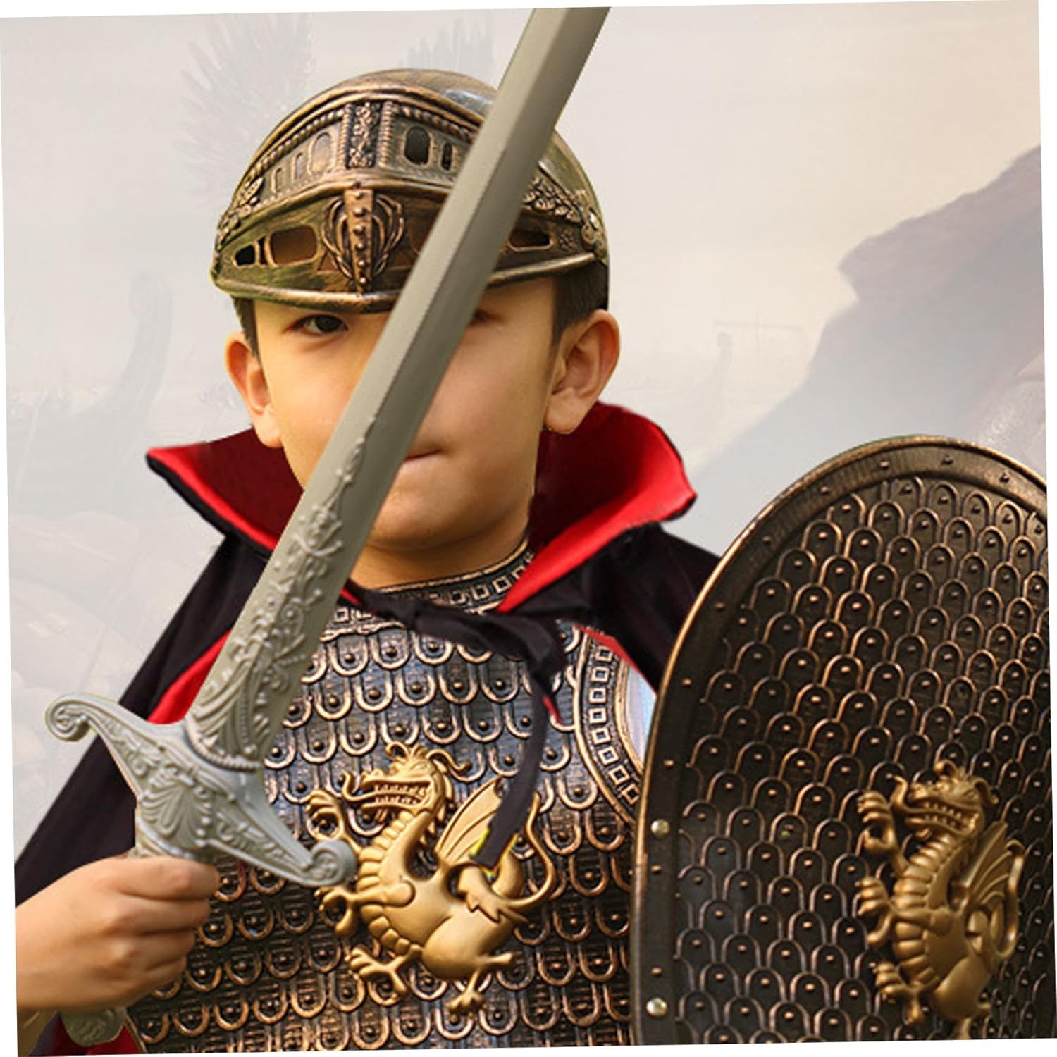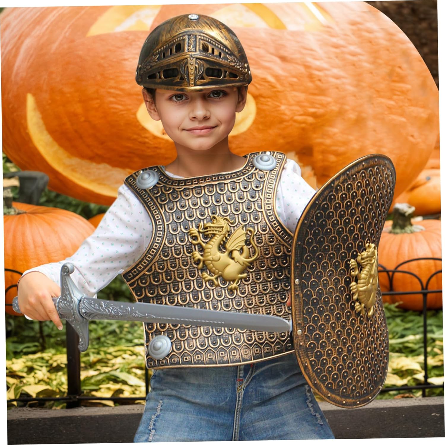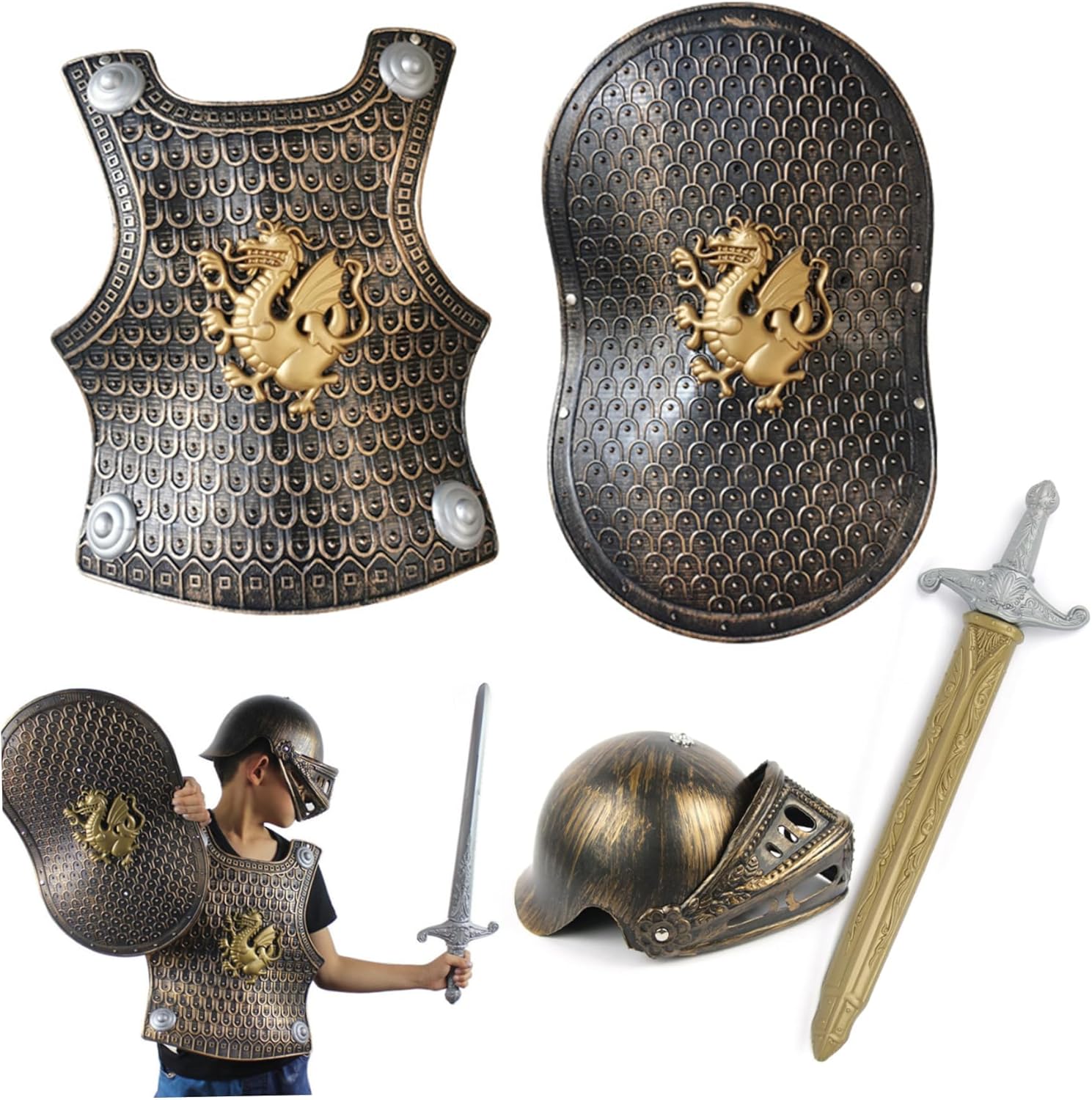 Set di accessori completo: include casco, spada e scudo perfettamente dimensionati per bambini, consentendo un gioco immaginativo completo e migliorando il gioco immaginativo durante le feste a tema VBS o eventi in costume Knight Costume Medieval Armor Autentico design medievale: realizzato con plastica, questo costume per bambini è dotato di armature medievali dettagliate e un casco classico, che offre un'esperienza di gioco di ruolo coinvolgente e realistica per i ragazzi che amano l'avventura e la storia del costume da armatura medievale Knight Versatile gioco di gioco di ruolo: perfetto per VB, feste di compleanno a tema, spettacoli scolastici o Halloween, questo costume da armatura cavaliere incoraggia la creatività e costruisce fiducia nel costume da cavaliere per cavalieri di Young Knights Knight Facile da indossare e pulire: semplice da indossare e rimuovere, i materiali in plastica del costume sono facili da pulire, rendendolo pratico per un uso ripetuto e una preparazione rapida prima di ogni costume da armatura Knight Event per ragazzi Fit confortevole e sicuro: armatura per cavaliere leggera progettata per adattarsi comodamente ai ragazzi, consentendo la libertà di movimento senza sacrificare la sicurezza, ideale per il gioco attivo e costume da cavaliere da ragazzi per ragazzi costume da cavaliere
