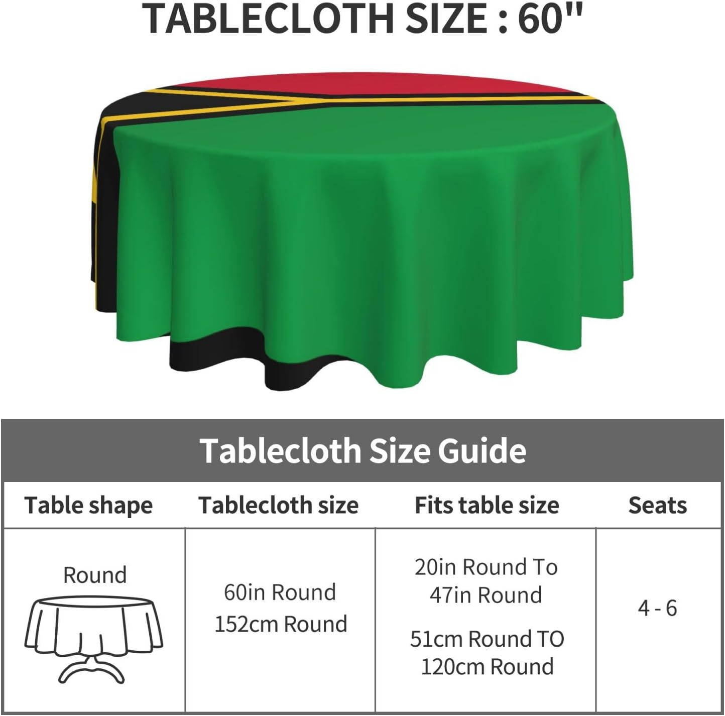 Bellissimo motivo: su questa tovaglia è stampata una bellissima bandiera di Vanuatu, che illuminerà la tua sala da pranzo, il soggiorno e il patio con un aspetto fresco. MATERIALE DI ALTA QUALITÀ: questa tovaglia da 60" x 60" è realizzata in tessuto di poliestere di alta qualità, resistente alle pieghe, alle macchie, all'acqua e durevole. Proteggi la tavola: Con questa tovaglia la tua tavola non si sporcherà facilmente con oli e salse. Inoltre protegge il tuo tavolo da graffi e urti e lo fa sembrare nuovo. Adatto a molteplici occasioni: adatto per ogni occasione a casa, festa, hotel, ristorante, bar, cucina, patio o sala da pranzo. Puoi trovare la tovaglia giusta da abbinare a stoviglie, posate, tovaglioli, tovagliette e altre decorazioni. Durevole e adatto per uso interno ed esterno. Istruzioni per la cura: basta pulire con un panno umido per mantenere la tovaglia fresca e pulita. Lavare in lavatrice in acqua fredda, non candeggiare. Se necessario stirare a bassa temperatura dal rovescio della tovaglia.