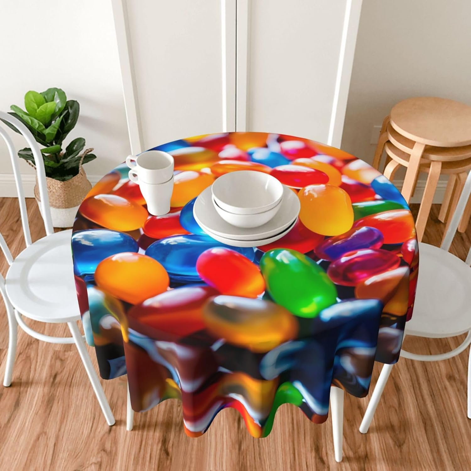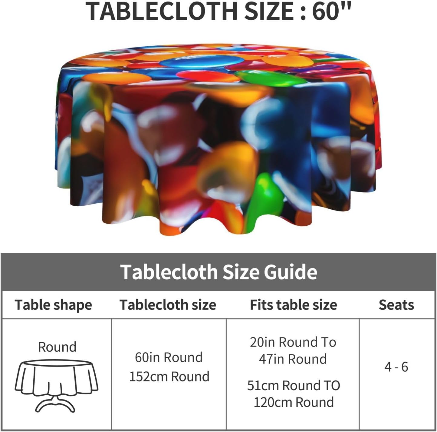 Bellissimo motivo a motivi: questa tovaglia è stampata con un bellissimo motivo a forma di dolciumi che illuminerà la tua sala da pranzo, il soggiorno e il patio con un look fresco. MATERIALE DI ALTA QUALITÀ: questa tovaglia da 60" x 60" è realizzata in tessuto di poliestere di alta qualità, resistente alle pieghe, alle macchie, all'acqua e durevole. Proteggi la tavola: Con questa tovaglia la tua tavola non si sporcherà facilmente con oli e salse. Inoltre protegge il tuo tavolo da graffi e urti e lo fa sembrare nuovo. Adatto a molteplici occasioni: adatto per ogni occasione a casa, festa, hotel, ristorante, bar, cucina, patio o sala da pranzo. Puoi trovare la tovaglia giusta da abbinare a stoviglie, posate, tovaglioli, tovagliette e altre decorazioni. Durevole e adatto per uso interno ed esterno. Istruzioni per la cura: basta pulire con un panno umido per mantenere la tovaglia fresca e pulita. Lavare in lavatrice in acqua fredda, non candeggiare. Se necessario stirare a bassa temperatura dal rovescio della tovaglia.