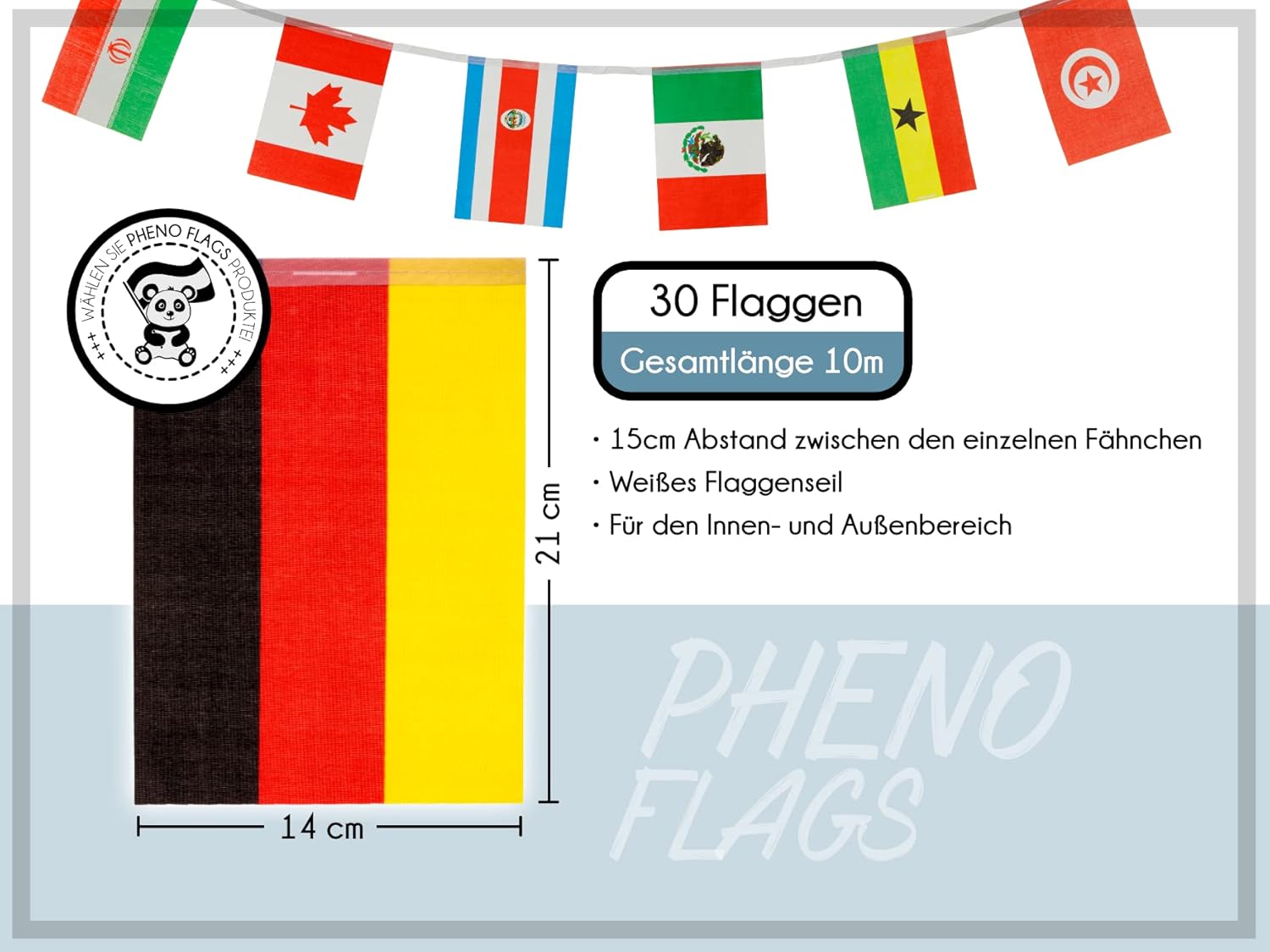 MOSTRA BANDIERE: tradizionale catena per bandiere con 30 diverse bandiere del mondo in materiale resistente al vento e alle intemperie LAVORAZIONE ROBUSTA: la catena per bandiere è realizzata in poliestere 75D resistente agli strappi e all'usura e una corda bianca per il fissaggio agli alberi e alle pareti della casa SUPPORTI IDEALI: con la catena per bandiere aricona sei ben equipaggiato. È portatile, leggero e riutilizzabile grazie al materiale. Con la catena di bandiere lunga 10 metri, è la decorazione perfetta per le feste in giardino. USO VERSATILE: Oltre all'uso interno ed esterno, è ideale anche come grande tifoso e accessorio decorativo in occasione di eventi sportivi, come i Campionati del mondo o i Giochi Olimpici INFORMAZIONI SUL PRODOTTO: catena di bandiere lunga 10 metri con 30 paesi in poliestere 75D, spaziatura delle bandiere di 15 cm, dimensioni della bandiera ciascuna 14x21 cm, corda bianca con una semplice cucitura in poliestere