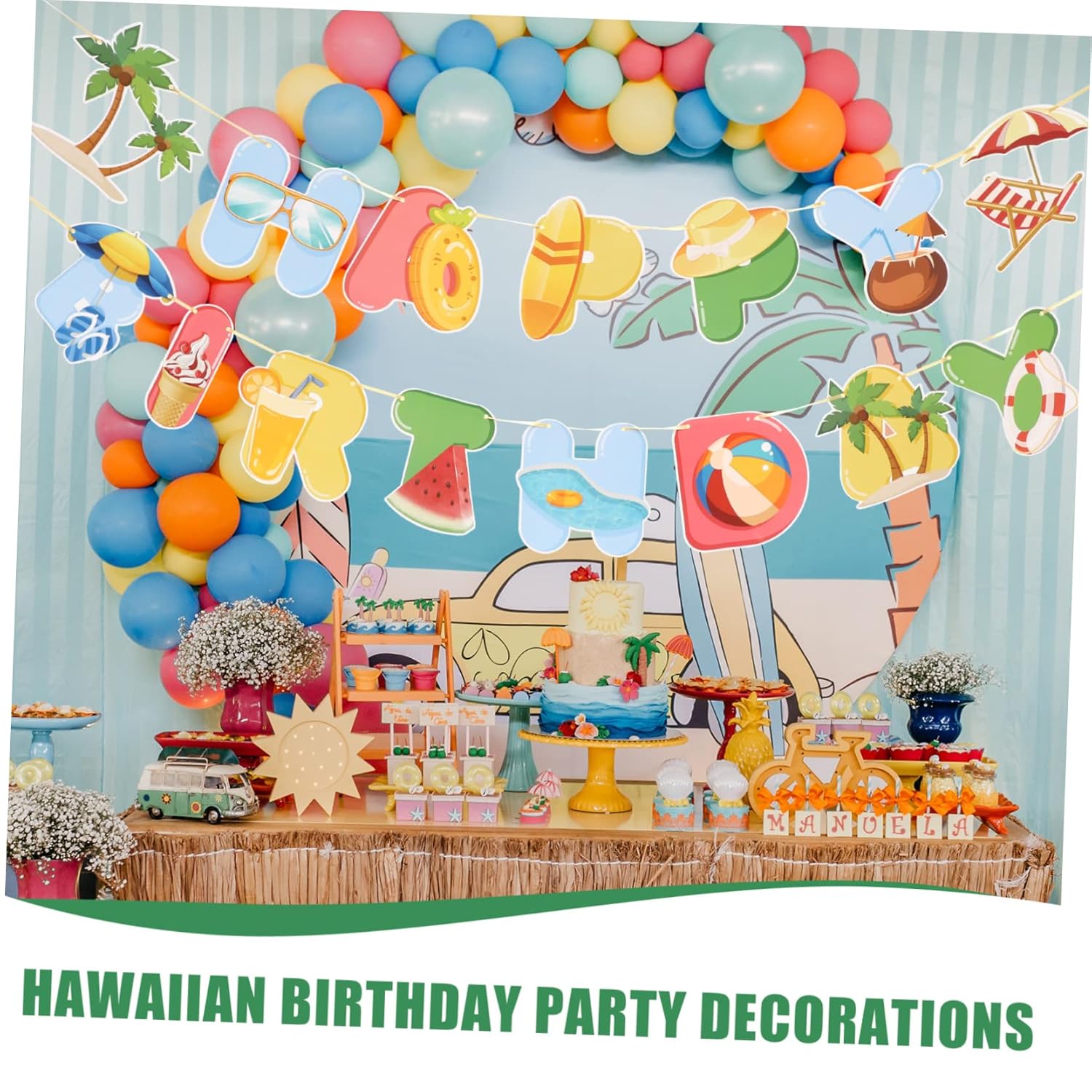 Decorazioni di compleanno: una per decorare la festa di compleanno della tua famiglia o dei tuoi amici e un pratico striscione di compleanno per la festa. Banner di compleanno: una combinazione per te, crea una festa impressionante per i tuoi bambini, banner hawaiano di buon compleanno. Banner di compleanno fai-da-te: stupisci i tuoi bambini e i tuoi ospiti, i genitori possono facilmente preparare una fantastica festa, decorazione per la festa di compleanno luau hawaiana. DECORAZIONI PER FESTE DI COMPLEANNO HAWAII - Decorazione per compleanni a tema Hawaii, aggiungi più interesse, bellezza e fascino alla decorazione della tua festa, banner per feste alle Hawaii. Hawaii - Adatto a molte occasioni, come giardino, casa, cucina, ufficio, ecc., può essere utilizzato all'interno e all'esterno, può anche essere utilizzato per scopi commerciali, bandiera come decorazione.