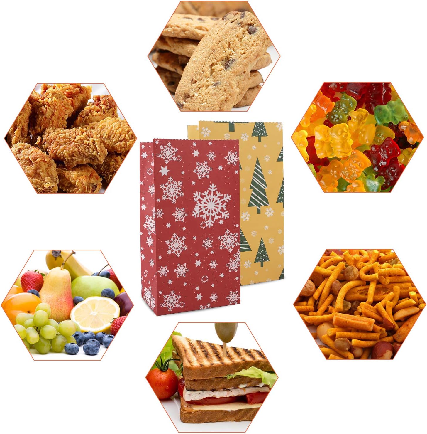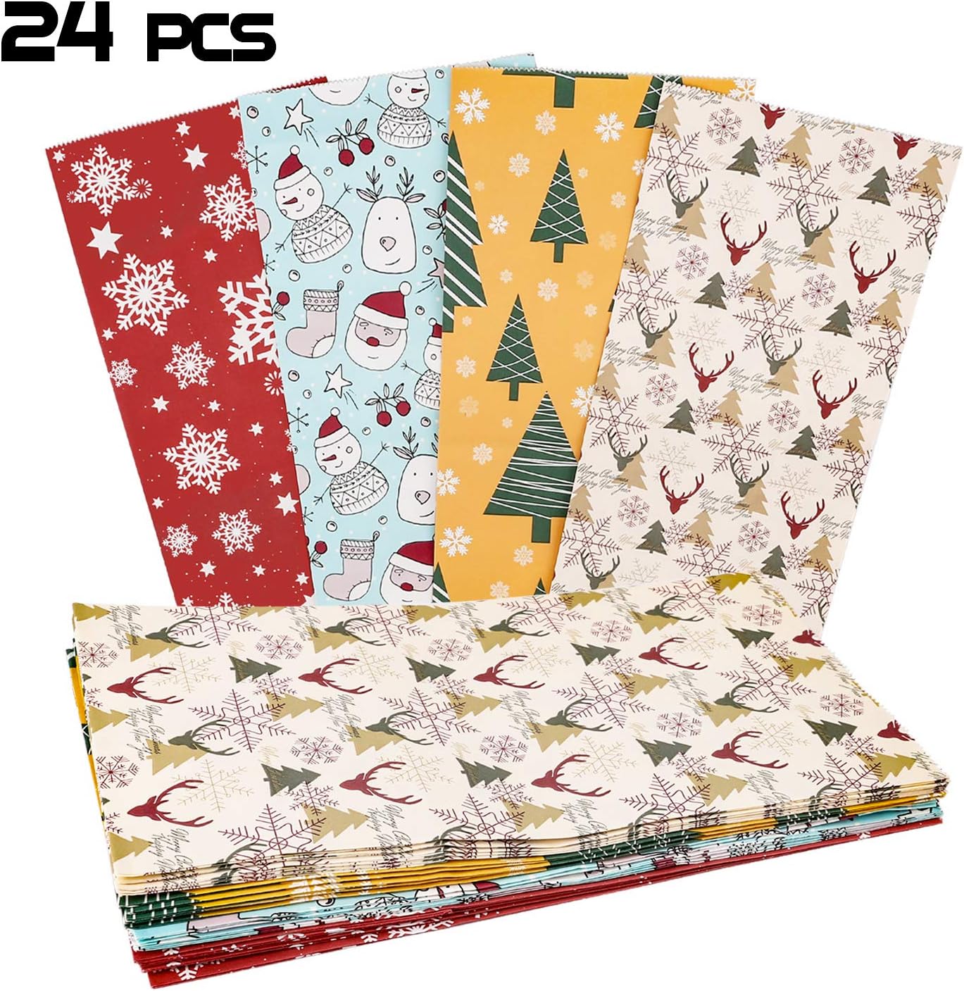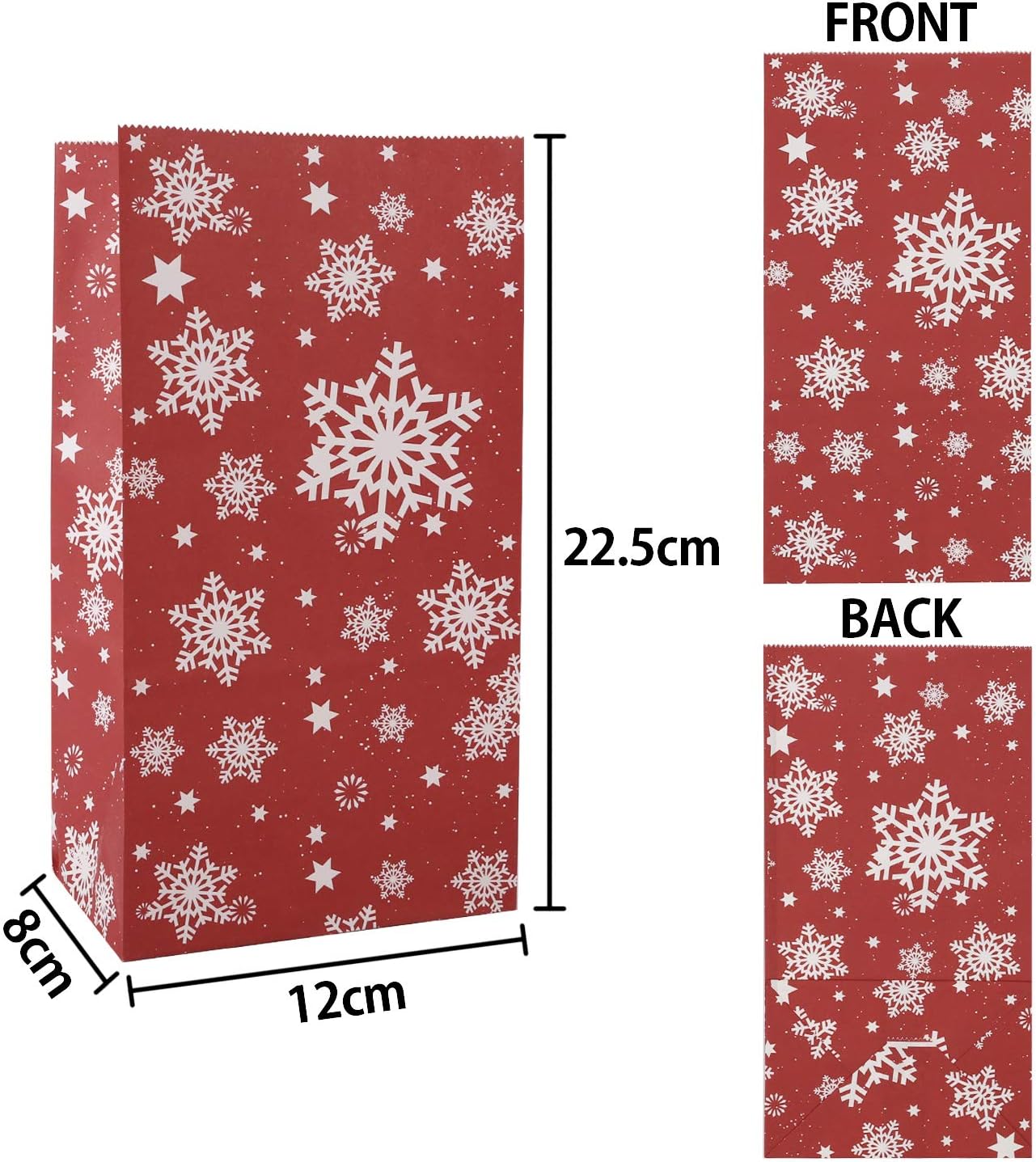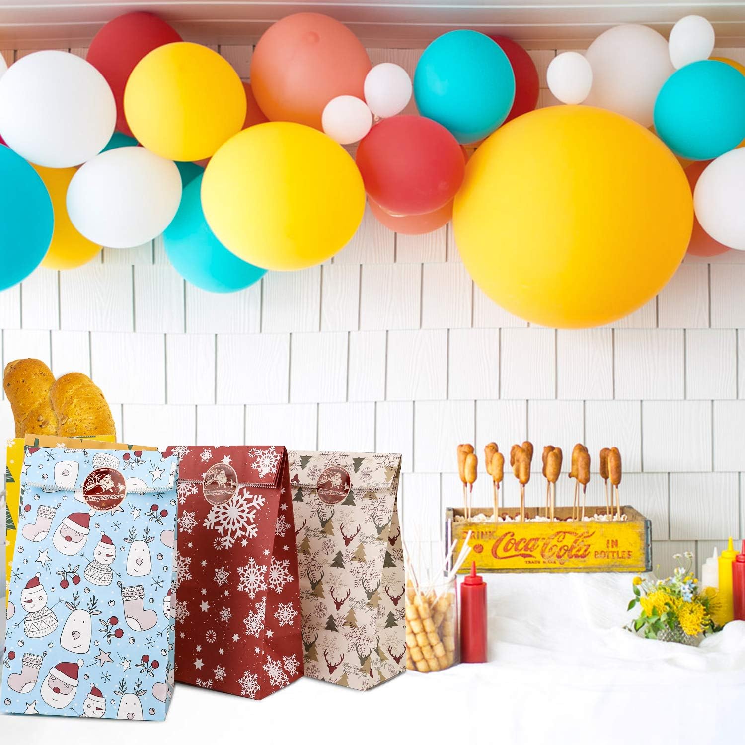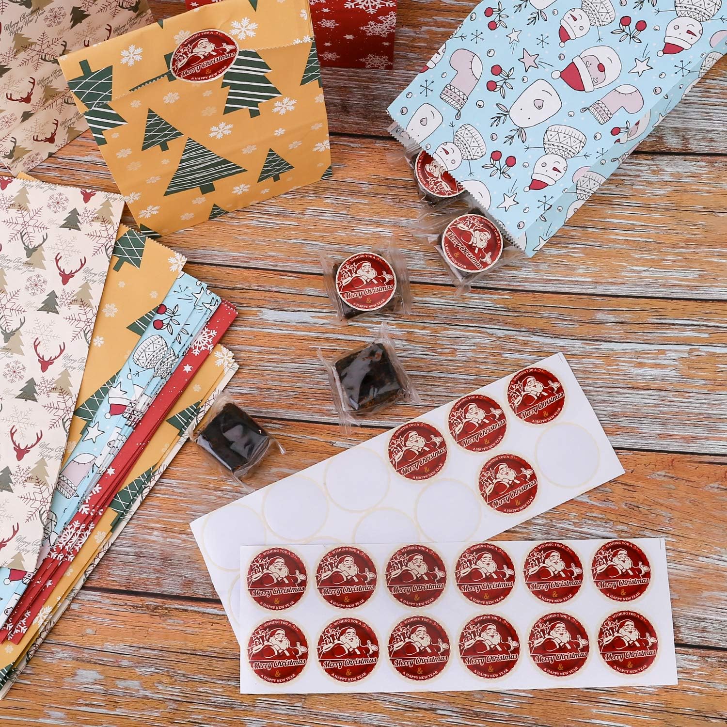 Sacchetti regalo natalizi: tieni questi sacchetti di carta per le vacanze a portata di mano! Sono perfetti per esporre snack e dolcetti fatti in casa, nonché regali di Natale dell'ultimo minuto. Fiocchi di neve, pupazzo di neve, albero di Natale, cervi e altre stampe natalizie, adorerai questi bellissimi e colorati sacchetti regalo in kraft. Dimensioni: 12 x 8 x 22,5 cm / 4,7 x 3,1 x 8,8 pollici. Carino e confezionare i regali è un gioco da ragazzi. I sacchetti regalo di Natale possono contenere diversi tipi di bomboniere come caramelle, biscotti, popcorn e piccoli giocattoli. Alta qualità: ogni sacchetto di carta per feste è realizzato in carta kraft da 70 g/m² e stampato con inchiostro ecologico, resistente e facile da aprire o piegare. Godetevi la festa: con questi graziosi sacchetti regalo di Natale potrete festeggiare in modo ancora più festoso e dare libero sfogo ai vostri regali per la festa! Sugli adesivi sono stampati gli auguri di buone feste. Le persone che apriranno il sacchetto regalo vedranno la benedizione del nuovo anno. Ampia applicazione: questi sacchetti regalo di grande capacità con adesivi sigillati sono perfetti per un bazar di Natale scolastico come regali per le feste e confezioni regalo per gli insegnanti.