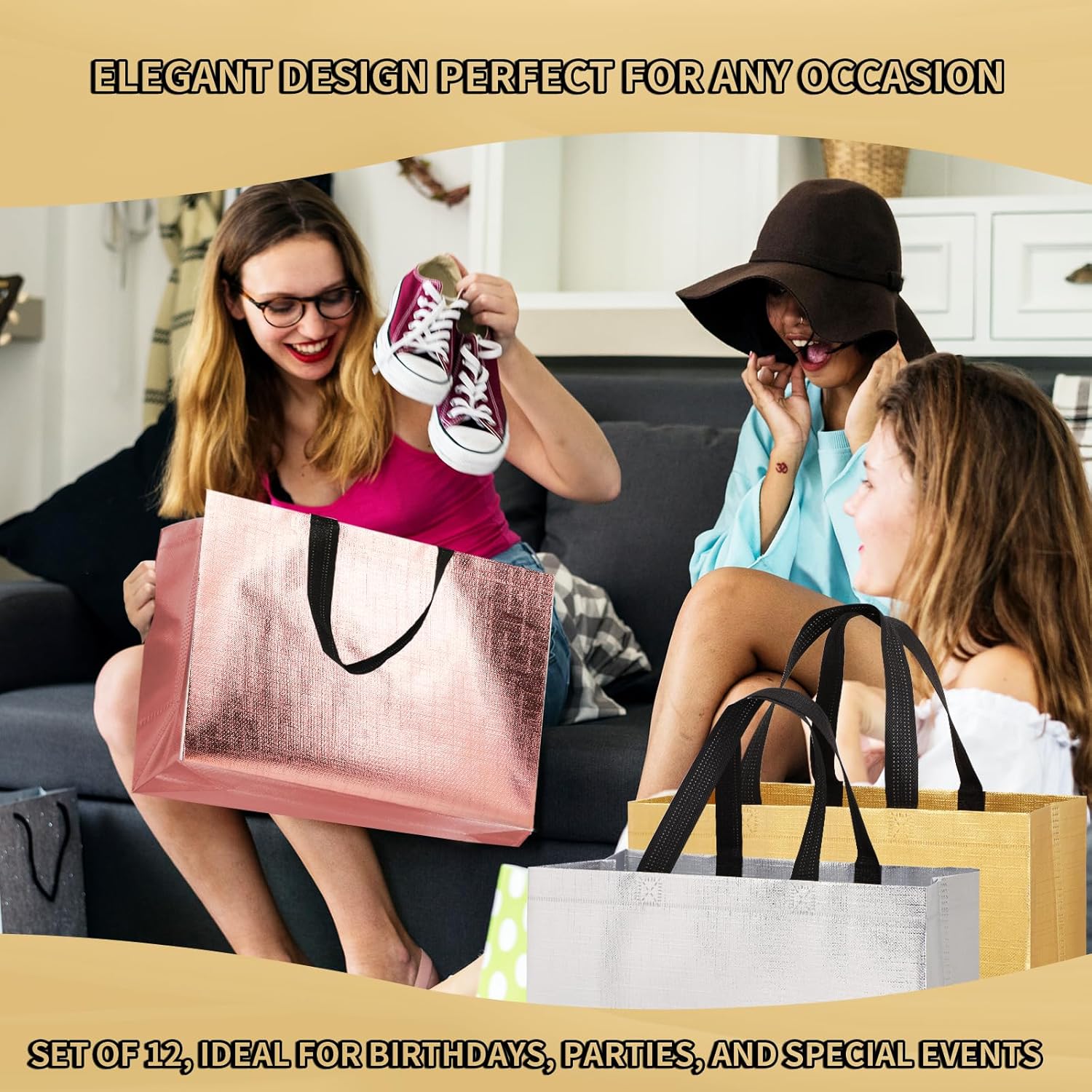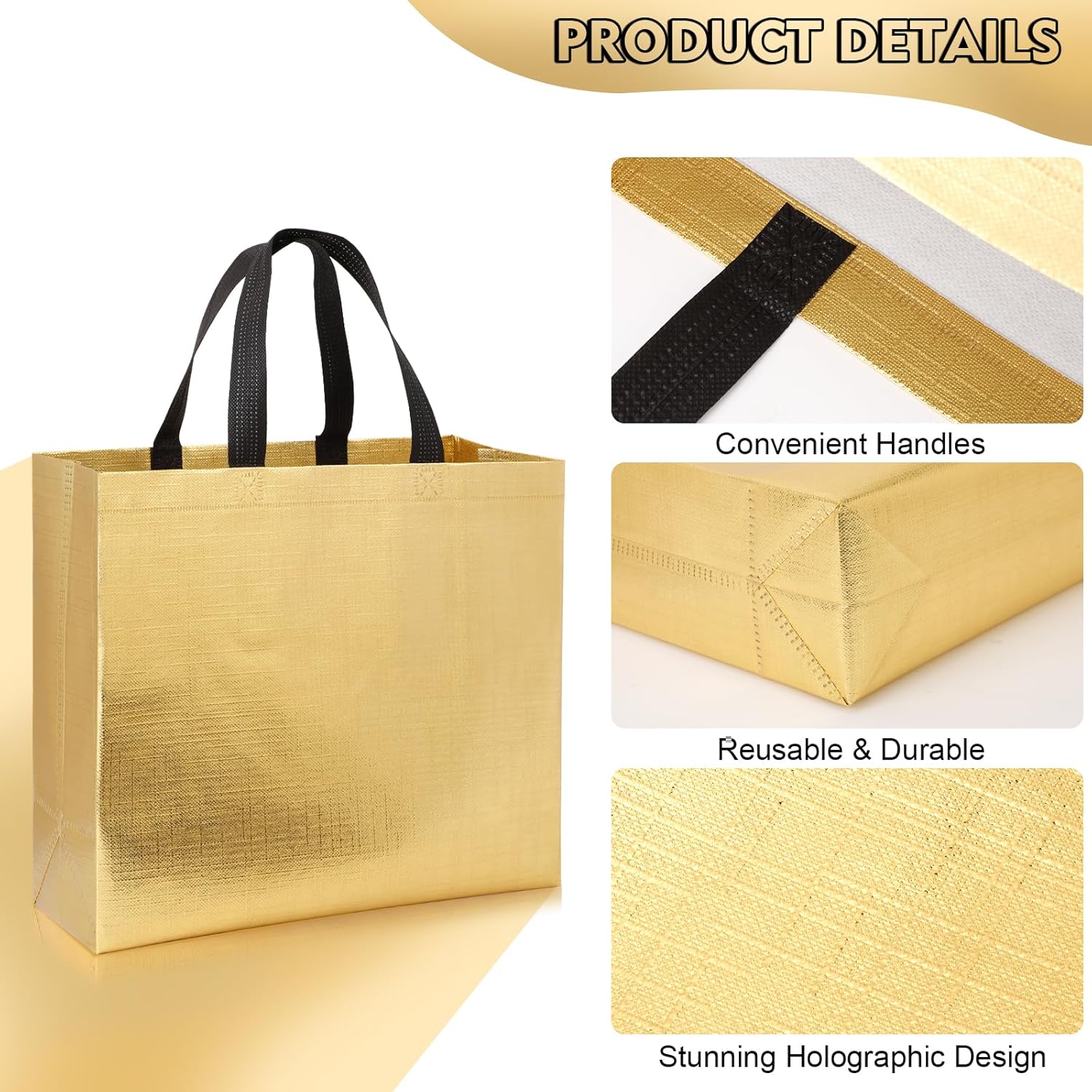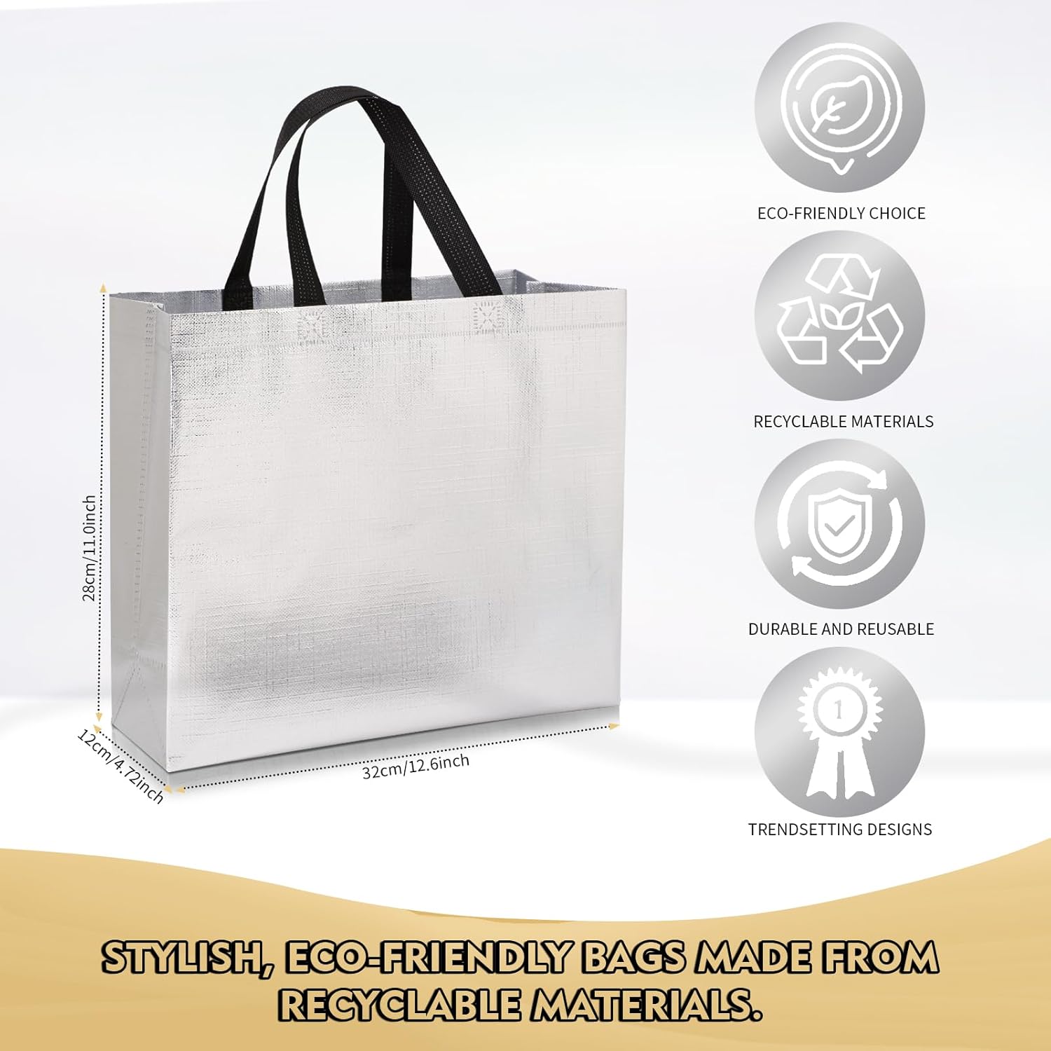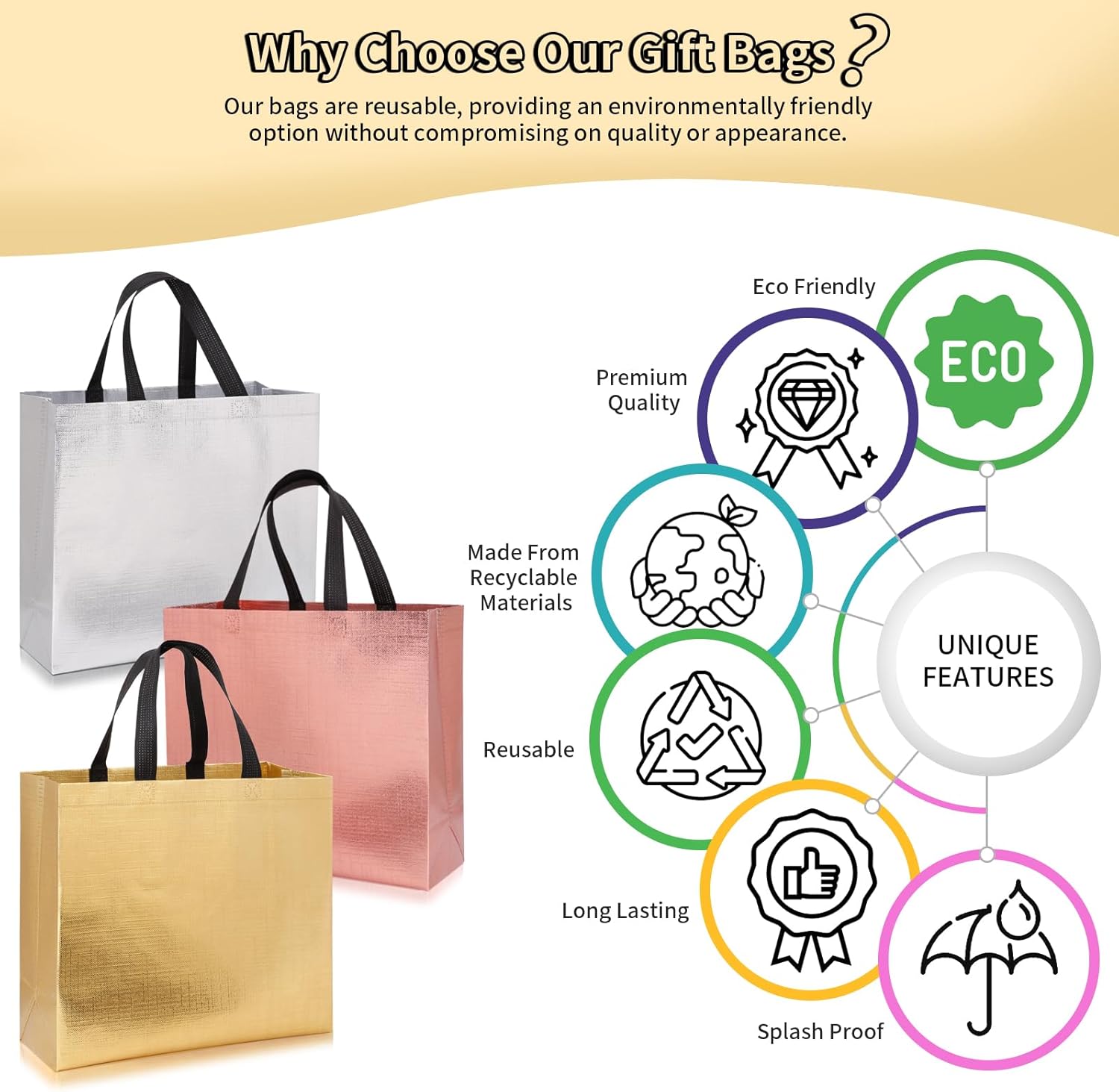FINITURA METALLICA PREMIUM: migliora la tua esperienza di regali con i nostri sacchetti regalo metallici, realizzati con una splendida finitura metallica che trasuda lusso e glamour. Che si tratti di un compleanno, di un matrimonio, di un baby shower o anche di sacchetti regalo di Natale, questi sacchetti regalo di medie dimensioni daranno risalto alla tua celebrazione. SPAZIOSO E VERSATILE: Con dimensioni di 11Lx5Wx13H pollici, i nostri sacchetti per bomboniere offrono ampio spazio per regali, bomboniere, dolcetti e gadget. Perfetti per una varietà di occasioni, dalle riunioni intime alle grandi feste, questi robusti sacchetti regalo sono una scelta versatile per qualsiasi evento, incluso l'uso come sacchetti per feste riutilizzabili, sacchetti regalo per baby shower, sacchetti regalo per matrimoni o sacchetti per addii al nubilato. COMODE MANIGLIE PER UN FACILE TRASPORTO: Progettate con robuste maniglie, le nostre borse regalo riutilizzabili garantiscono un facile trasporto, consentendo agli ospiti di trasportare facilmente regali e dolcetti. Dì addio alla goffa giocoleria tra più oggetti: le nostre borse riutilizzabili facilitano il trasporto. VIBRANTE MIX DI COLORI: i sacchetti regalo in oro rosa trasudano raffinatezza e romanticismo, perfetti per matrimoni e addio al nubilato. I sacchetti regalo in argento forniscono un tocco moderno ed elegante, ideali per eventi aziendali e festeggiamenti di Capodanno. I sacchetti regalo dorati forniscono un bagliore ricco e festoso, perfetto per compleanni, celebrazioni importanti e feste festive. ECOLOGICI E RIUTILIZZABILI: Realizzati in materiale non tessuto di alta qualità, i nostri sacchetti regalo non sono solo durevoli ma anche rispettosi dell'ambiente. Riduci i rifiuti riutilizzando questi sacchetti per feste riutilizzabili per eventi futuri o riciclandoli in modo responsabile quando non sono più necessari. Unisciti a noi per avere un impatto positivo sull'ambiente festeggiando in grande stile con le nostre borse regalo di Natale.