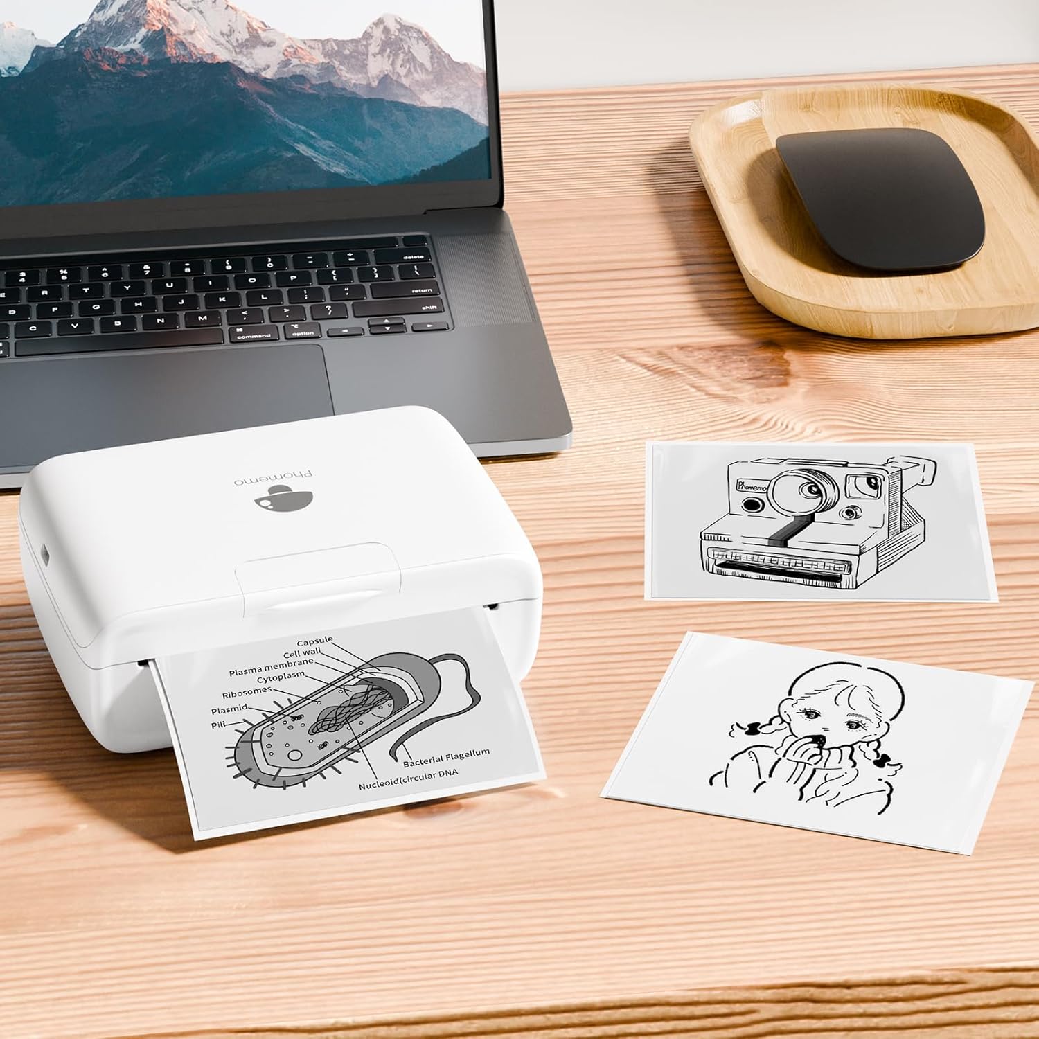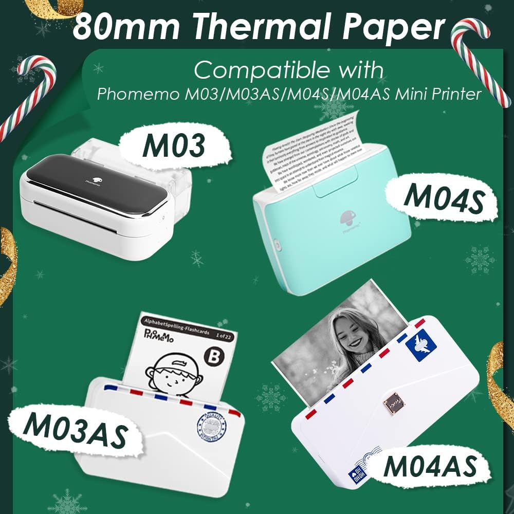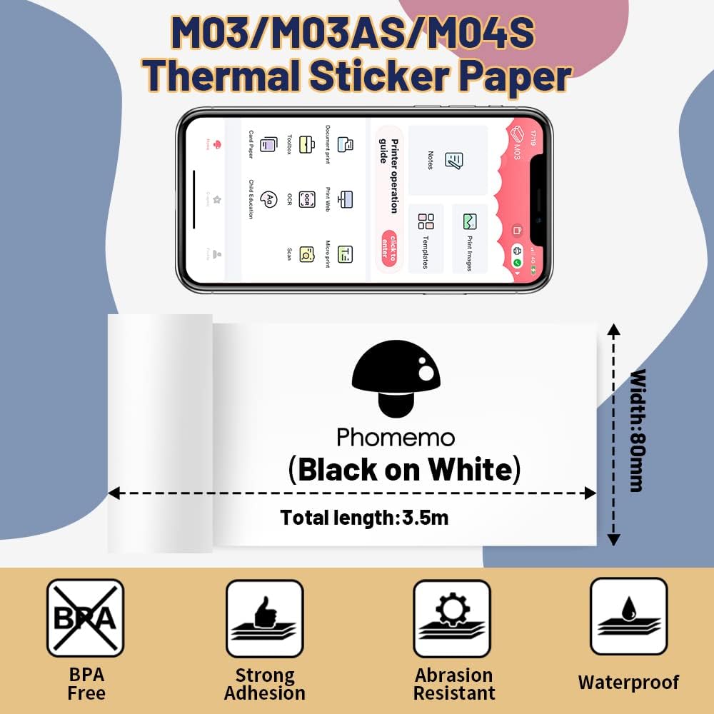 Contenuto della confezione - 3 rotoli di carta adesiva termica autoadesiva Phomemo, dimensioni del prodotto: 80 mm x 3,5 m (3,15" x 137,8"); Compatibile con la mini stampante Phomemo M03/M03AS/M04S/M04AS. 10 anni di conservazione - Lo strato di rivestimento sulla superficie protegge il contenuto dallo sbiadimento o dalla distruzione. Le carte termiche Phomemo M03/M03AS/M04S sono BPA Free, impermeabili, antiolio, antistrappo e antigraffio. Forte adesione: aderisce saldamente a diverse superfici come buste, metallo, PVC, plastica, vetro e legno, ecc. Non cadrà naturalmente. Facile da rimuovere e nessun residuo lasciato - La carta autoadesiva Phomemo M03/M03AS non lascia colla dopo essere stata strappata. Facile da rimuovere. Ampio utilizzo - adatto per album, appunti di studio, foto in bianco e nero di diario di proiettili e artigianato fai-da-te. Testimonia i tuoi risultati nello studio e il tempo meraviglioso nella vita quotidiana.