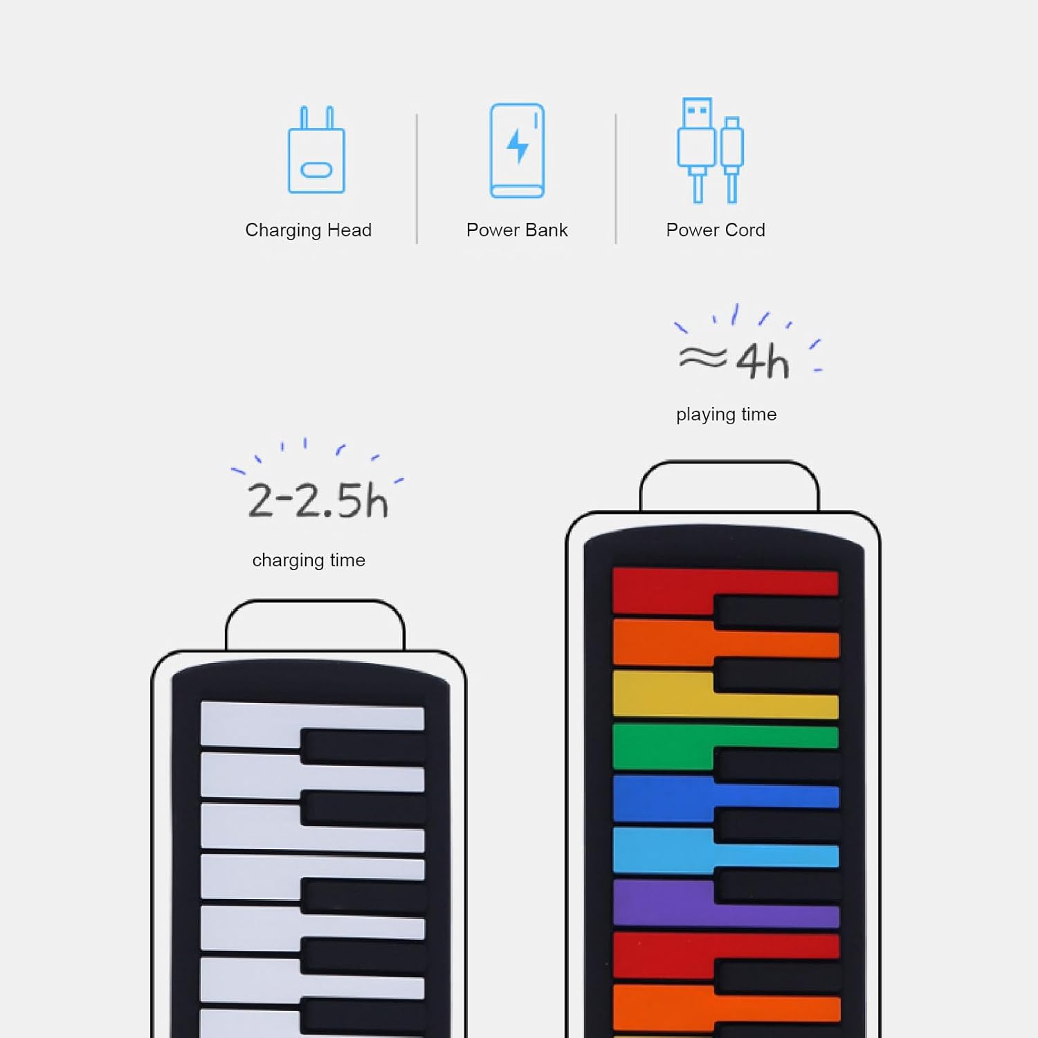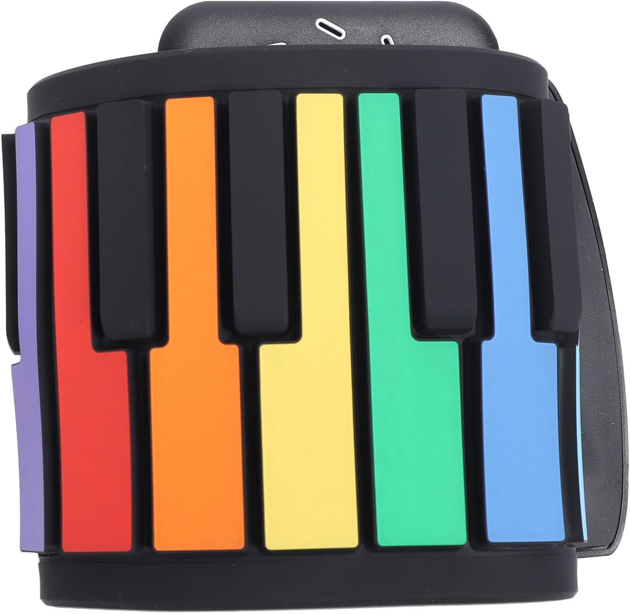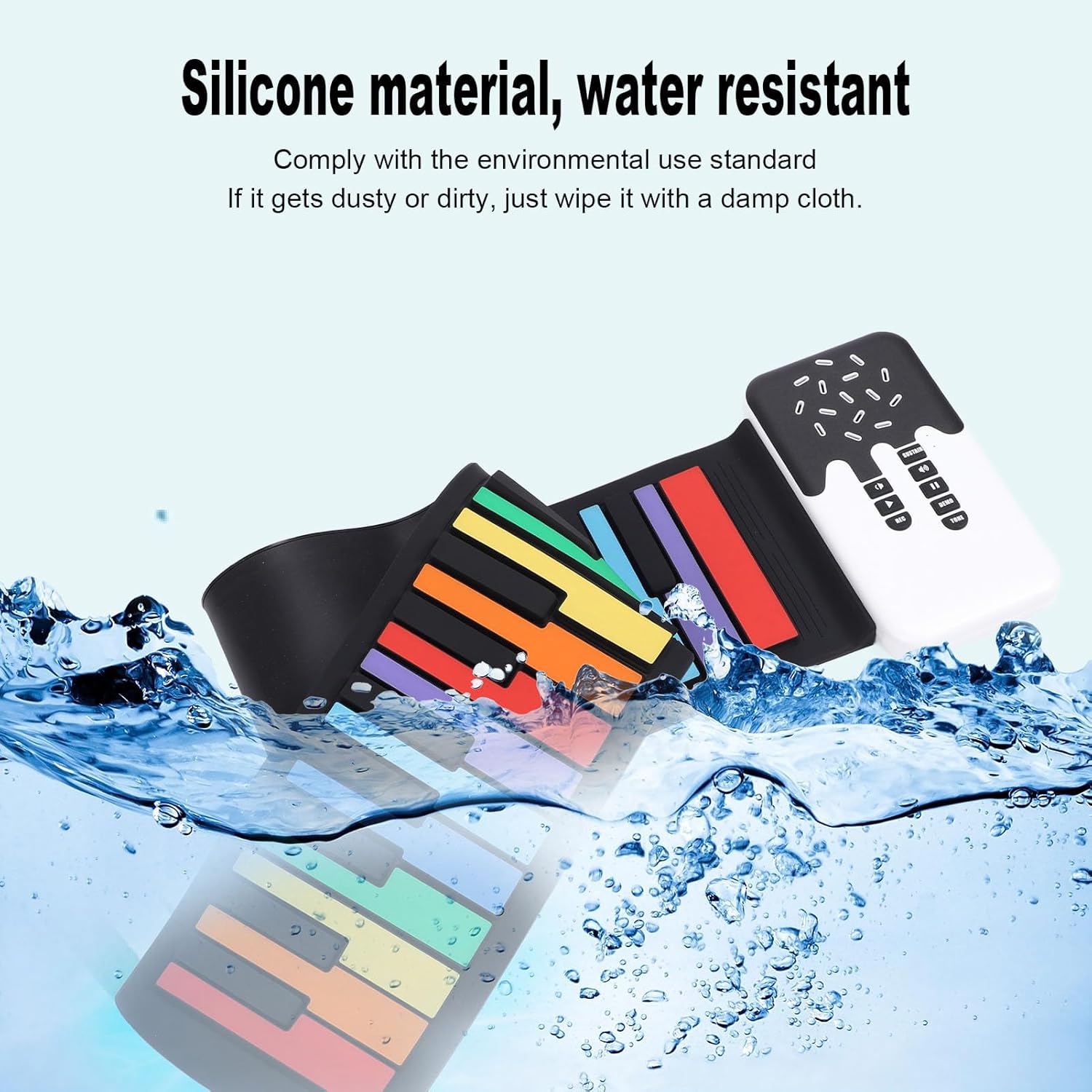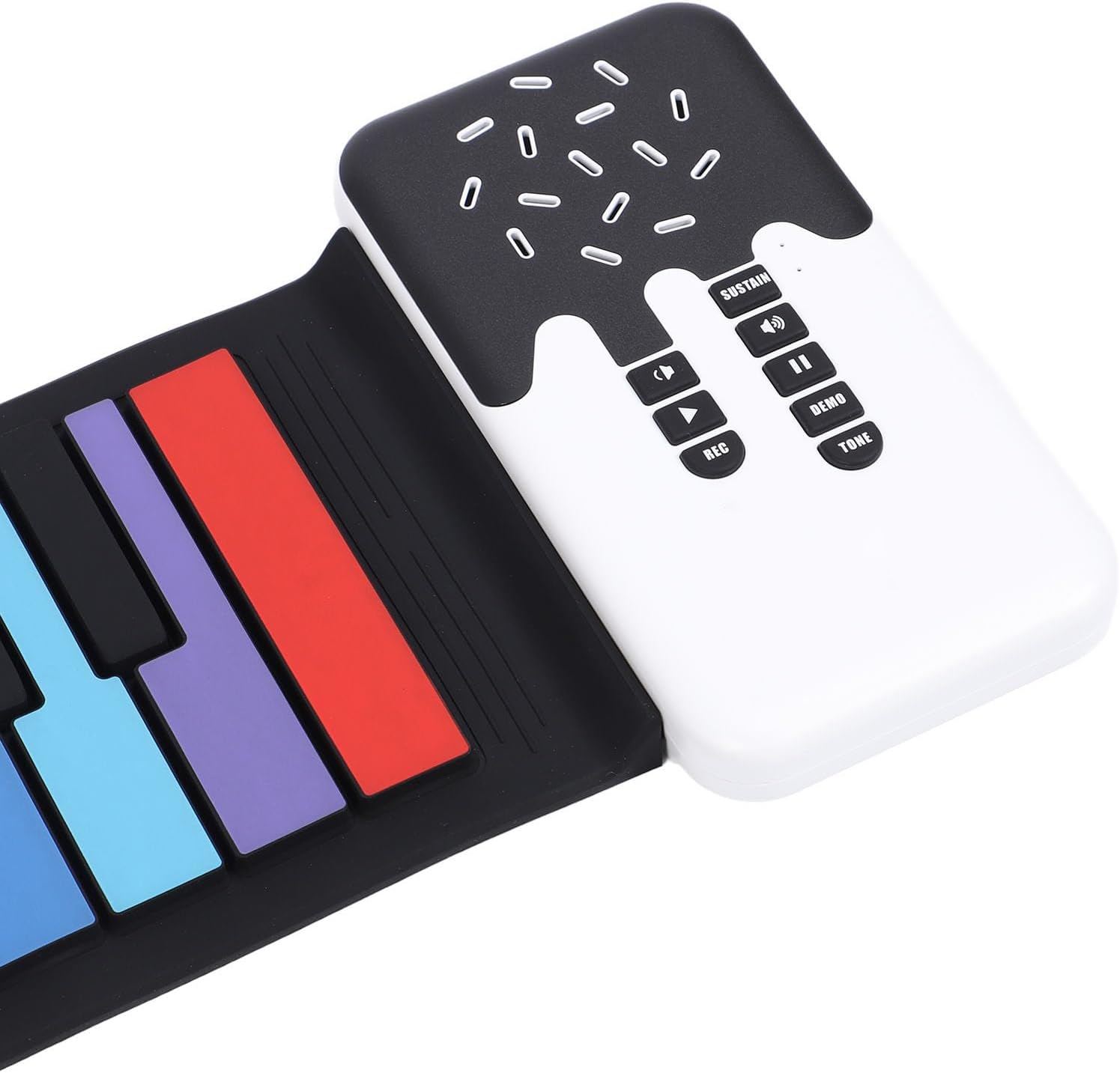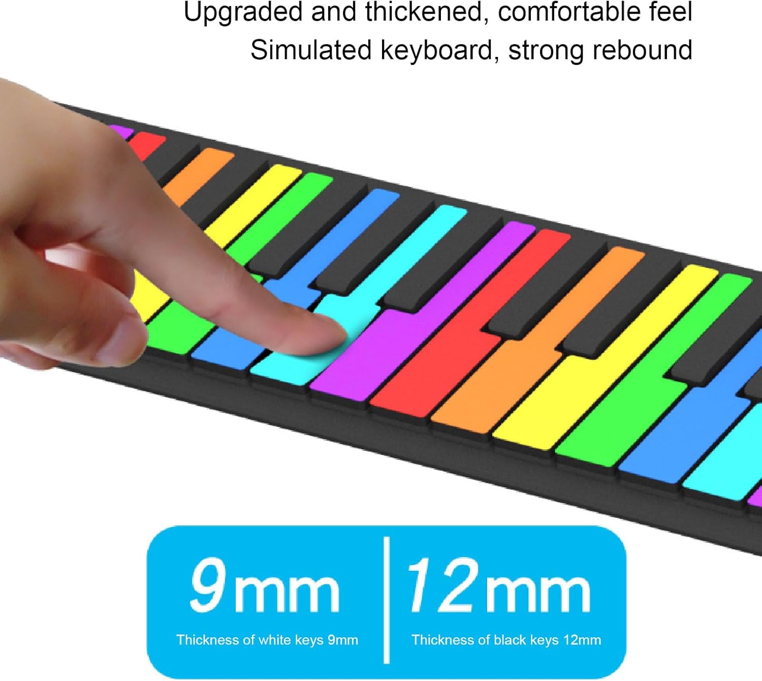Tasti del pianoforte colorati: tastiera del pianoforte pieghevole a 49 tasti con tasti standard colorati, dotata di una tastiera simulata con forte rimbalzo. Con tasti di scelta rapida funzionali per una facile regolazione del ritmo e modalità di sospensione integrata. Sicuro e portatile: realizzato in materiale siliconico sicuro, robusto e resistente all'acqua, leggero e compatto. Questo pianoforte avvolgibile può essere arrotolato per un facile trasporto e stoccaggio. Ampie opzioni audio: 8 toni e 6 brani dimostrativi per imparare e ascoltare la musica classica, con un suono nitido e chiaro attraverso l'altoparlante integrato. Con 49 pulsanti standard, puoi riprodurre tantissimi brani musicali senza occupare spazio. Design ricaricabile: viene fornito con una batteria ricaricabile da 360 mAh e una potenza di uscita di 500 mW. Ideale per principianti e appassionati. Porta questo pianoforte con te ovunque, anche se vai all'aperto, puoi suonare sempre e ovunque. Connettività versatile: può essere collegato a cuffie e altoparlanti esterni, rendendolo adatto a vari ambienti di gioco. Il morbido tappetino per pianoforte è flessibile e può essere facilmente srotolato mentre si suona, arrotolato nuovamente dopo aver suonato e riposto nello zaino.