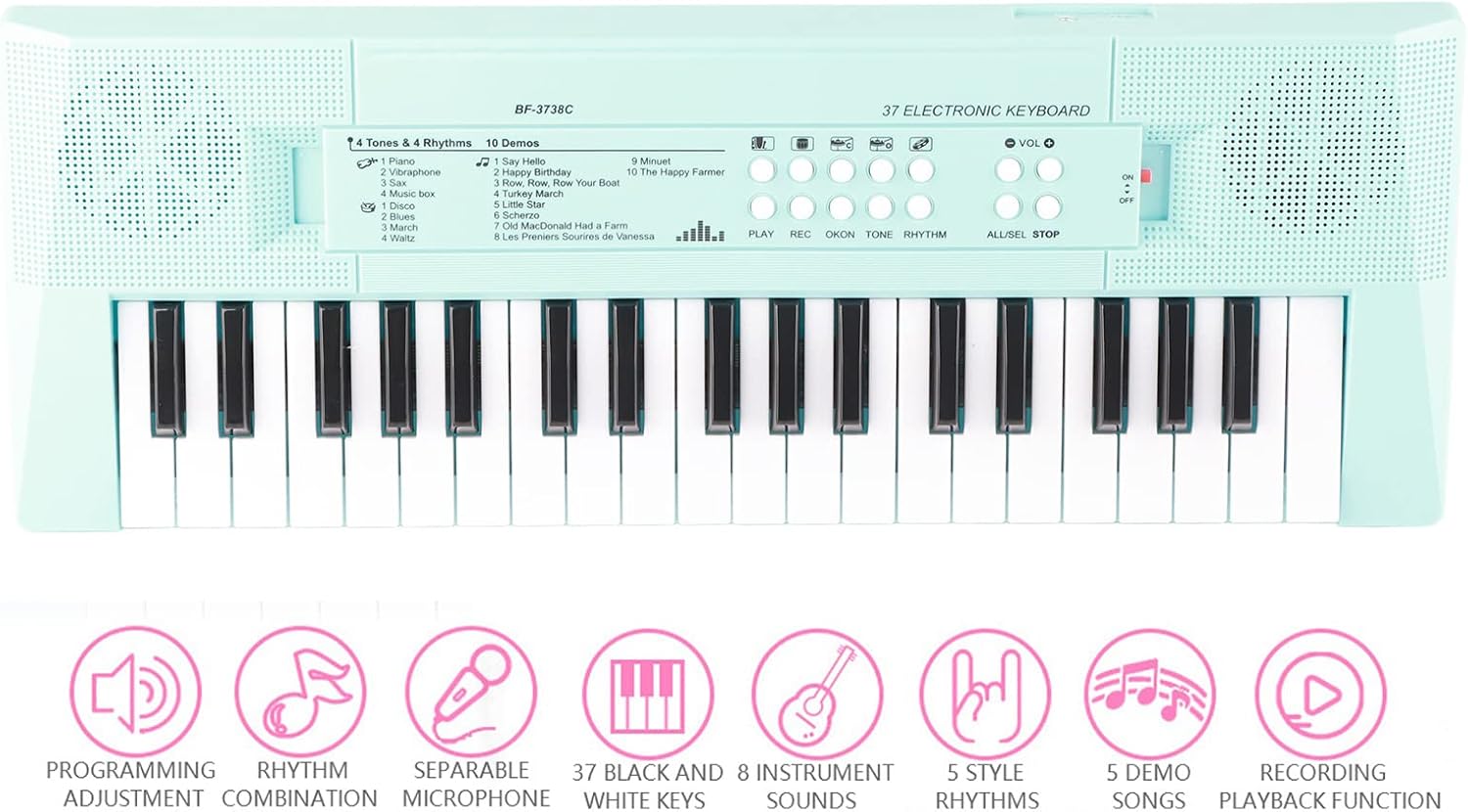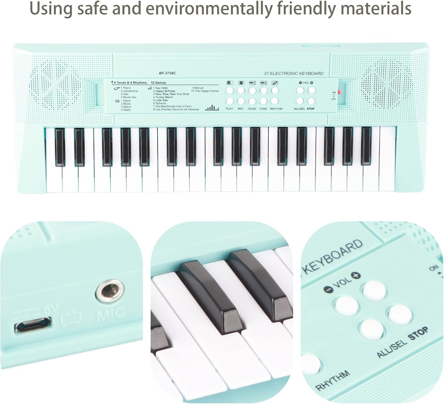 ★★★ Utilizzare materiali sicuri e rispettosi dell'ambiente, buona fattura e bordi lisci che non danneggino le dita dei bambini. Non usiamo mai materiali di qualità inferiore. Non è tossico e inodore e non nuoce alla salute dei bambini. ★★★ Questo pianoforte ha 2 toni, 16 canzoni, 4 ritmi, 4 percussioni e un volume di musica regolabile. Questo è il miglior per i bambini. (Nota: questo prodotto è appositamente progettato per bambini e principianti. Gli adulti consigliano di acquistare pianoforti di livello professionale.) ★★★ Il pianoforte ha un microfono che puoi cantare mentre suoni il pianoforte e la sua funzione di registrazione che ti consente di registrare la tua voce in qualsiasi momento. Registra l'infanzia del bambino. ★★★ Le dimensioni portatili e il a doppia alimentazione (ricarica USB o 3 batterie AA da 1,5 V) lo rendono molto conveniente sia per uso esterno che interno. ★★★ Il prodotto offre intrattenimento e divertimento musicale per tutte le età ed è ottimo anche per principianti e musicisti.