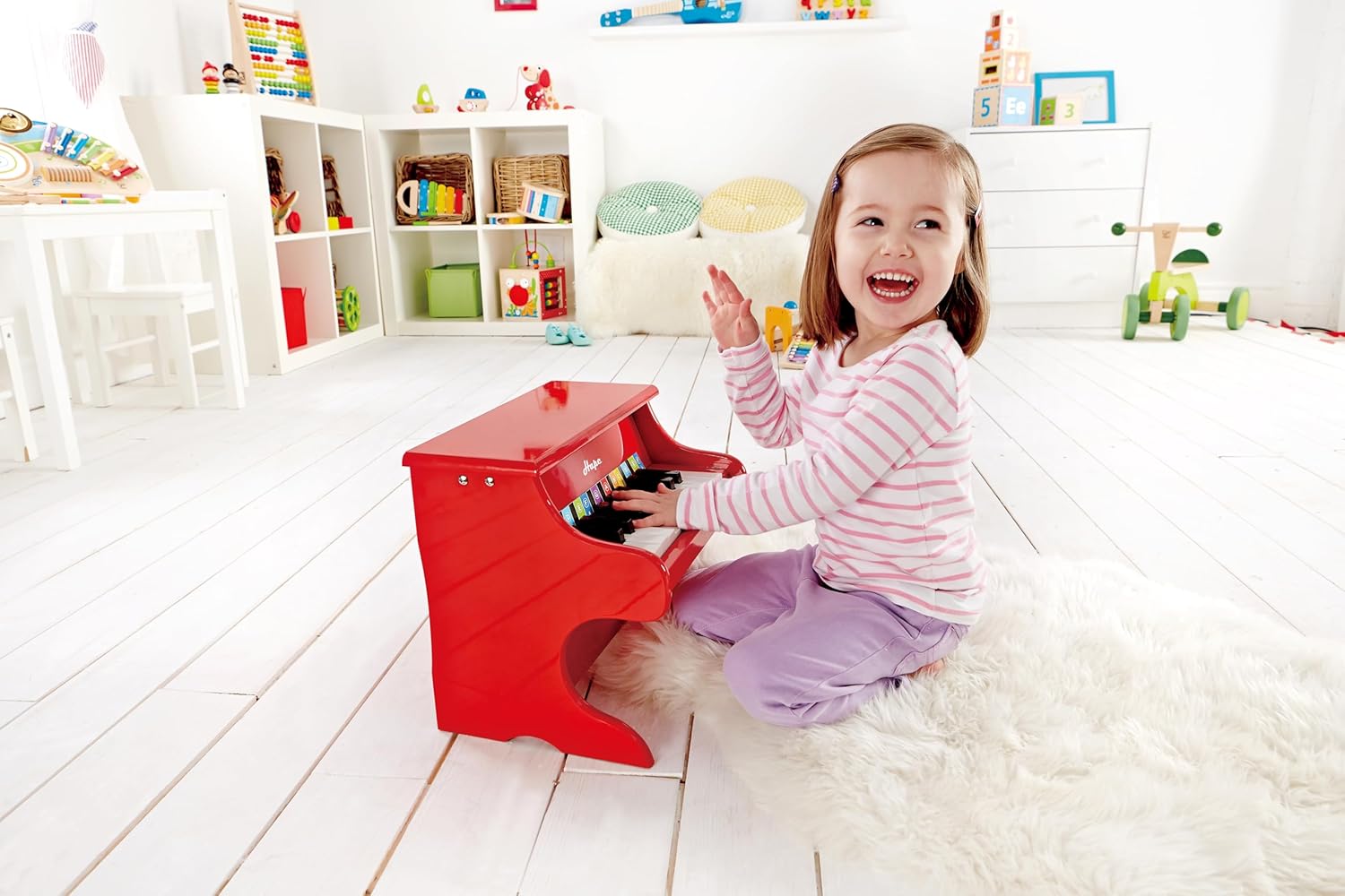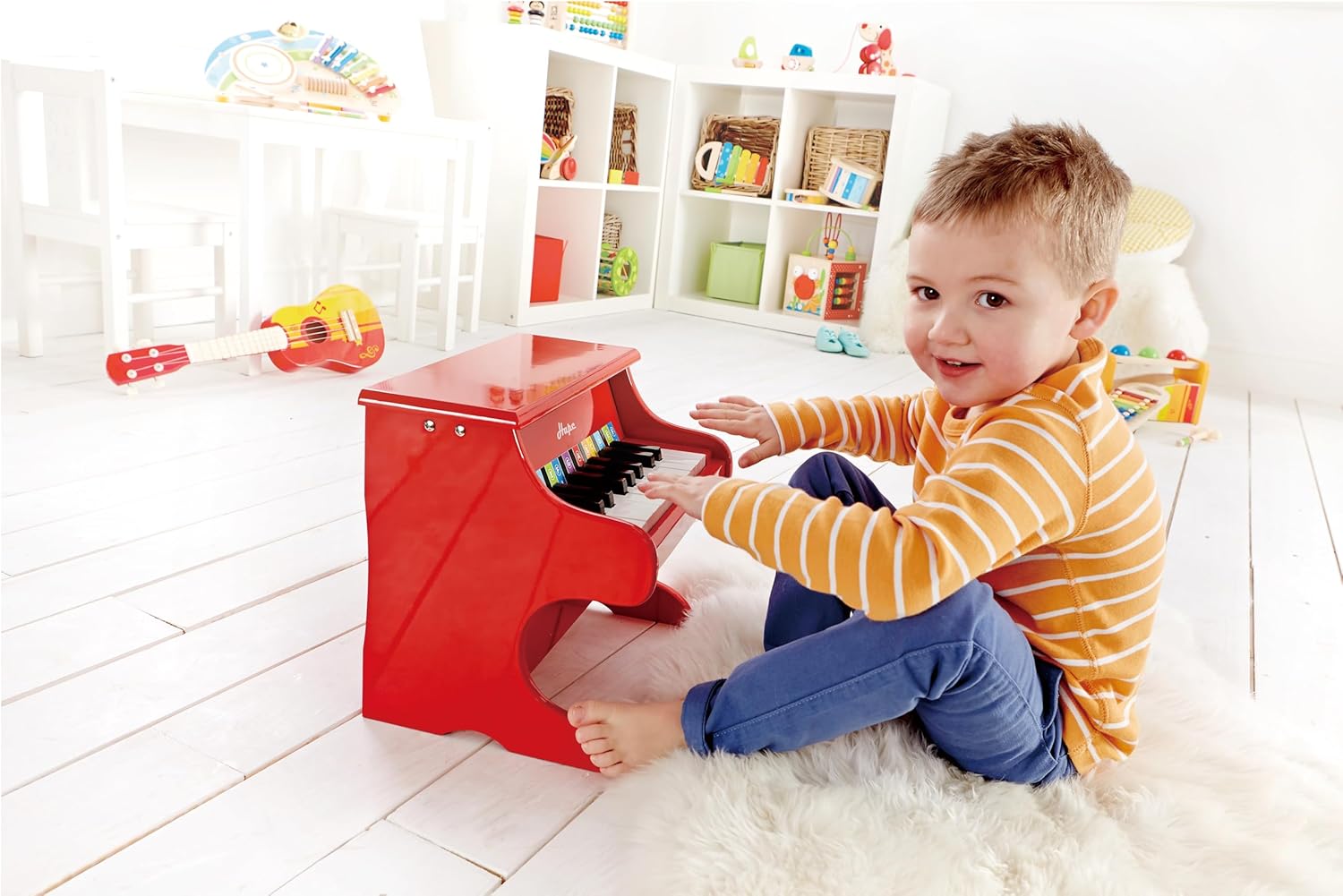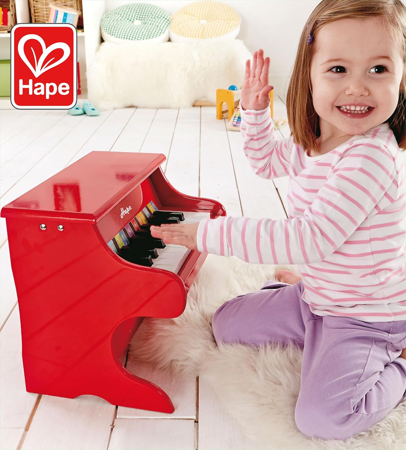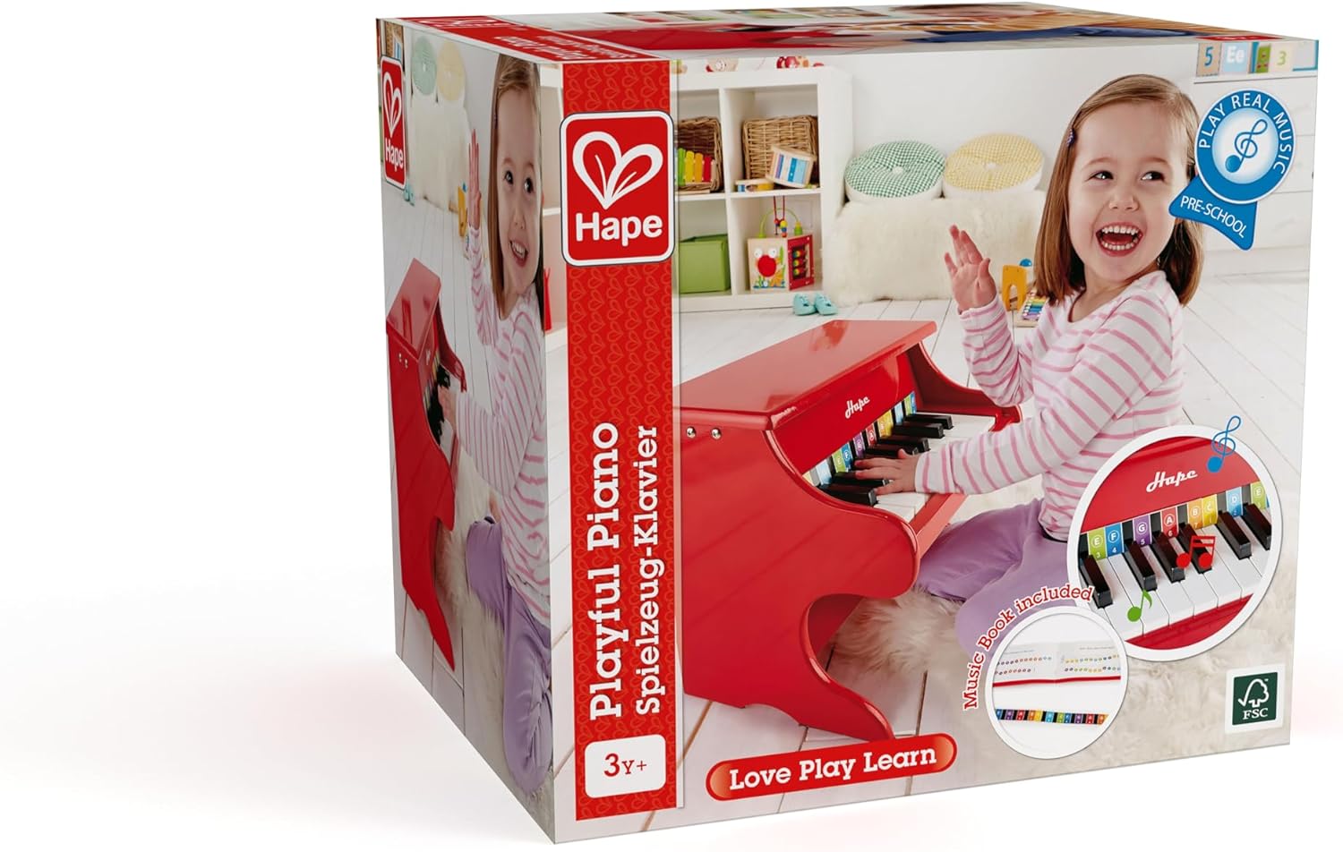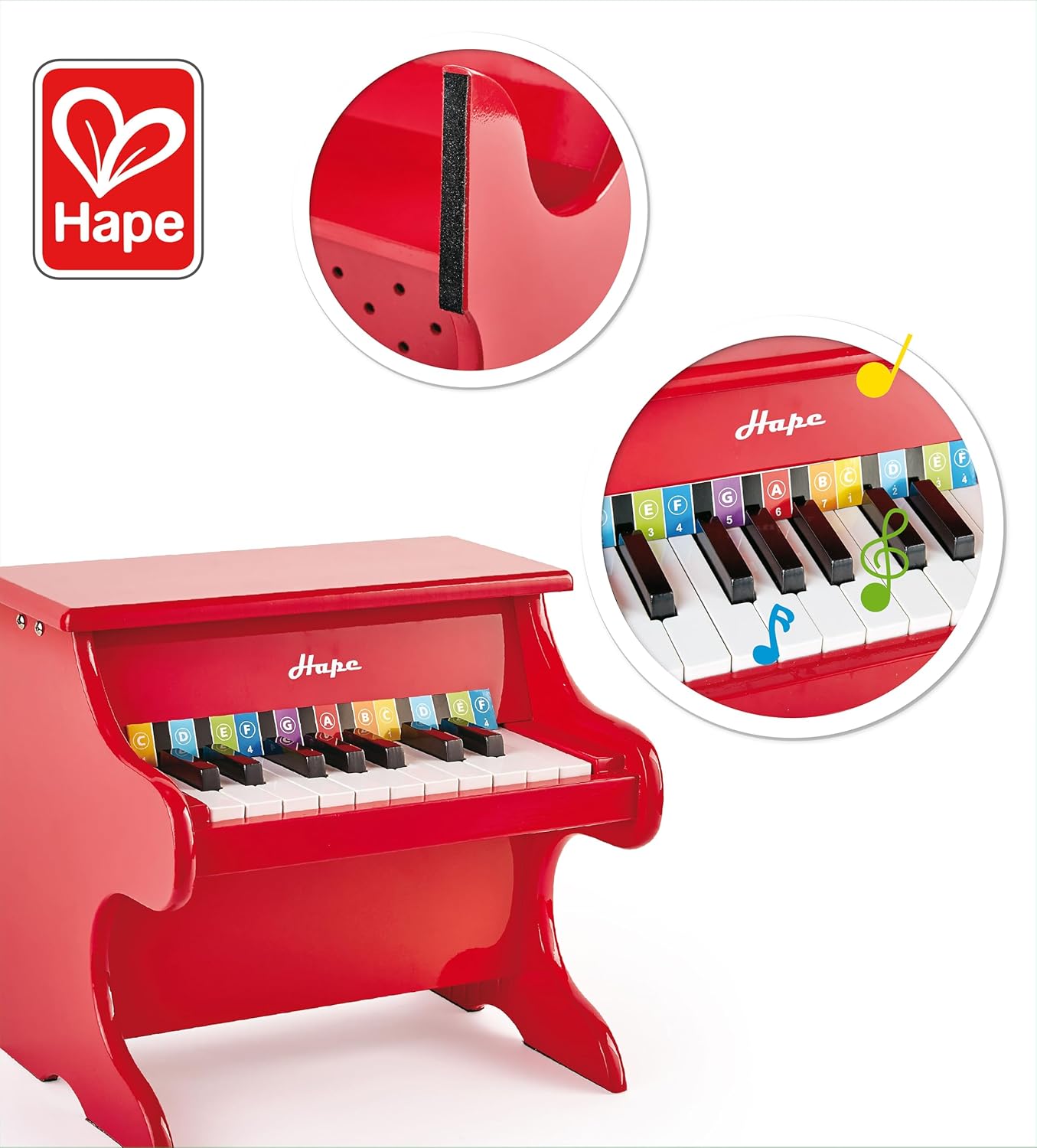 INTRODURRE IL BAMBINO ALLA MUSICA ATTRAVERSO IL GIOCO: Con l'adorabile mini pianoforte rosso in legno, la curiosità del bambino verso l'apprendimento di uno strumento musicale viene risvegliata fin dalla tenera età SVILUPPO DI VARIE COMPETENZE: Le capacità uditive e creative del bambino vengono promosse con il robusto pianoforte giocattolo PROMUOVE LA MUSICALITÀ: Con l'aiuto del pianoforte giocattolo, il bambino allena le basi con ritmo, note, tasti e altre tecniche musicali PIANOFORTE A 18 TASTI CON COLORATI STRISCIA MUSICALE: Il pianoforte giocattolo di Hape ha 18 tasti a misura di bambino e gli accessori includono una striscia musicale colorata per rendere più facile per il bambino imparare le note e le scale sul pianoforte NON NECESSITA DI ACCORDATURA: Il pianoforte giocattolo completamente funzionale non ha bisogno di essere accordato e viene fornito con un pratico libro di musica ETÀ CONSIGLIATA: dai 3 anni