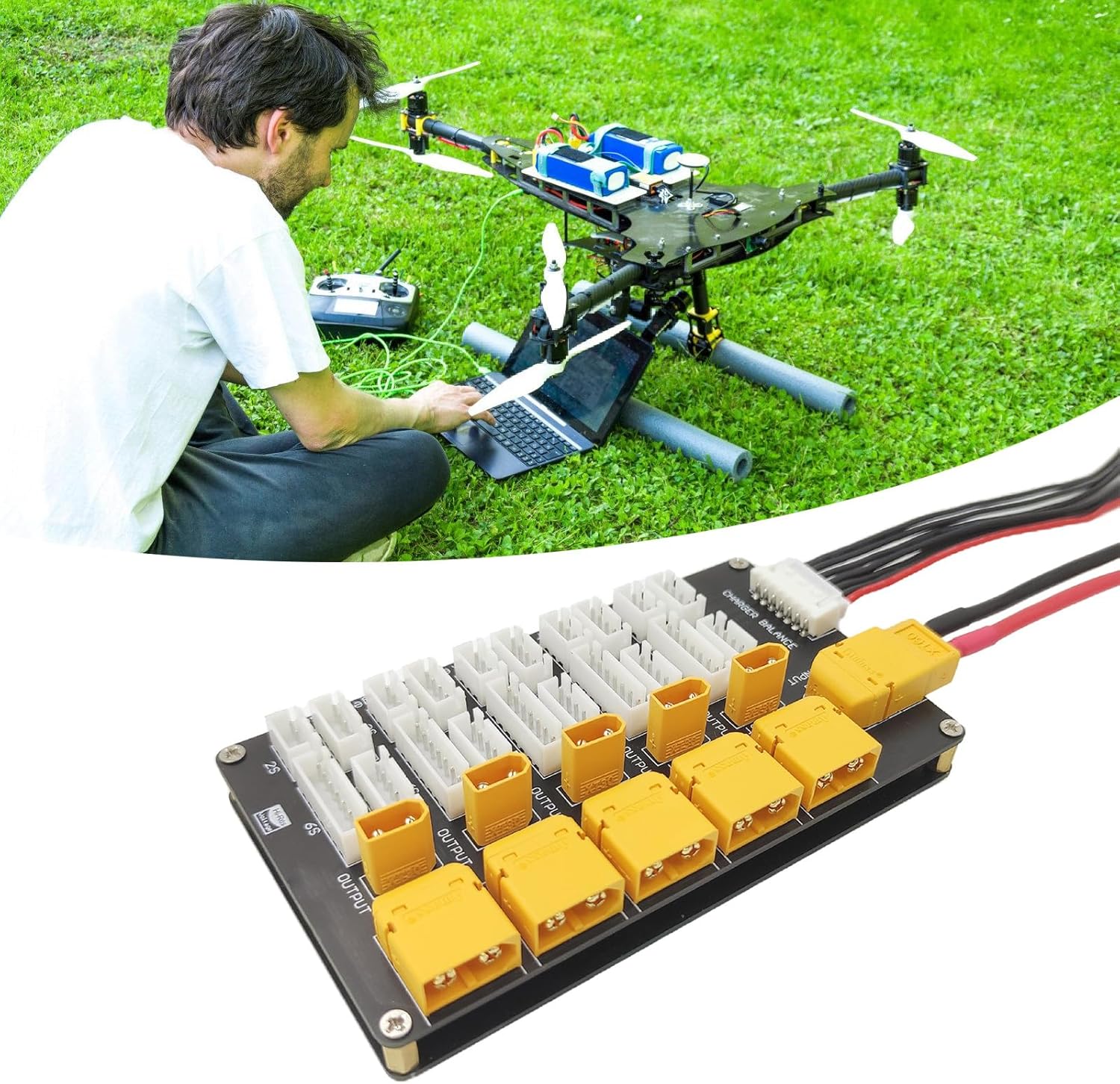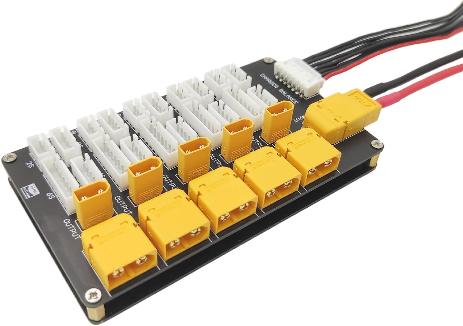 Ricarica efficiente ed equilibrata sulla piastra di ricarica della batteria 5 gruppi di 2, 5 gruppi di 3S, 5 gruppi di 4S, 5 gruppi di 5, o 5 gruppi di 6S, o 5 gruppi per caricare parallelo bilanciato allo stesso tempo Questa piastra di ricarica ha meccanismi di protezione tra cui protezione da sovracorrente, sovratensione e cortocircuito nei connettori XT30 e XT60 per uso generale su vari modelli di dispositivi aeromobili Carico generale bilanciato sul mercato per caricare 5 gruppi di batterie 2-6S accanto allo stesso numero di sezioni dello stesso tipo Per batterie 2-6S, assicurarsi che ogni cella sia carica uniformemente per estendere il servizio della batteria