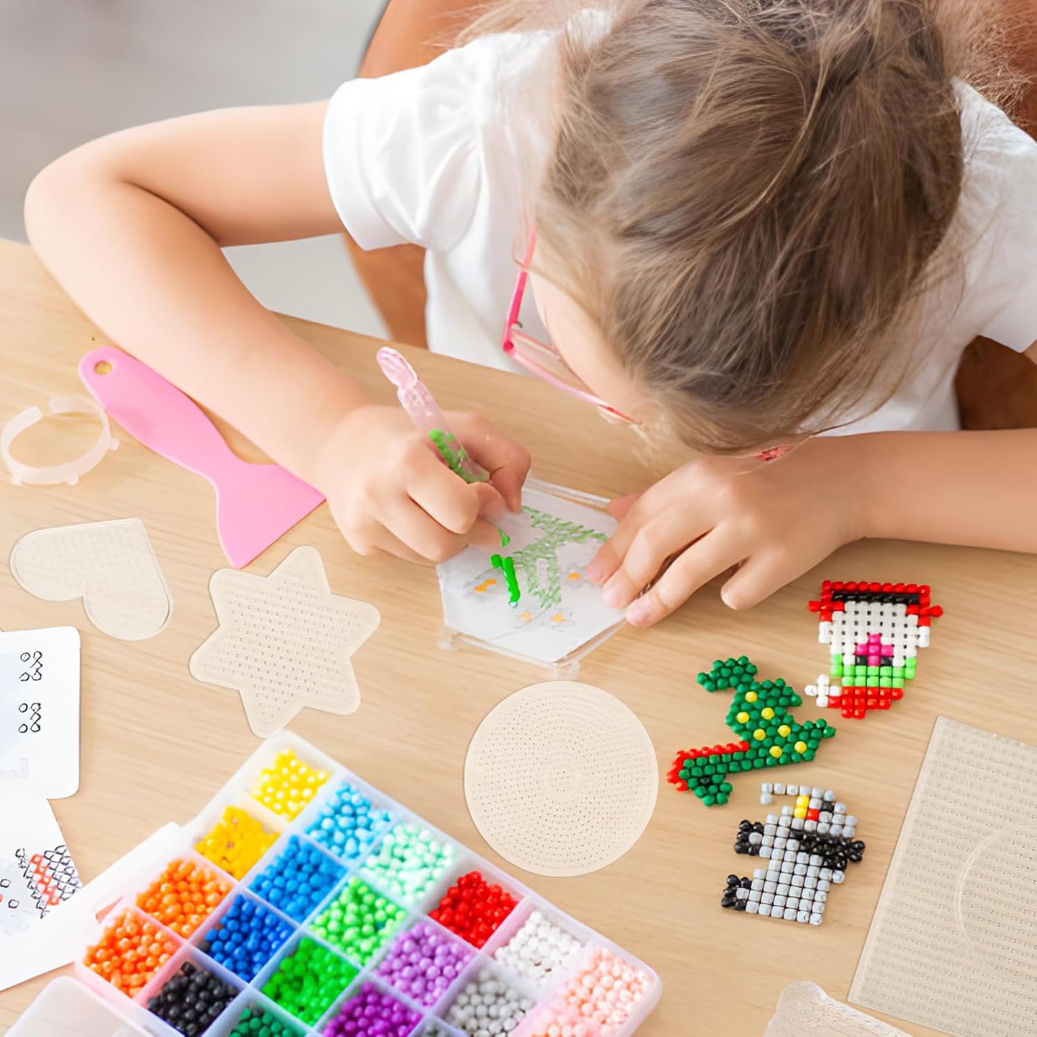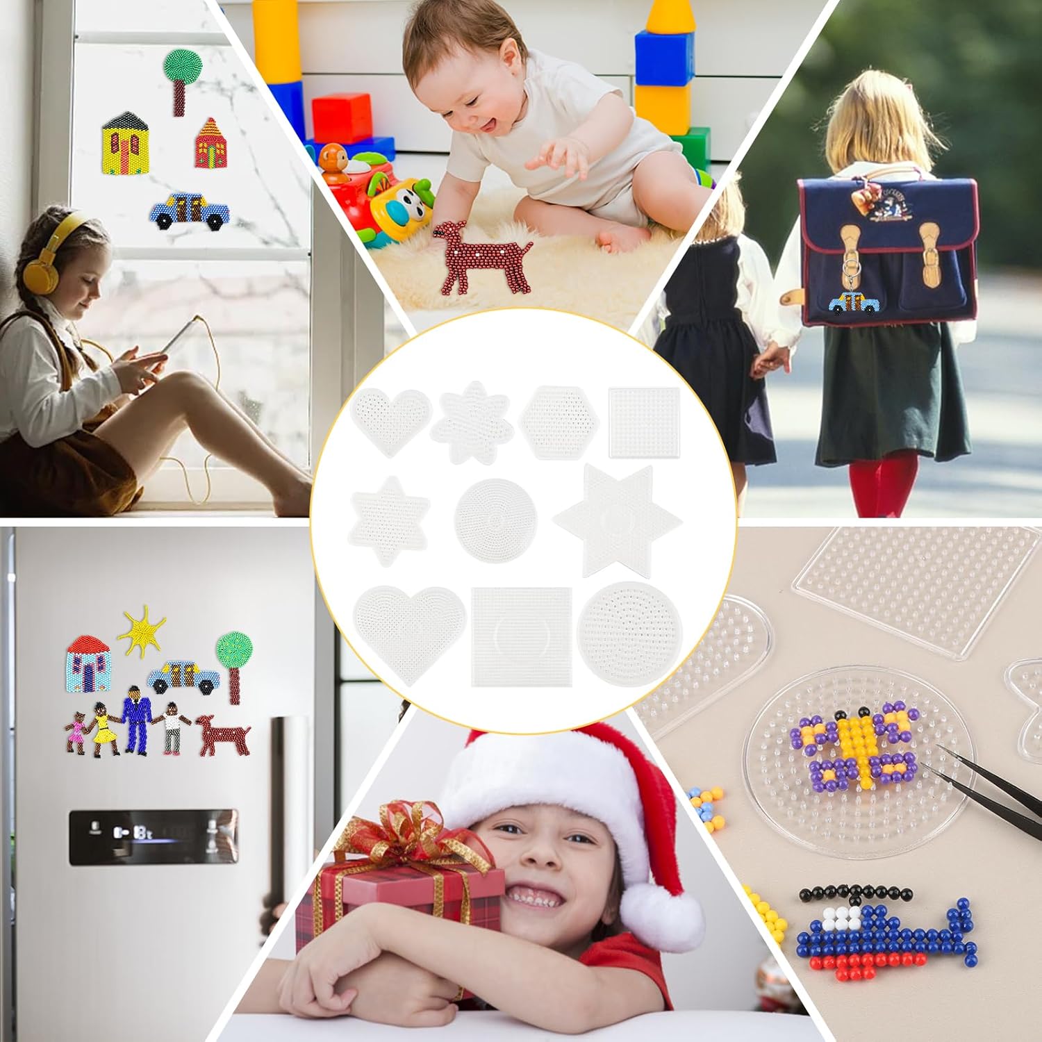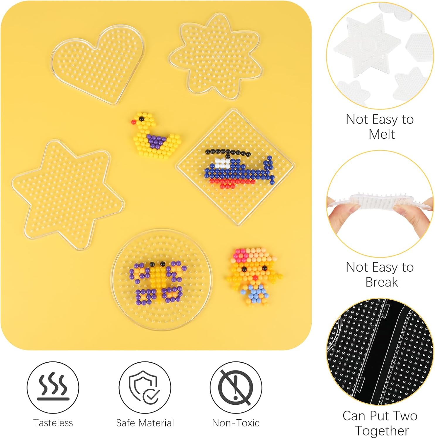 【CONTENUTO DELLA CONFEZIONE】: Il kit asse da stiro contiene 10 assi traforate trasparenti, di cui 1 cerchio grande, 1 quadrato grande, 1 cuore grande, 1 stella grande a sei punte, 1 cerchio piccolo, 1 quadrato piccolo, 1 cuore piccolo, 1 stella piccola a sei punte, 1 fiore piccolo a sette punte, diverse forme e dimensioni. L'asse da stiro può soddisfare le diverse esigenze. 【MATERIALE DI ALTA QUALITÀ】: Questi stampini per perline da stiro sono realizzati in plastica di alta qualità, atossica e inodore, ben fatti, durevoli e pratici, con una formula sana che è sicura per i bambini, le perline da stiro con piastra plug-in non sono facili da rompere, sciogliere o piegare durante la stiratura. Oltre alla forma delle perle da stiro, l'asse può essere utilizzato per stirare perle da 5 mm. Facile da usare: i bambini possono liberare la loro immaginazione e progettare modelli diversi, disporre le perline sull'asse da stiro, coprire la carta da stiro, sciogliere le perline con il ferro, girare il materiale da disegno, stirare l'altro lato e attendere che si raffreddi. Le perline possono essere assemblate per formare un'immagine di perline stirate più grande. 【Multifunzione】: questi modelli di perline da stiro possono migliorare l'abilità manipolativa, la coordinazione e la capacità di pensiero tridimensionale dei bambini e promuovere la loro creatività e immaginazione. Genitori e bambini possono anche provare a utilizzare diversi accessori divertenti per realizzare oggetti più creativi e aiutarli a migliorare le loro abilità artigianali. Regalo perfetto: le piastre con perline in ferro vengono solitamente utilizzate per realizzare portachiavi, pendenti per cellulari, spille e tutti i tipi di bellissime opere d'arte e pendenti. Non è solo un must per i produttori di perline, ma anche un regalo perfetto per la famiglia, i bambini e gli amici. Puoi divertirti moltissimo quando giochi e interagisci con loro.