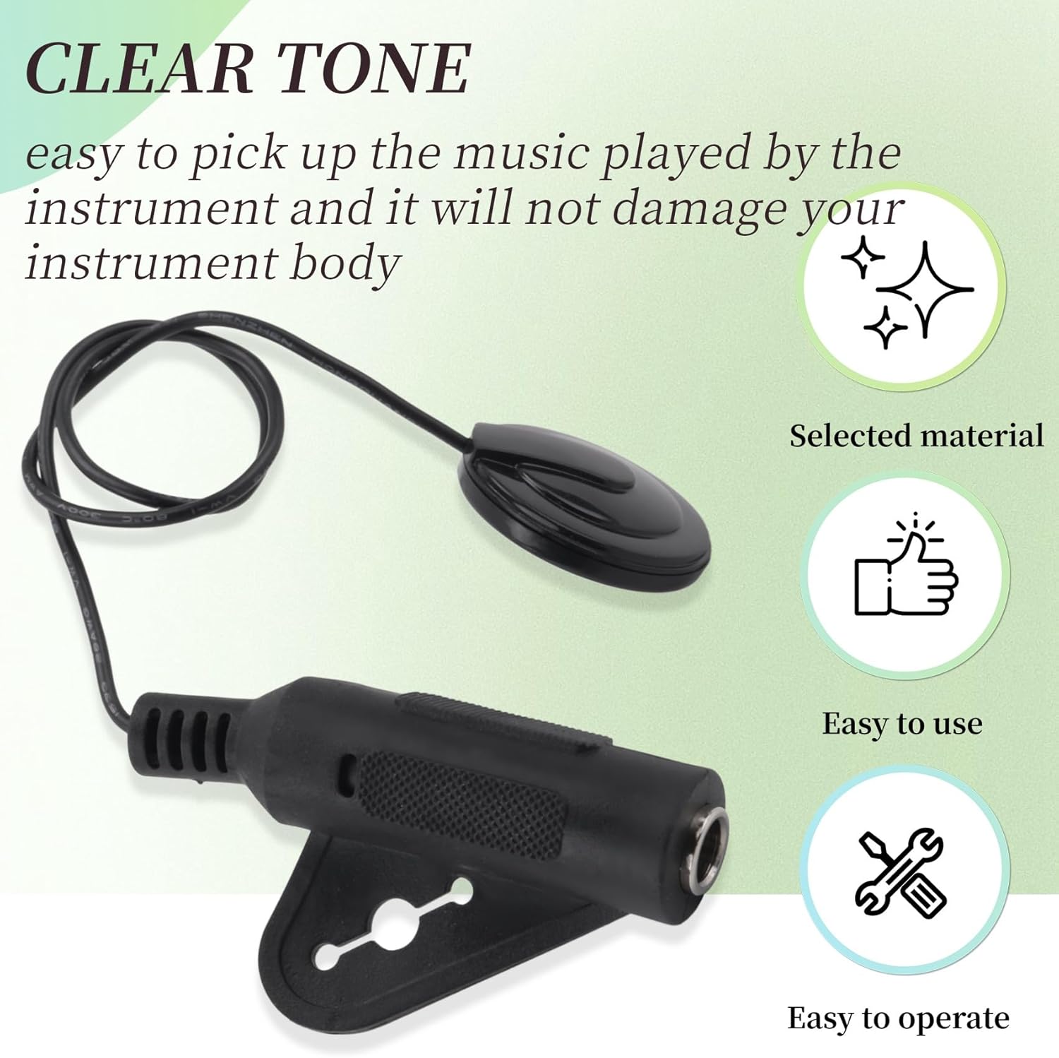 Facile da installare, può essere incollato con autoadesivo che può essere riutilizzato Nessun foro batteria necessaria suoni il tuo strumento, devi solo attaccare questo pickup sul tuo strumento e raccogliere facilmente la musica suonata dallo strumento e non danneggerà il tuo corpo dello strumento, puoi goderti le perfette sensazioni di suonare allo stesso tempo. Tono , suono non fangoso Mini design, leggero e compatto, soprattutto stai per partecipare a una performance, puoi metterlo nella borsa della chitarra che è conveniente, o magari portarlo ovunque tu voglia.