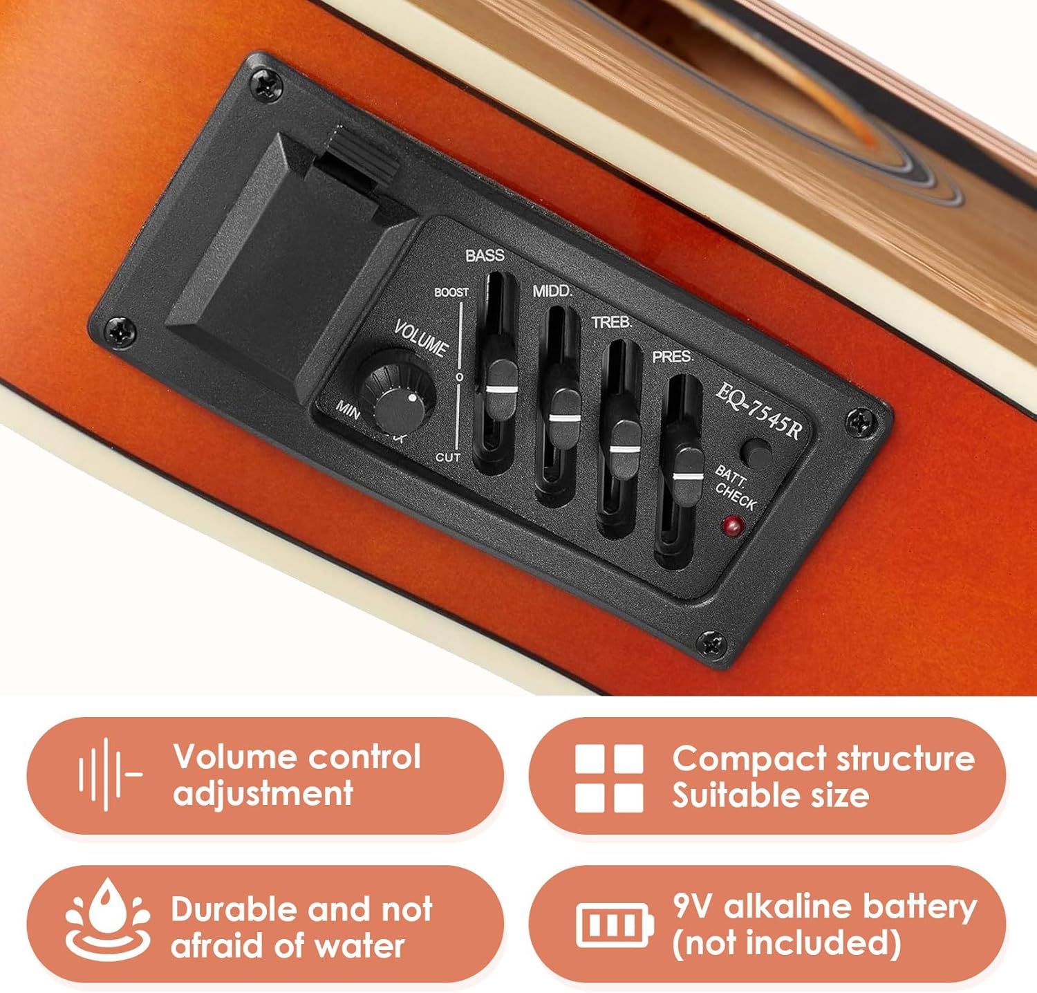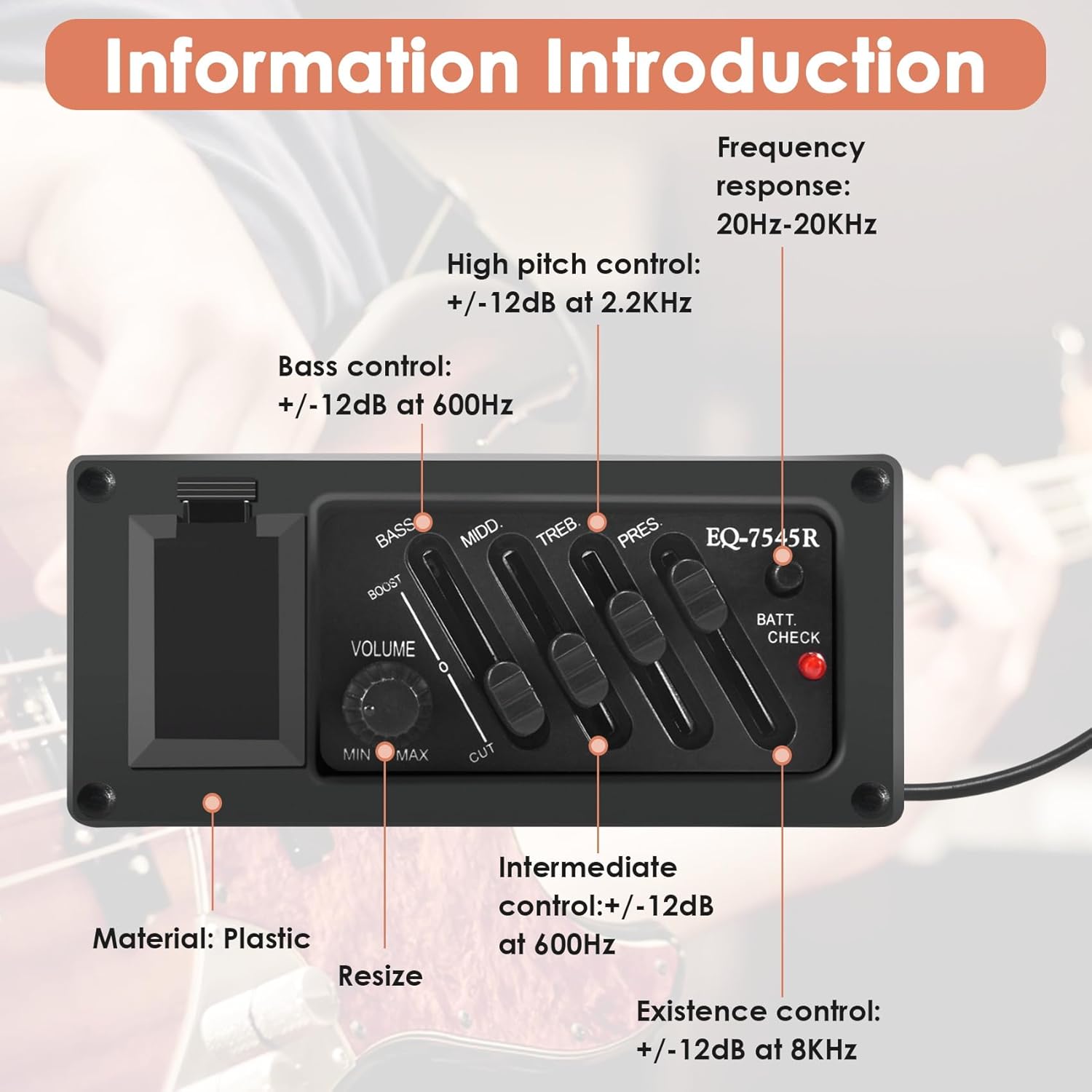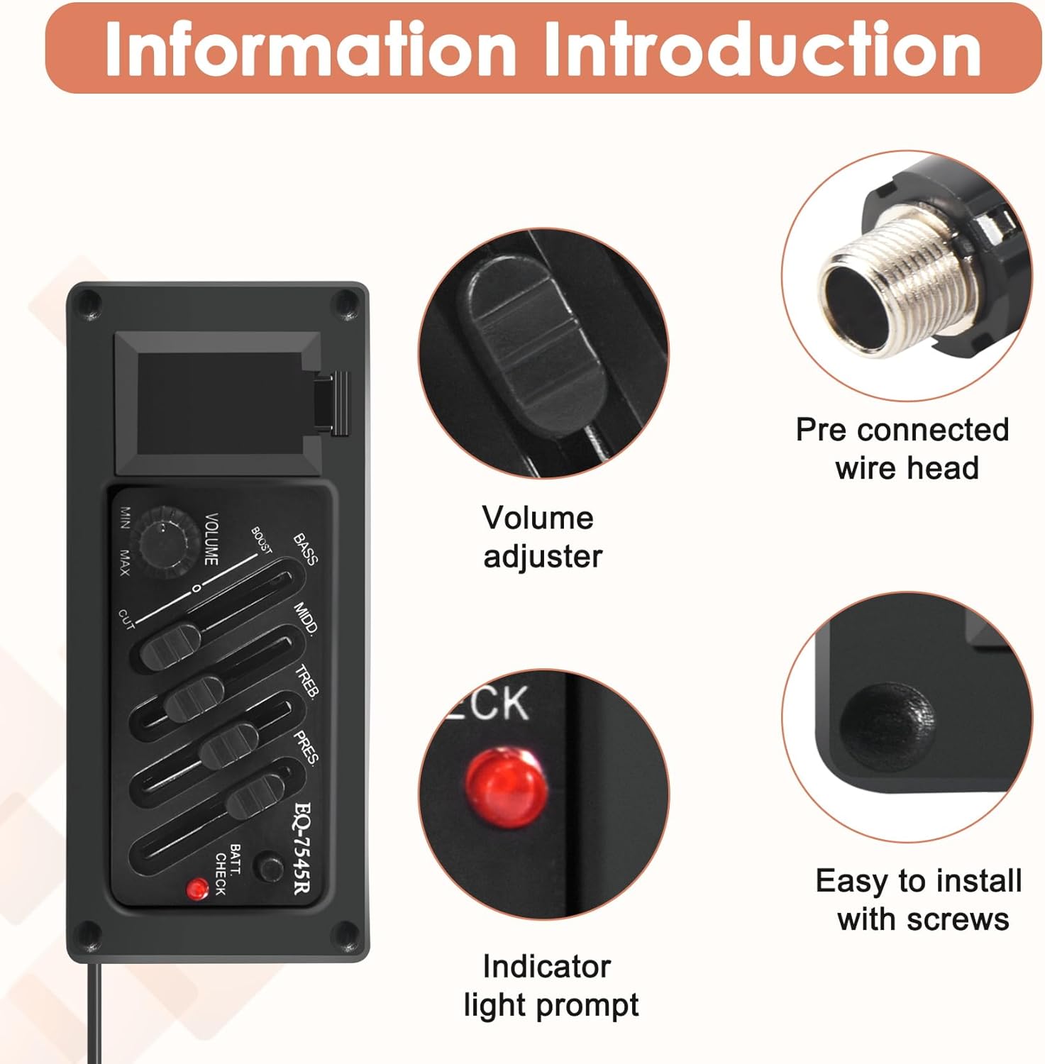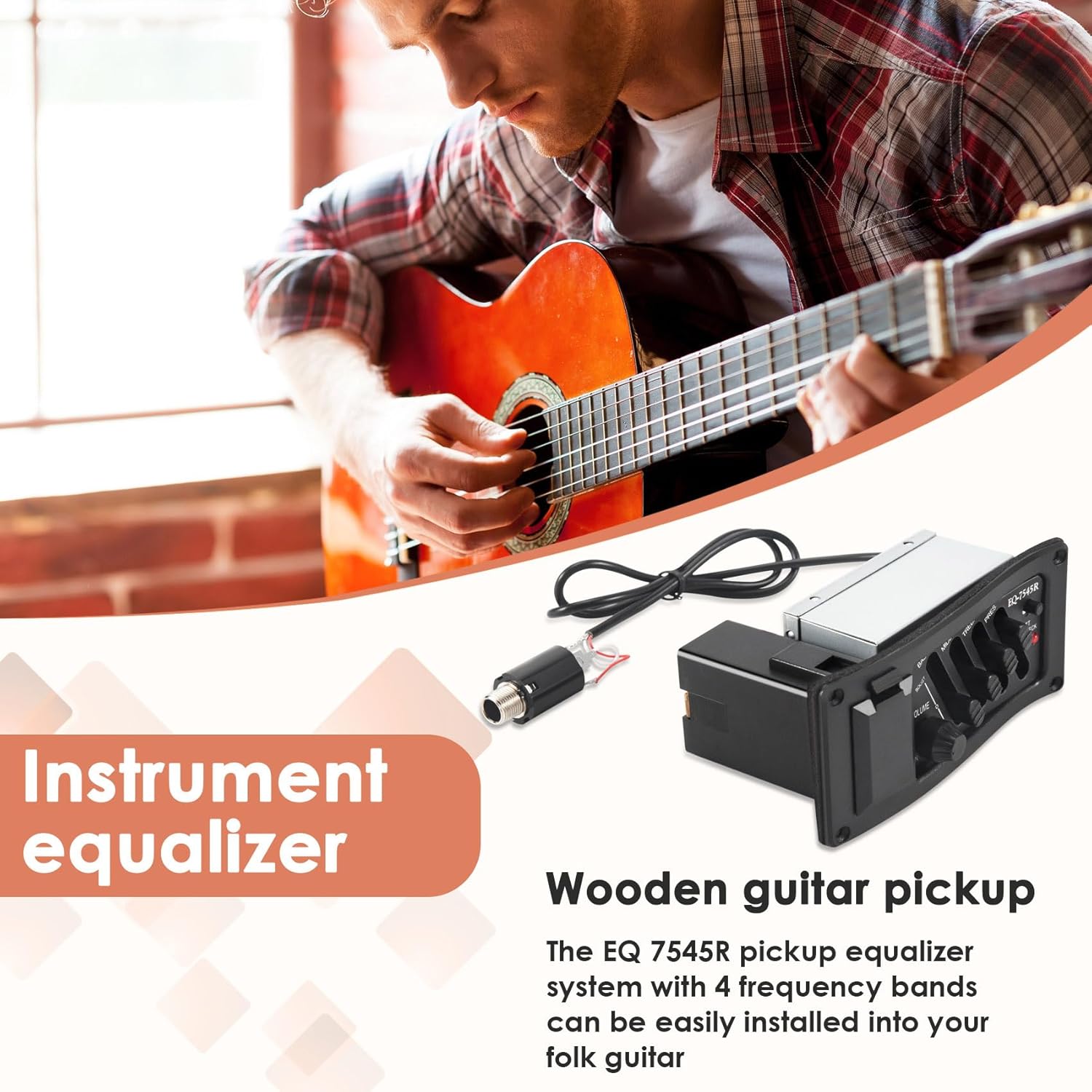 Pickup la per chitarra acustica. 4 bande più controllo del volume. Pre-cablato per un facile montaggio. Il di equalizzazione pick-up EQ 7545R con 4 bande può essere facilmente inserito nella tua chitarra acustica ed è per elettrificare e amplificare il loro suono. Fornito con una scatola della batteria, indicatore di batteria scarica.