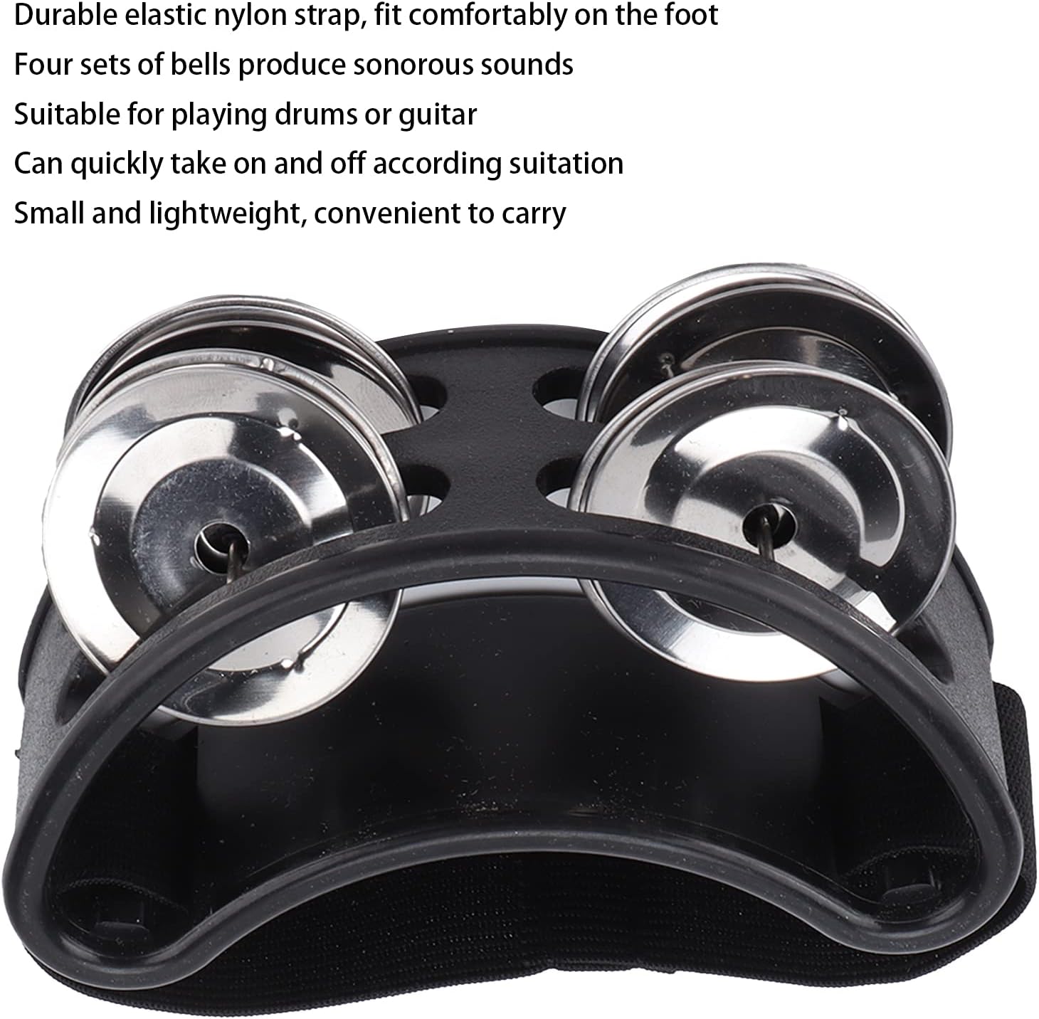 【Adatto per】I quattro set di campane producono suoni sonori, adatti per suonare la batteria o la chitarra o per accompagnare durante la lettura e il canto. 【Cinturino in nylon elastico】 Il cinturino in nylon elastico si adatta comodamente al piede, lo rende facile da indossare e da togliere a seconda della comodità. 【Dimensioni ridotte】 Dimensioni ridotte e peso leggero, comodo da trasportare e utilizzare in qualsiasi momento, molto comodo e pratico. 【Facile da usare】Basta scuotere i piedi, quindi il jingle luminoso e dolce è fatto, semplice e facile da usare. 【Suono brillante e brillante】 Il tamburello a pedale emette un suono leggero con il tocco del piede, un suono brillante e brillante.