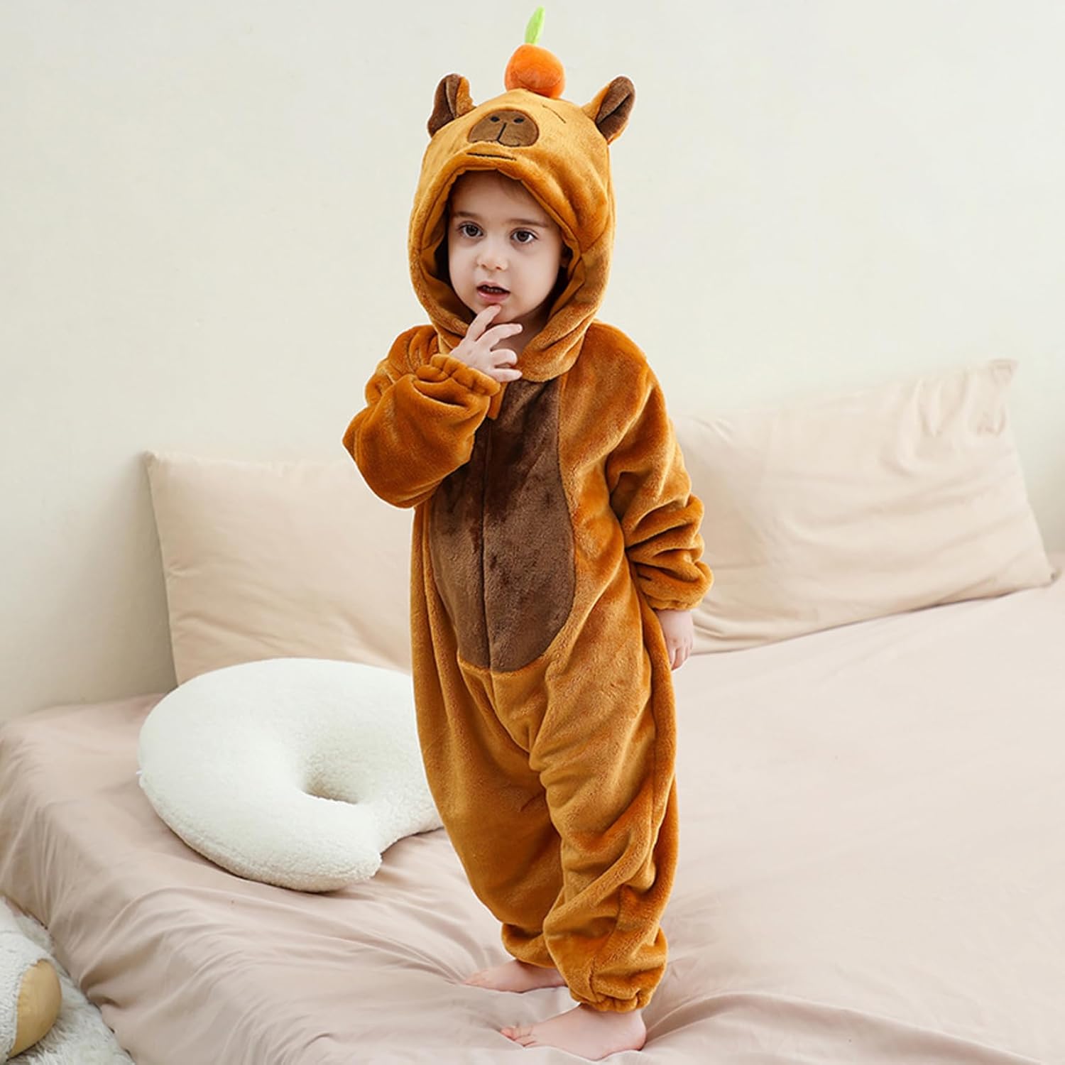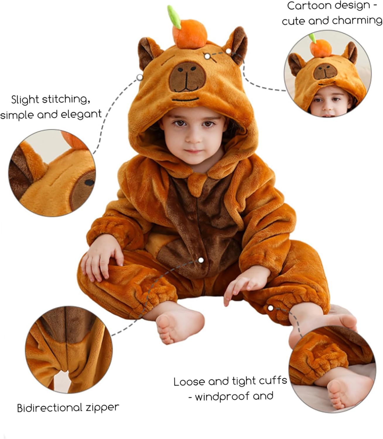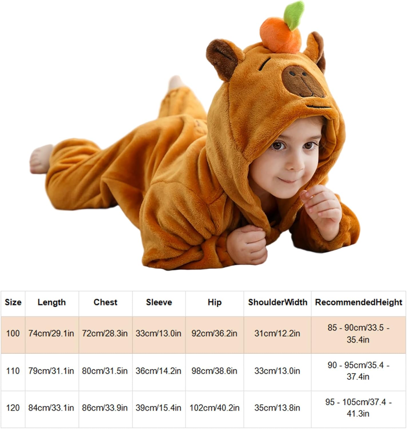 Tessuto stabile e sicuro: realizzato con materiali traspiranti e sicuri per i bambini che resistono a lavaggi frequenti mantenendo morbidezza e forma, garantendo un pigiama di lunga durata Morbida comodità in flanella: realizzata in materiale di flanella di alta qualità, questa tutina Capybara garantisce calore accogliente e delicata morbidezza, perfetta per mantenere i bambini comodi durante il sonno o il gioco Simpatico design capibara: presenta un adorabile e dettagliato cappuccio capibara che delizia i bambini e stimola l'immaginazione, ideale per feste a tema, abbigliamento casual per la casa o divertenti momenti fotografici Indossabilità e mobilità: progettato con una comoda cerniera e una vestibilità ampia per consentire la vestizione e il movimento senza restrizioni, supportando i bambini più attivi e i bambini che gattonano senza sforzo Occasione di utilizzo versatile: adatto a varie ambientazioni tra cui il pigiama, feste in costume o relax quotidiano, fondendo uno stile giocoso con una vestibilità pratica