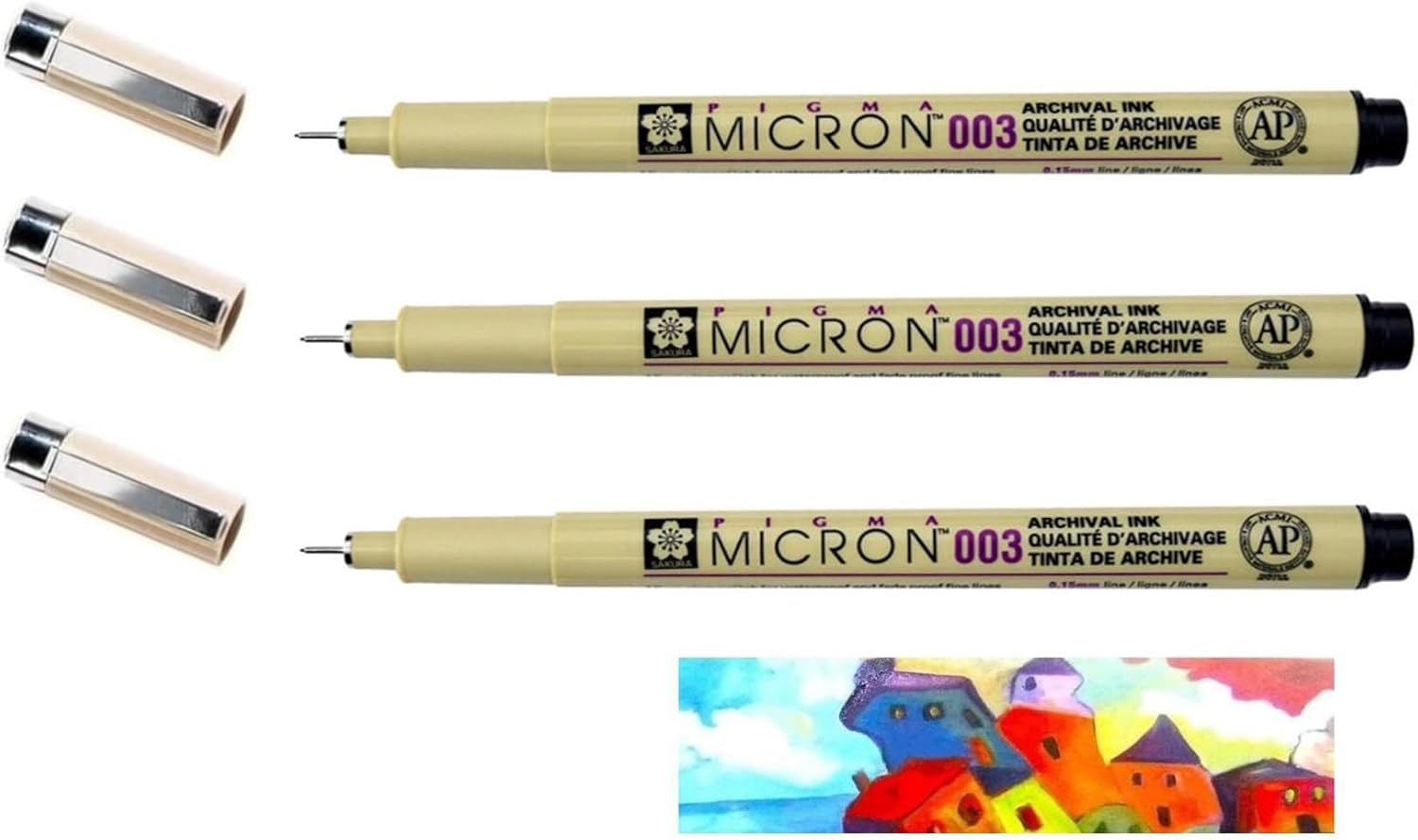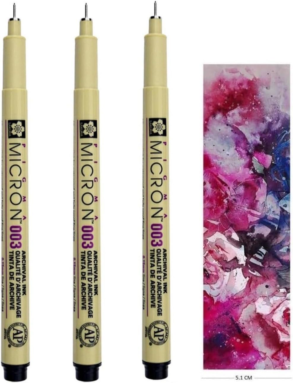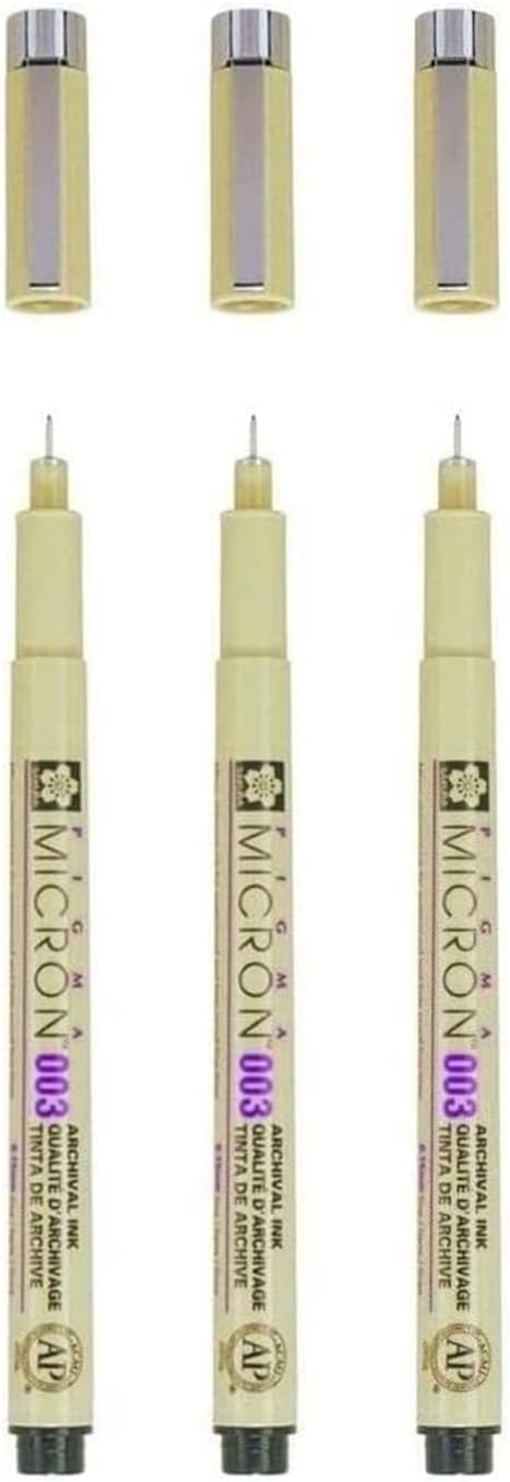 Pigma MICRON Sakura Black 003 - set di 3 pezzi e 1 carta Ideale per schizzo e disegno o miscelazione con acqua per servire acquerelli Ideale per l'uso su carta da livello ideale per progetti di casa e di lavoro micro pigmenti di inchiostro per impermeabile e dissolvenza a prova di linea e non pulire con carta L'inchiostro Pigma e gli inchiostri pigmentati a base d'acqua unici nel suo genere Sakura sono i primi al mondo a unirsi a entrambi, creando colori vivaci e non superiori a quelli della carta. L'inchiostro di alta qualità per l'archiviazione è anche a prova di documenti, resistente alla luce e dopo l'essiccazione a pH neutro.