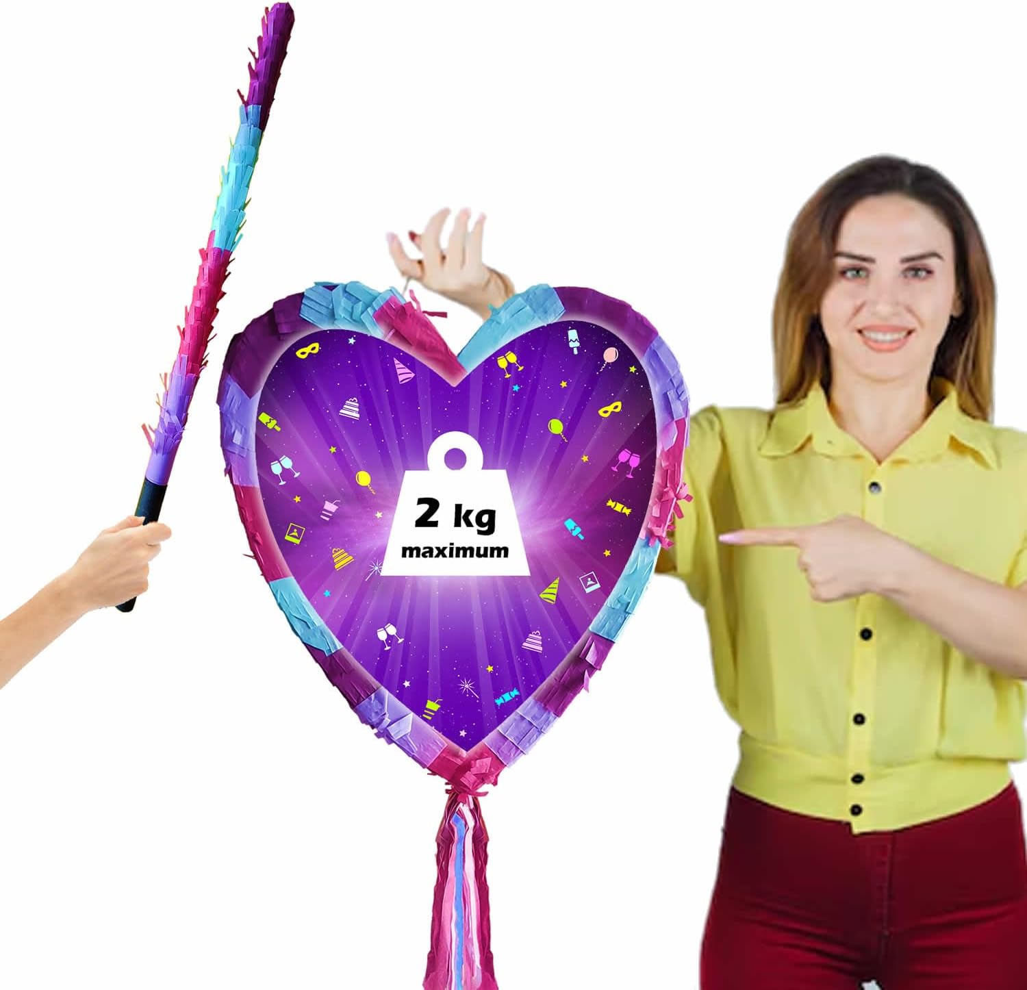 Questa pignatta a forma di cuore include un bastone e una benda abbinati. La pignatta è fatta di cartone e carta. Realizzato con colori perfetti da abbinare al tema delle feste da donna. rosa, viola e azzurro. La pignatta contiene una finestra per il riempimento. La pignatta è vuota e può essere riempita con dolci o mini sorprese. Peso di riempimento consigliato: 1-2 kg. La pignatta è alta 41 cm e larga 38 cm. È profondo 9 cm dai lati. Spazio sufficiente per aggiungere 1-2 kg di sorprese. Il bastone è lungo 50 cm ed è realizzato in materiale leggero. È facile da tenere e adatto anche per bambini e adulti. La benda è un ritaglio di carta o fatto di carta. È fatto per un uso una volta. Se i bambini indossano la benda, il gioco del colpo durerà più a lungo. Questa è una pignatta e un bastone è fornito per romperlo. La carta da appendere sotto la pignatta è a scopo decorativo. Si prega di notare che la carta da appendere o le nappe non sono cordini. Le foto mostrano la parte anteriore e posteriore della pignatta. Ogni lato ha un design leggermente diverso. Entrambi i lati mostreranno lo stesso testo in colori diversi. La pignatta è avvolta in un sacchetto di plastica. Sarà confezionato in una scatola di cartone resistente per arrivare in sicurezza.