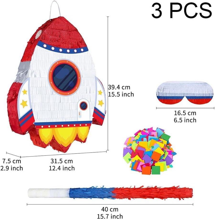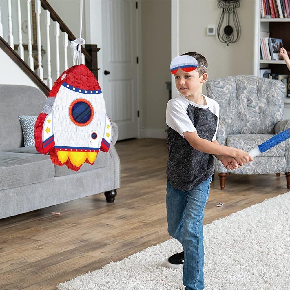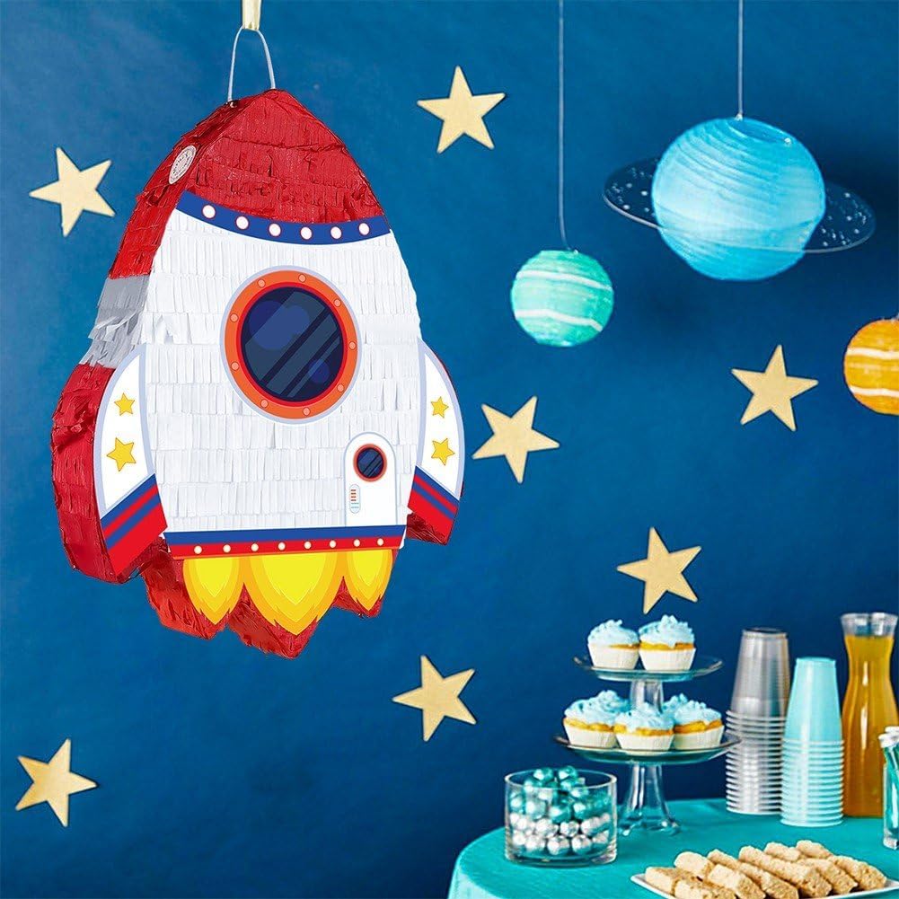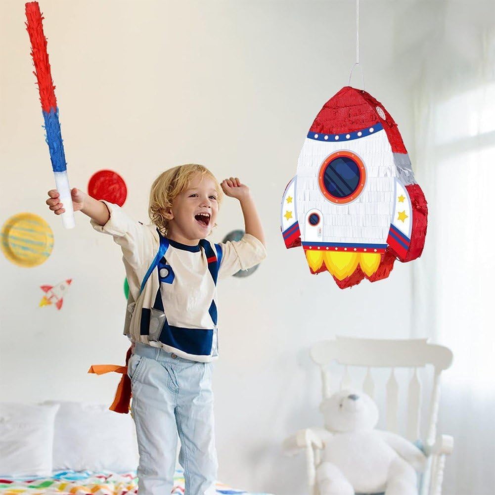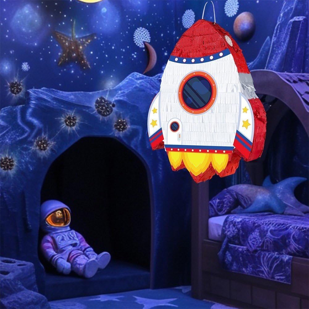 Costruzione durevole e sicura: realizzata con materiali di alta qualità, adatti bambini, abbastanza robusti contenere caramelle, piccoli giocattoli o dolcetti, garantendo bambini un gioco sicuro durante le feste. Decorazione versatile per feste: può essere utilizzata come decorazione sorprendente per feste a tema spaziale, compleanni o eventi speciali, migliorando l'atmosfera della festa sia appesa che posizionata come centrotavola. Design accattivante a forma di razzo: presenta un vivace e dettagliato razzo con dettagli a tema spaziale, che aggiunge immediatamente entusiasmo e un senso di avventura alle feste, perfetto per stimolare l'immaginazione dei bambini. Divertimento per tutte le età: ideale per feste di compleanno per bambini, eventi scolastici o incontri a tema spaziale, offre un'attività interattiva che intrattiene gli ospiti e crea momenti memorabili. Set completo per feste: include una piñata a forma di razzo insieme ad accessori essenziali come una benda e un bastone, fornendo tutto il necessario per un divertente gioco della piñata, risparmiando tempo sui preparativi della festa.