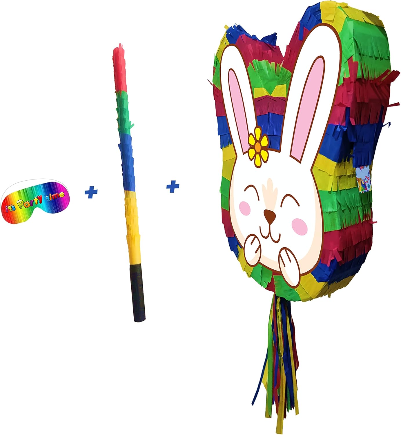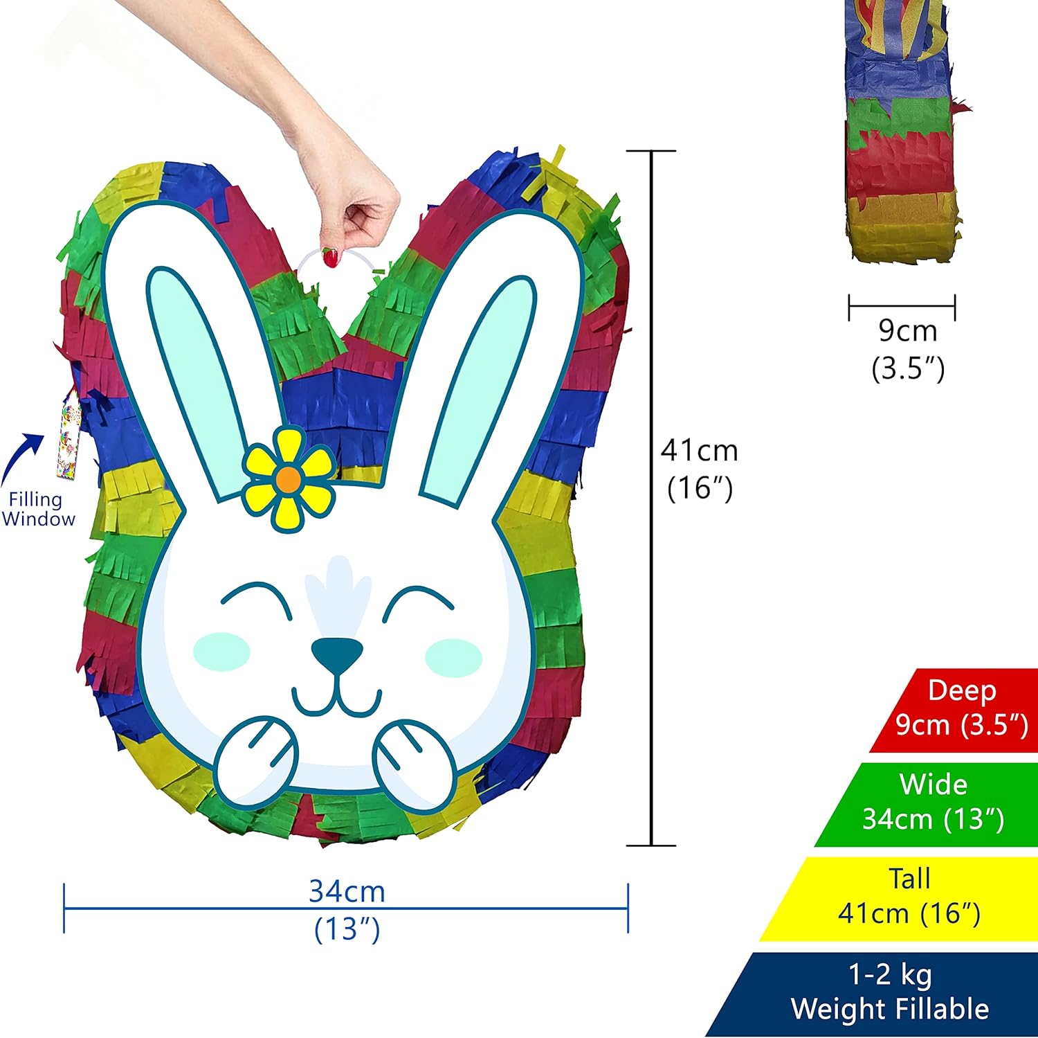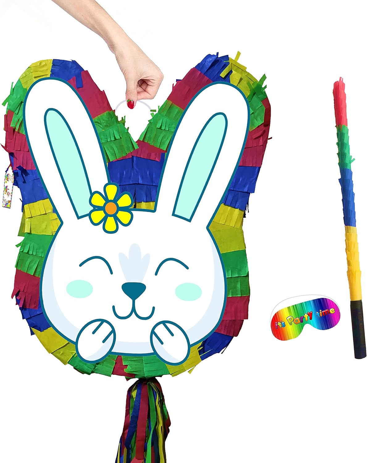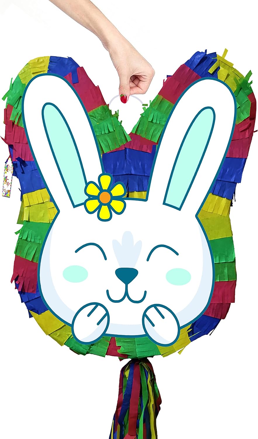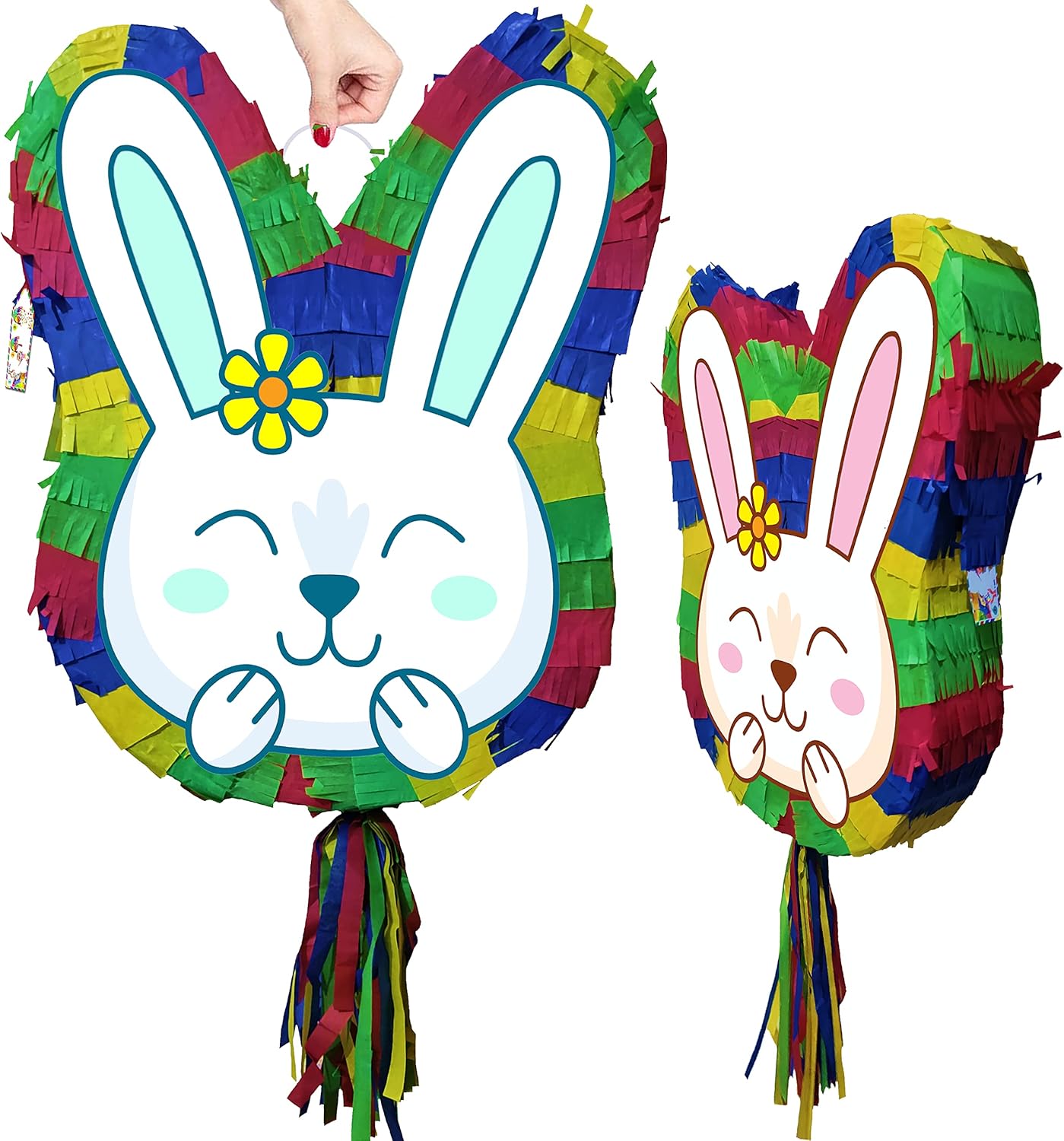 La piñata grande viene fornita con bastone e maschera di carta. La piñata include una finestra di riempimento e un anello di tenuta. Adatto sia a bambini che ad adulti. Unisex Lati piatti davanti e dietro con stampe uniche. Rosa, blu. Dimensioni sufficienti per contenere sorprese, caramelle o mini giocattoli da 1-2 kg. Ideale per giochi di società e divertimento Easer 2023. Consegnato in una scatola robusta. Decorazioni luminose a tema multicolor.