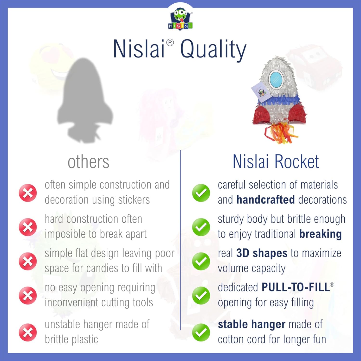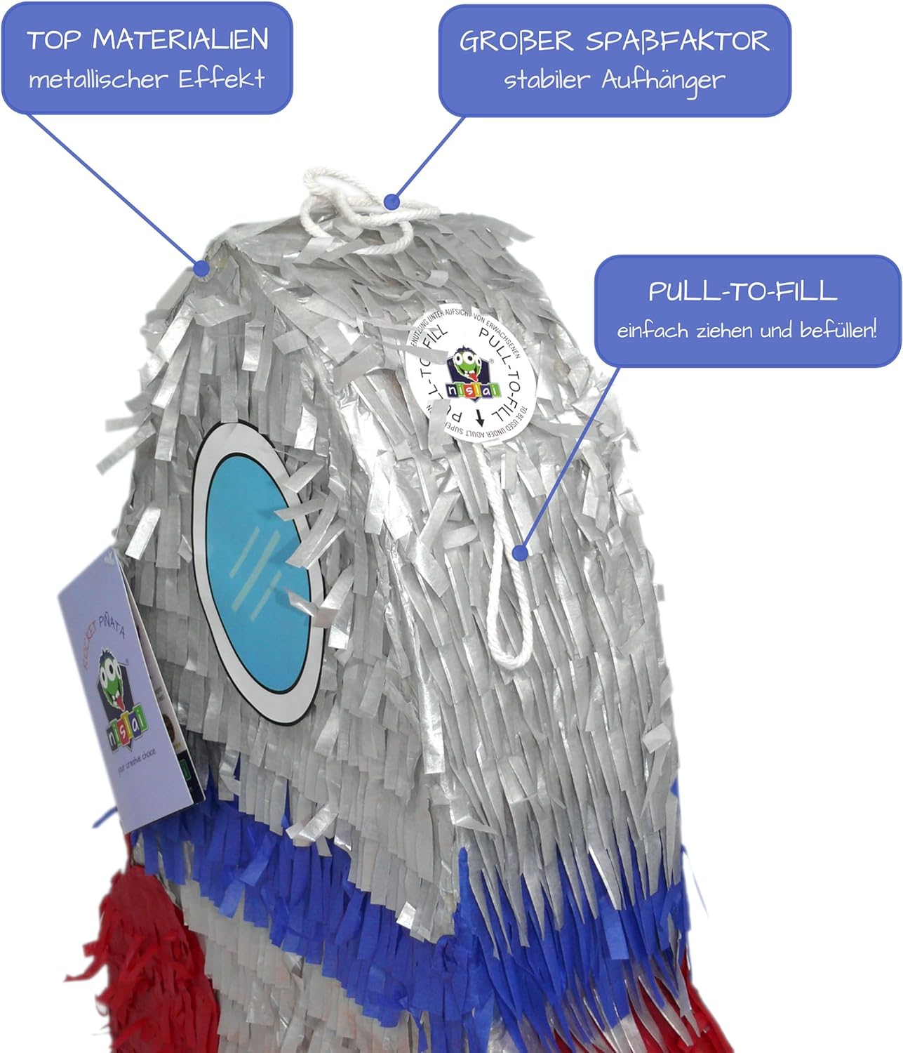 Ideale per feste spaziali: la Rocket Pinata è adatta sia a bambini che ad adulti e porta l'atmosfera perfetta alla tua festa. È progettata per tutti i momenti indimenticabili e, grazie al suo affascinante carisma, un'esperienza felice. Facile da riempire: grazie al nostro sistema PULL-TO-FILL, potrai riempire facilmente il nostro razzo Pinata in pochi secondi con grandi sorprese (giocattoli e/o caramelle - non inclusi nell'offerta). Nota: l'apertura è sul retro. Ideale per picchiare: ogni ospite o bambino bendato può colpire brevemente la piñata (massimo 3 volte). Se le sorprese non cadono a terra, lascia che ci provi il prossimo ospite. Ripeti il processo finché un ospite o il padrone di casa non riesce finalmente a rompere la piñata. Grande fattore divertente: sperimenta il modo tradizionale di rompere una piñata come se fossi in Messico. Con una corda robusta, la tua piñata rimane sospesa finché non la rompi e le tue fantastiche sorprese saranno sparse su tutto il pavimento. La filosofia NISLAI: ogni prodotto del nostro portfolio è accuratamente testato per garantirti un'esperienza unica. E poiché ci siamo impegnati a trovare la migliore combinazione di colori e materiali, puoi essere certo che abbiamo realizzato per te il miglior prodotto di sempre