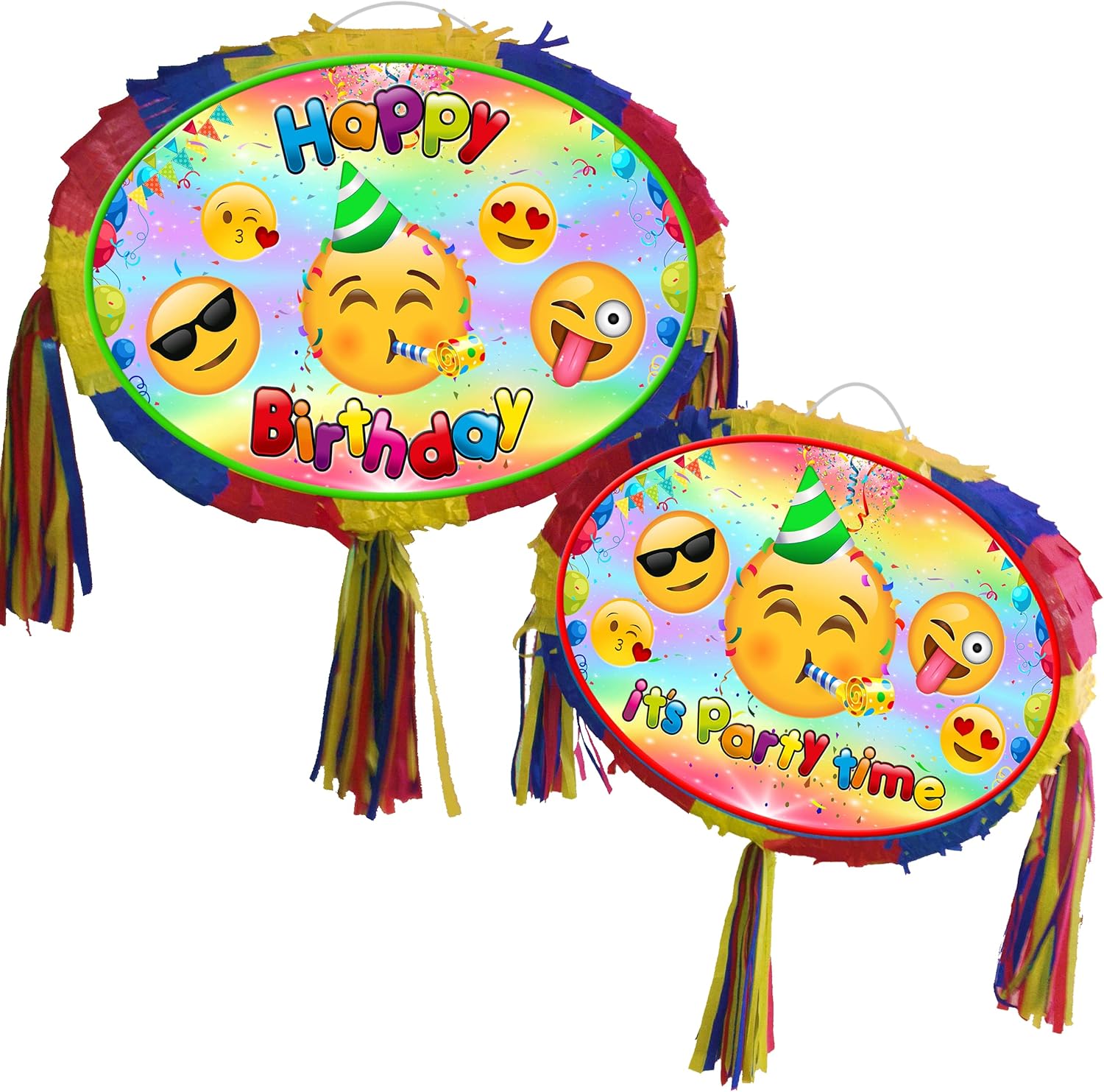 La piñata include un bastone e una fascia di carta. La piñata contiene una finestra di riempimento e un anello di tenuta. Adatto sia a bambini che ad adulti. Unisex. La piñata sarà vuota. È di grandi dimensioni e può essere riempito con 1-2 kg di roba. Buon compleanno da un lato ed è tempo di festeggiamenti dall'altro. Design emoji colorato e accattivante. La piñata è di forma ovale e piatta davanti e dietro.