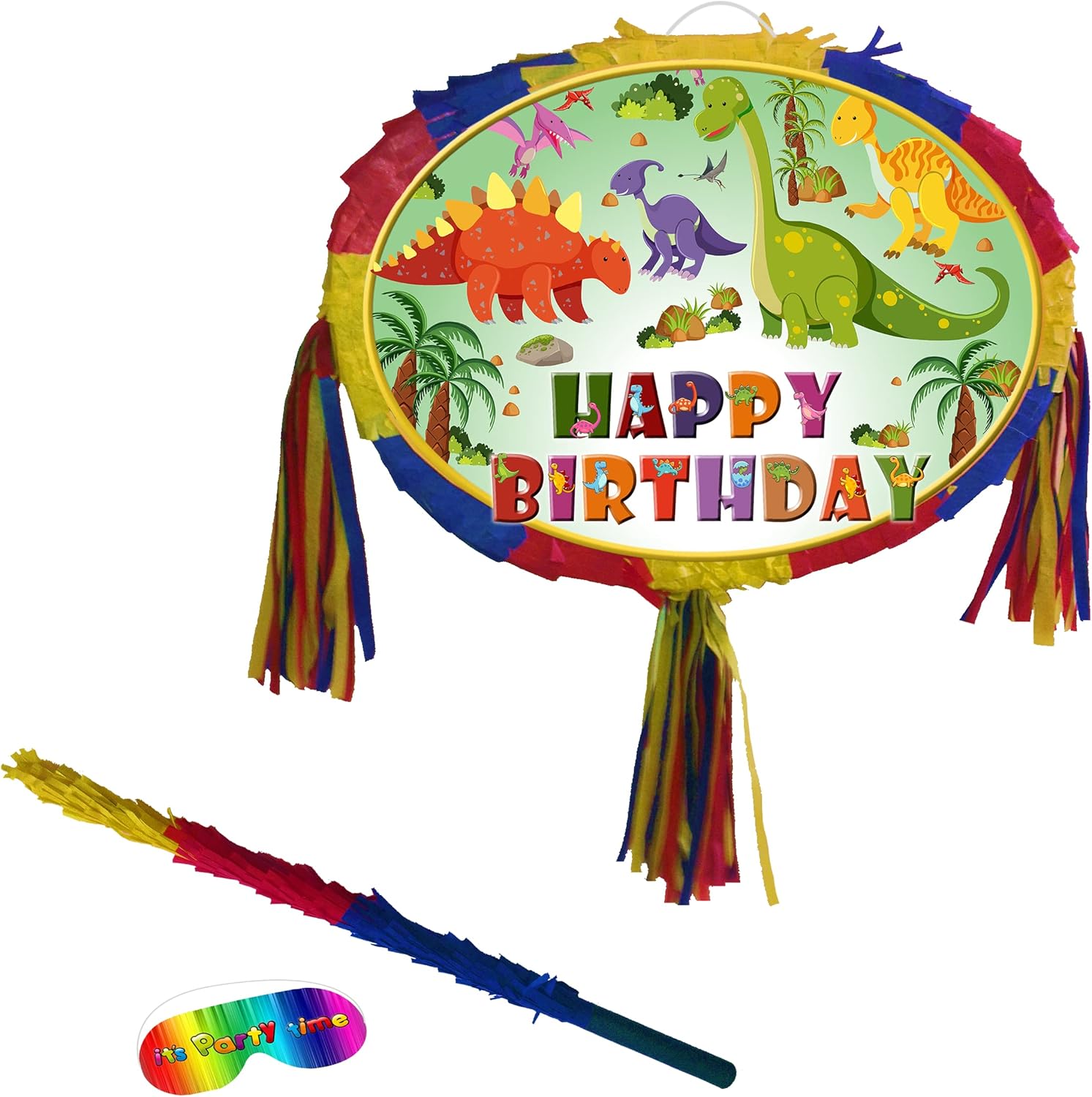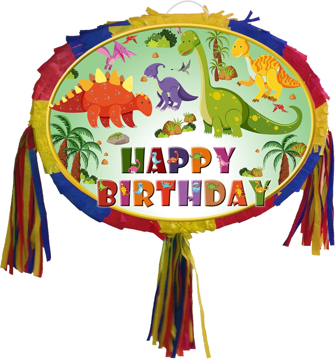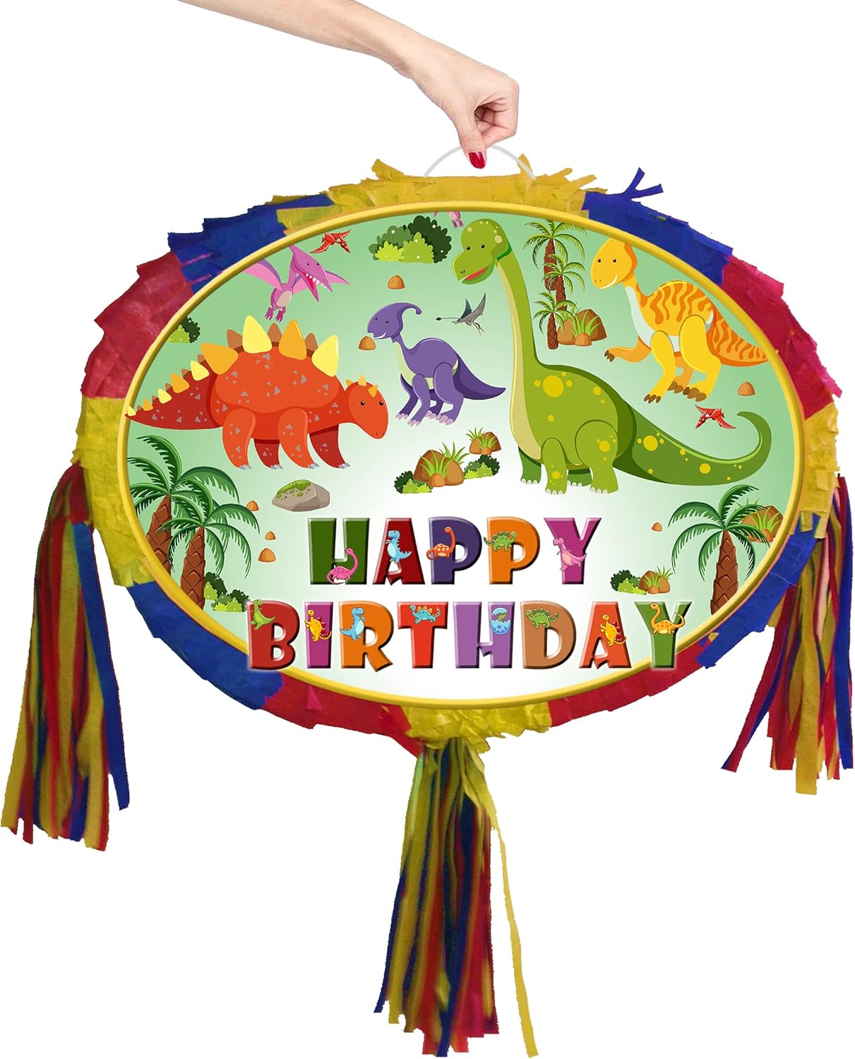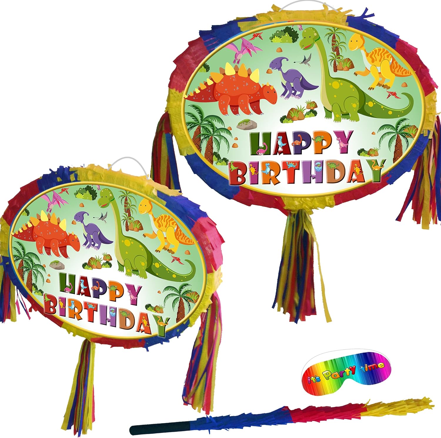 La pinata viene fornita con un bastone e una maschera di carta. La piñata include una finestra di riempimento e un anello di tenuta. Adatto sia a bambini che ad adulti. Taglia grande unisex, può contenere oggetti da 1-2 kg. Tema dinosauro con buon compleanno. Design colorato e accattivante.