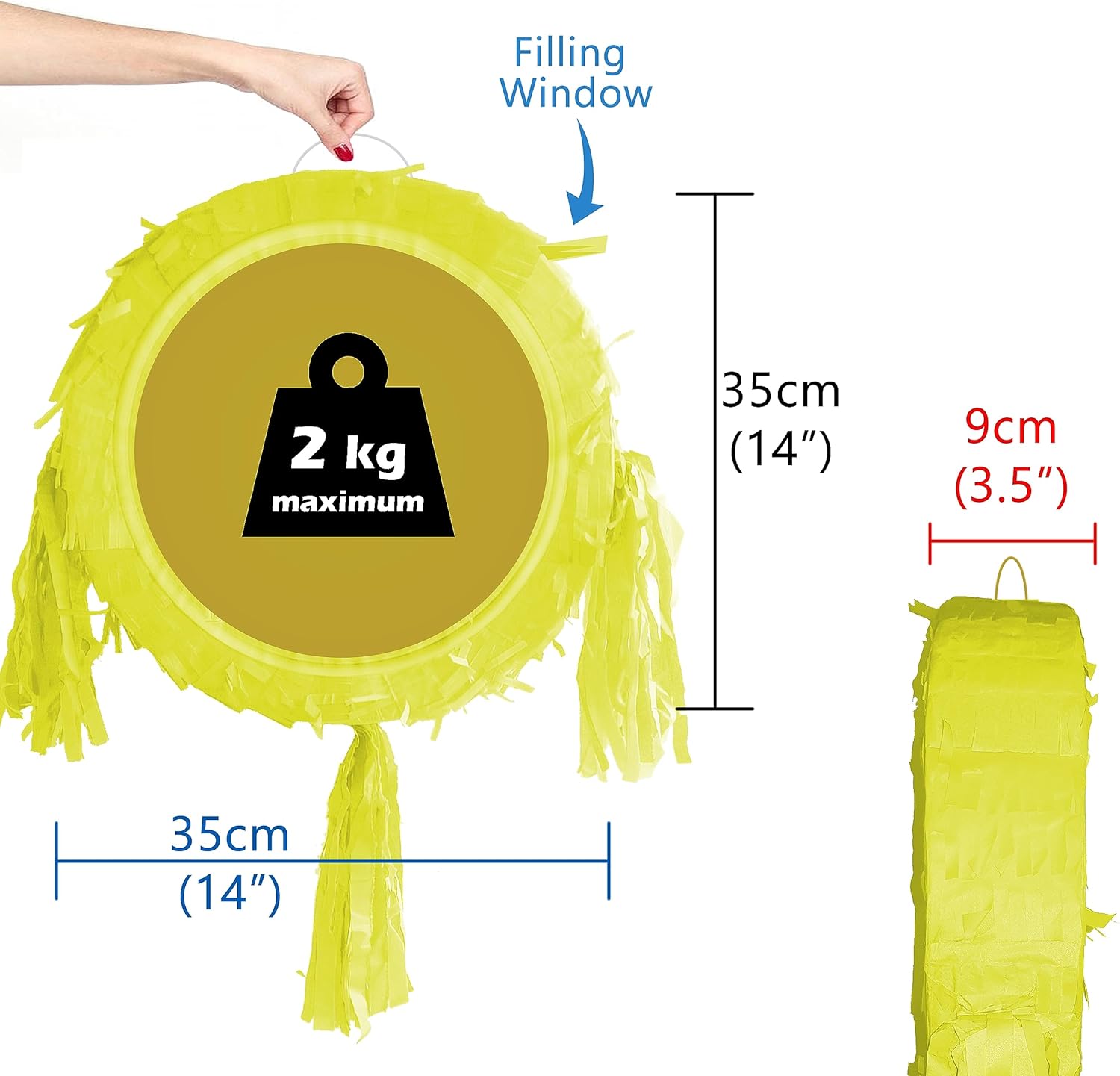 La pinata viene fornita con rilegatura in stick e carta. Pinata include finestra di riempimento e cinturino o cinturino. La Pinata è vuota e può essere facilmente riempita con 1-2 kg di caramelle o mini giocattoli. Adatto sia a bambini che ad adulti. Unisex Sarà imballato in un sacchetto di plastica e imballato in un cartone resistente. Pinata rotonda con due lati piatti. Ogni pagina con stampa. Le foto del display mostrano la parte anteriore e posteriore della pinata. Perfetto per qualsiasi evento. Festa di nascita di qualsiasi età o sesso.