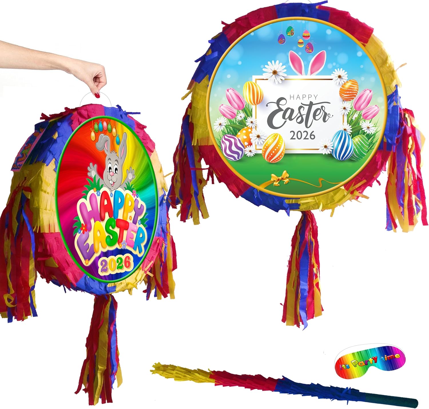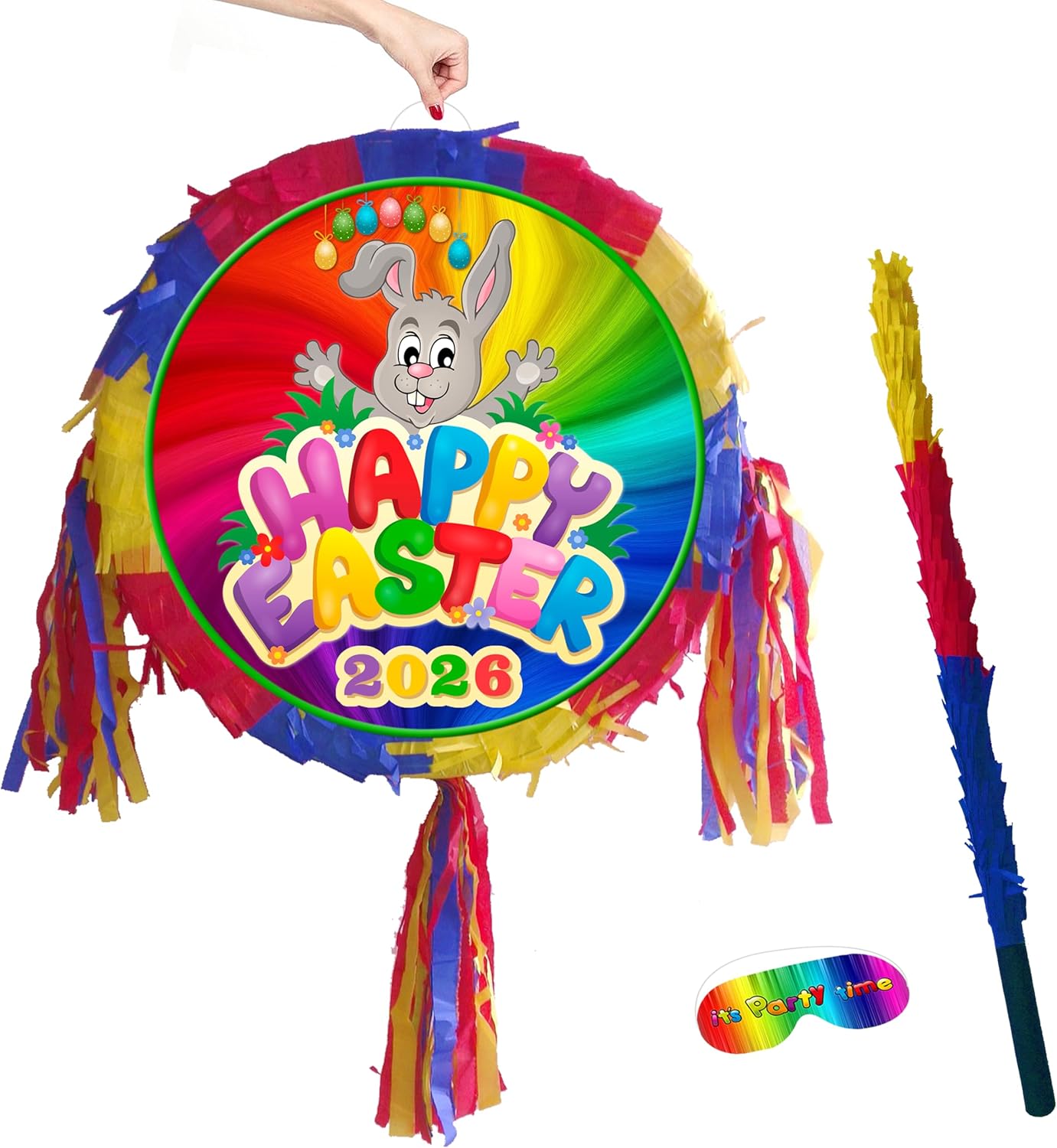 La pinata viene fornita con bastone e maschera di carta. La piñata include finestra di riempimento e cinghia. Adatto sia a bambini che ad adulti. Parte anteriore unisex, lati piatti posteriori con stampe uniche Dimensioni sufficienti per riempire con sorprese da 1-2 kg Ideale per giochi di società e divertimento Easer 2023 Viene fornito in una scatola robusta
